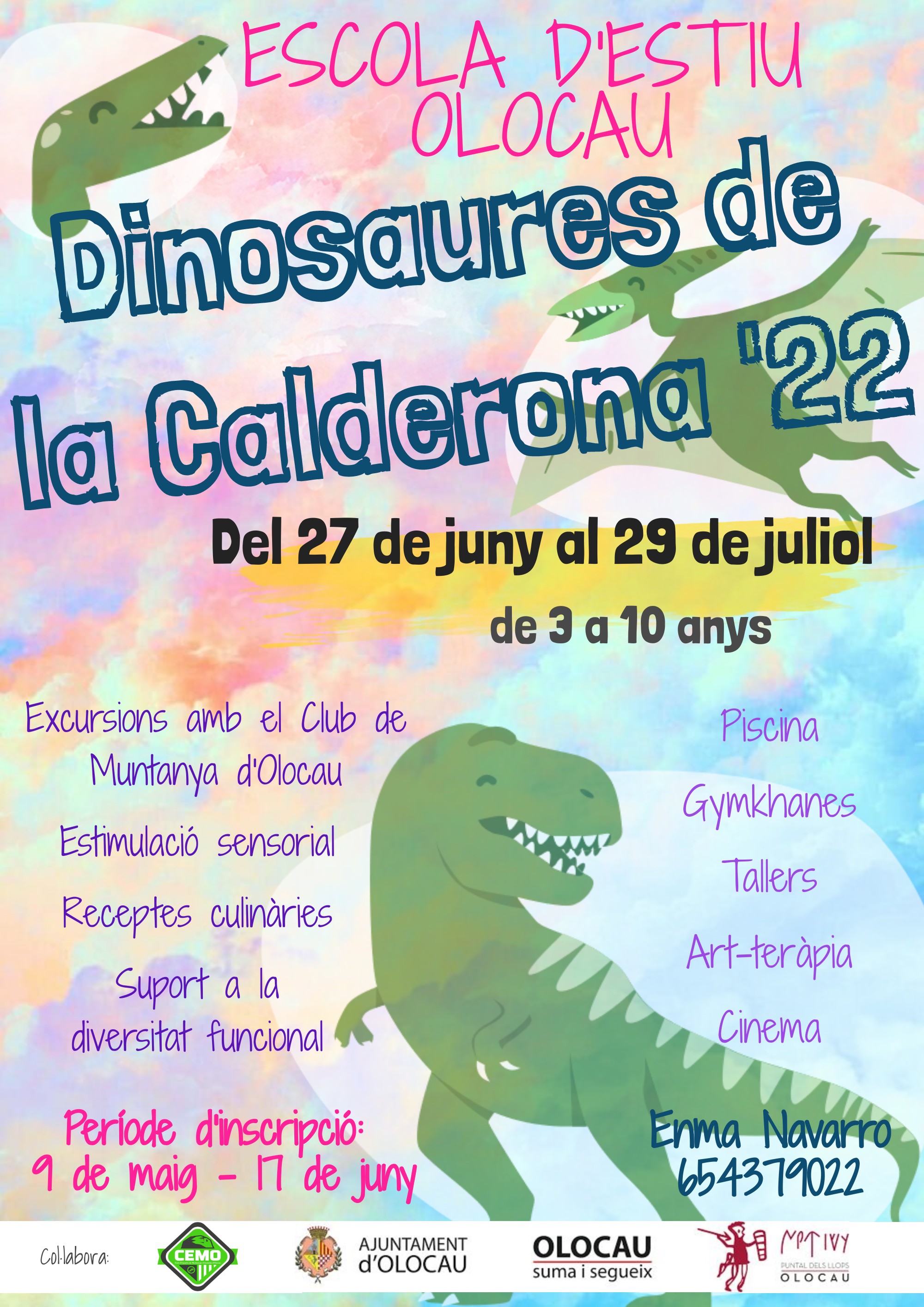 Por su parte, la propuesta Escola d’Estiu - Dinosaures de la Calderona (clic aquí para ver el cartel), organizada por Enma Navarro, pone el énfasis en el descubrimiento y la aventura desde un punto de vista inclusivo aprovechando el entorno natural de nuestro pueblo. En este sentido, se busca potenciar la estimulación sensorial y la socialización de niñas y niños, así como experimentar y jugar mediante la realización de diferentes actividades, juegos, talleres y excursiones.
