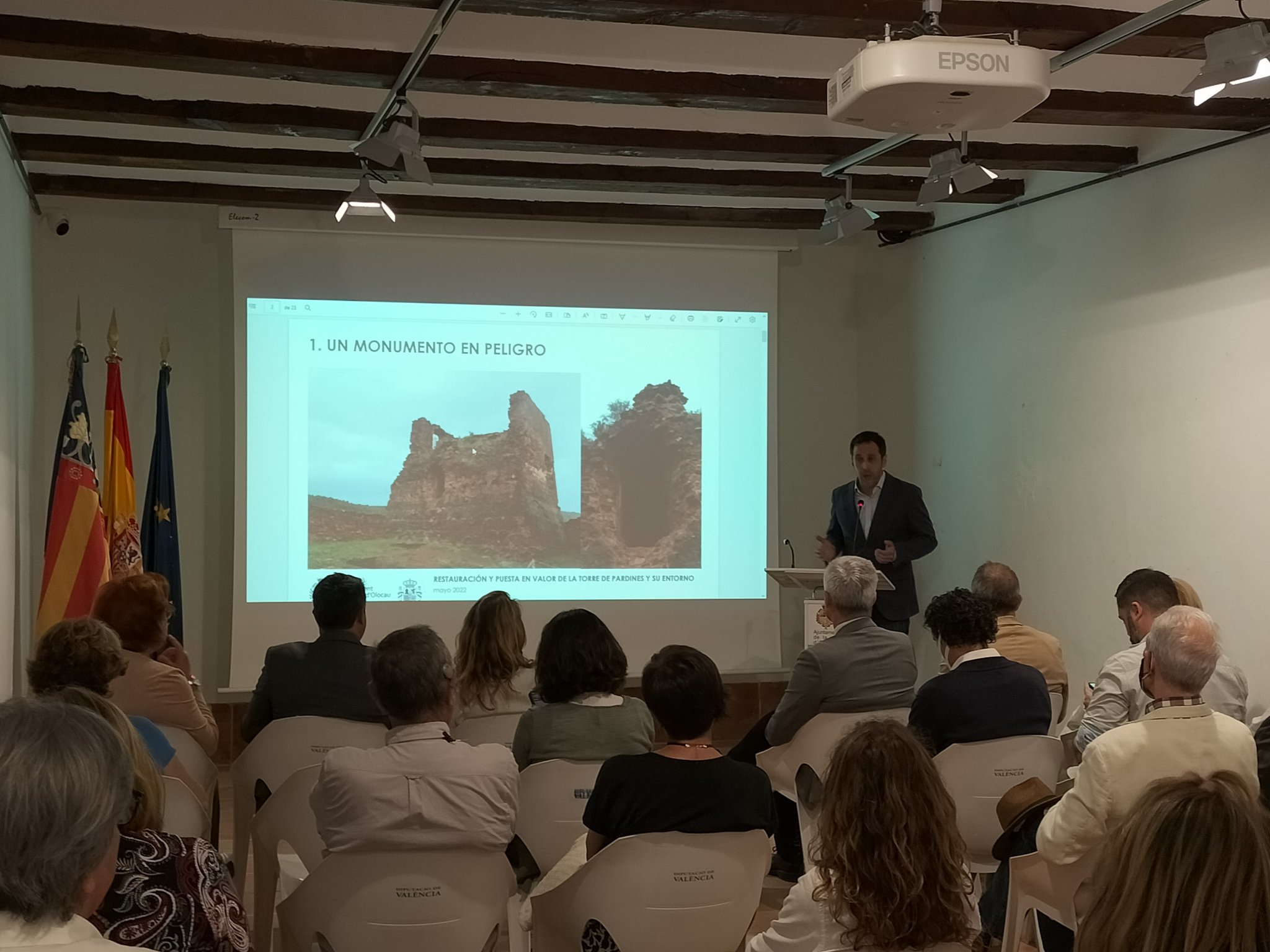 Tras ello, los invitados han sido guiados a la Casa de la Senyoria. En el antiguo granero y futura sala museística, se ha proyectado un vídeo grabado con dron de las distintas fases de la actuación realizada en la Torre de Pardines. Posteriormente, Francisco Blay (arqueólogo) y Vicente Calabuig (arquitecto) han explicado el proceso que se ha llevado a cabo, así como las diferentes intervenciones que se han ejecutado en zonas interiores y exteriores y en los niveles del edificio. Unos trabajos centrados en el acondicionamiento, la conservación y la restauración del complejo.