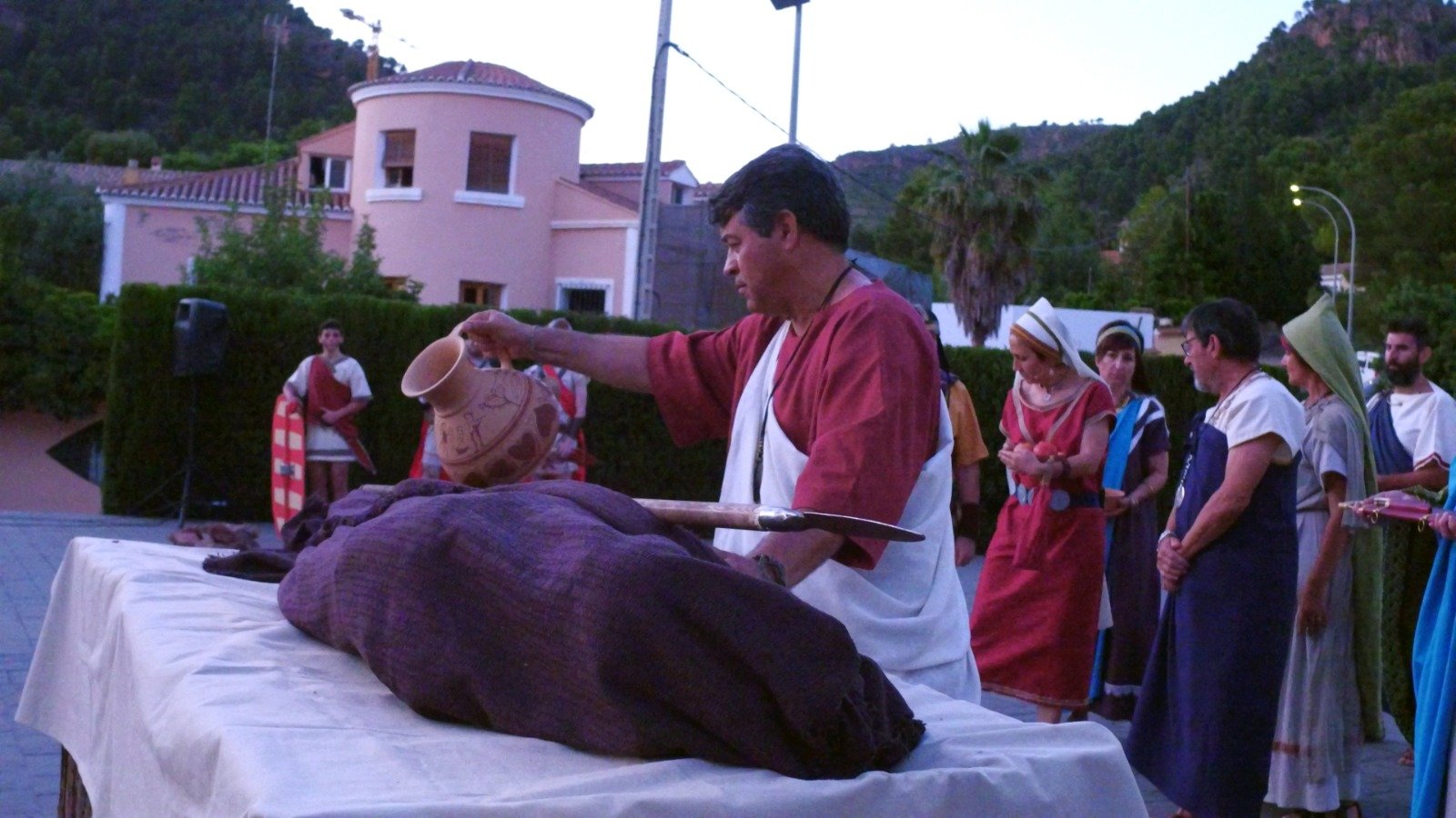 Por la tarde, se representó el ritual funerario del guerrero íbero, tras haber acabado los romanos con su vida. El cortejo partió de la Plaza y recorrió la Calle Mayor mediante una marcha fúnebre con música solemne y antorchas en la que familiares y amigos acompañaron el cuerpo sin vida de Nauiba. Un acto triste de despedida que culminó en el Auditorio de L’Arquet, donde se realizó la incineración del cuerpo. De esta manera, finalizaban las recreaciones históricas del sábado.
