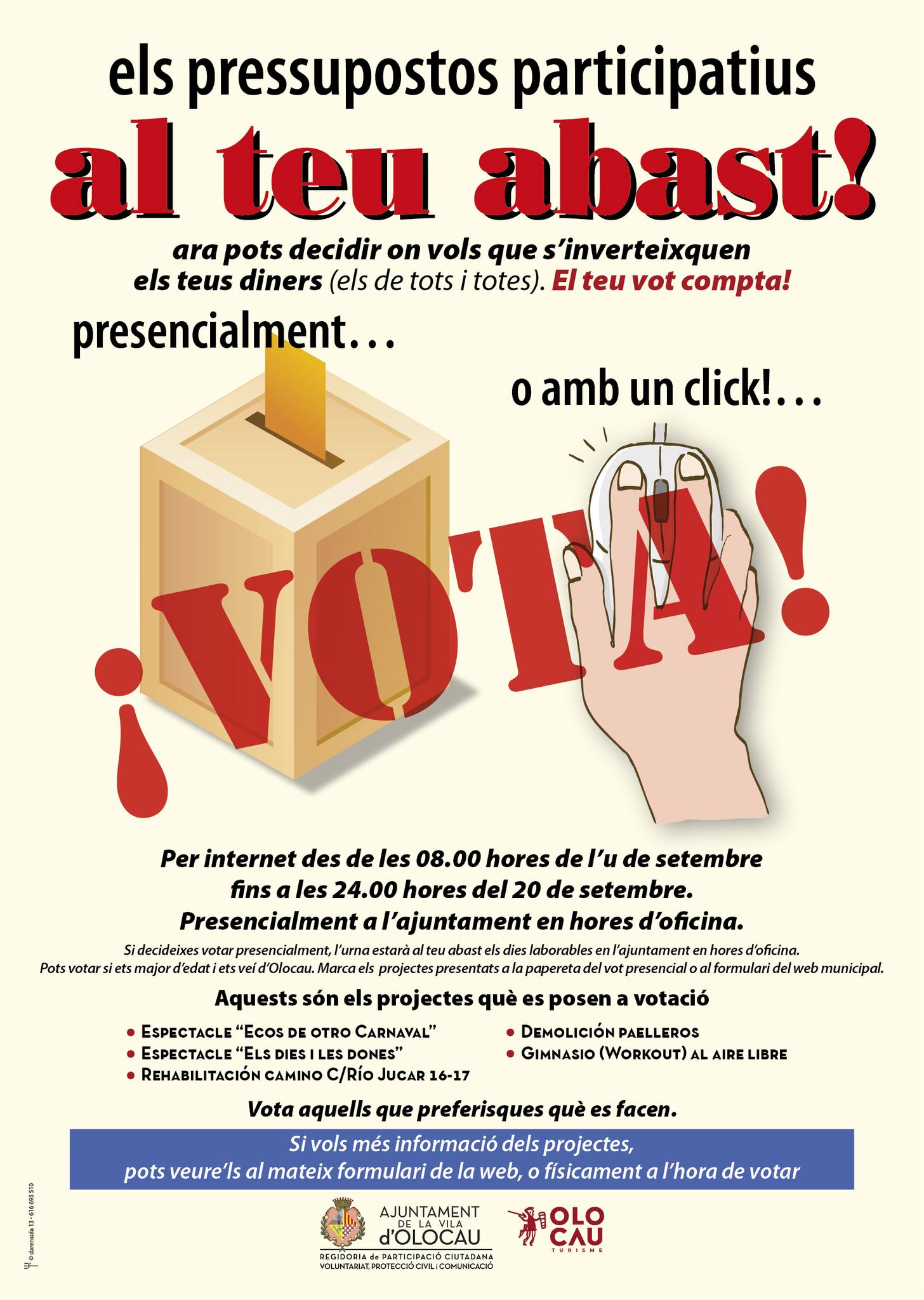 Desde el Ayuntamiento de la Villa de Olocau, recordamos que el plazo de votación para los Premios Nauiba (clic aquí para ampliar el cartel) y los Presupuestos Participativos (clic aquí para ver el cartel) sigue abierto y finalizará el próximo día 20 de septiembre. Se puede realizar de manera telemática o presencial en el Ayuntamiento (es necesario ser mayor de edad y vecino/a de Olocau). En ambos casos, en el momento de votar, se puede consultar la información relativa a las opciones propuestas.