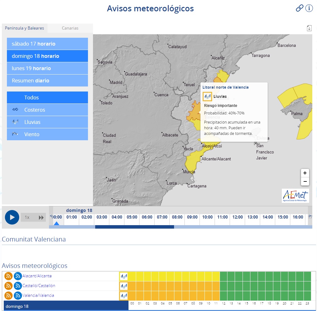 El Ayuntamiento de la Villa de Olocau informa de que el Centro de Coordinación de Emergencias de la Generalitat ha establecido para la jornada de hoy la preemergencia por lluvias en nivel naranja en la zona en la que se encuentra nuestro municipio, el litoral norte de la provincia de Valencia (clic aquí para ver el aviso). Por su parte, la Agencia Estatal de Meteorología (AEMET) concreta que, entre las 20 y las 23:59 horas, la precipitación acumulada en una hora podría llegar a los 30 litros por metro cuadrado (30 milímetros) e incluso, de forma local, podría alcanzar los 40 litros por metro cuadrado (40 milímetros). Todo ello, además, con la posibilidad de que vaya acompañada de tormenta (clic aquí para ampliar).