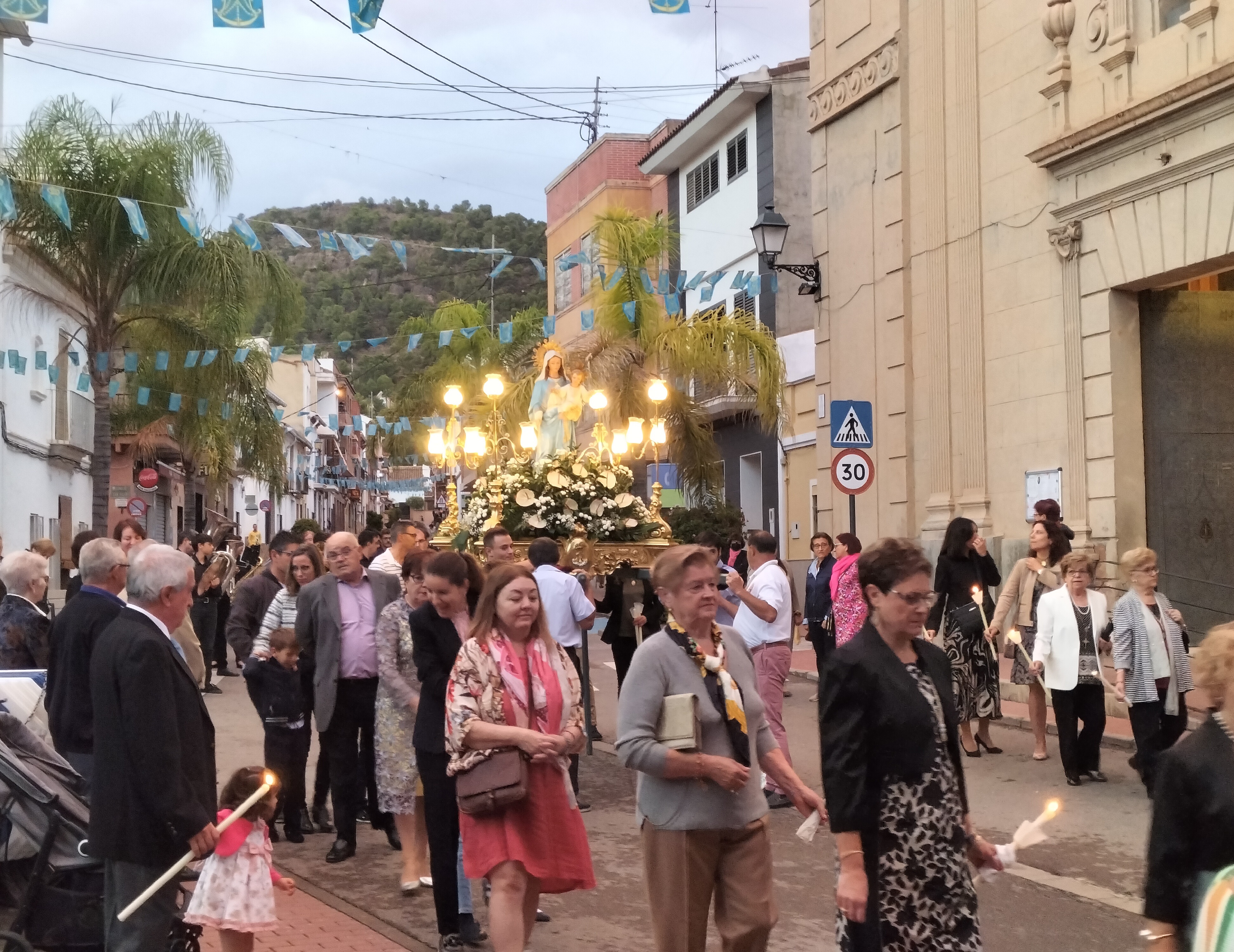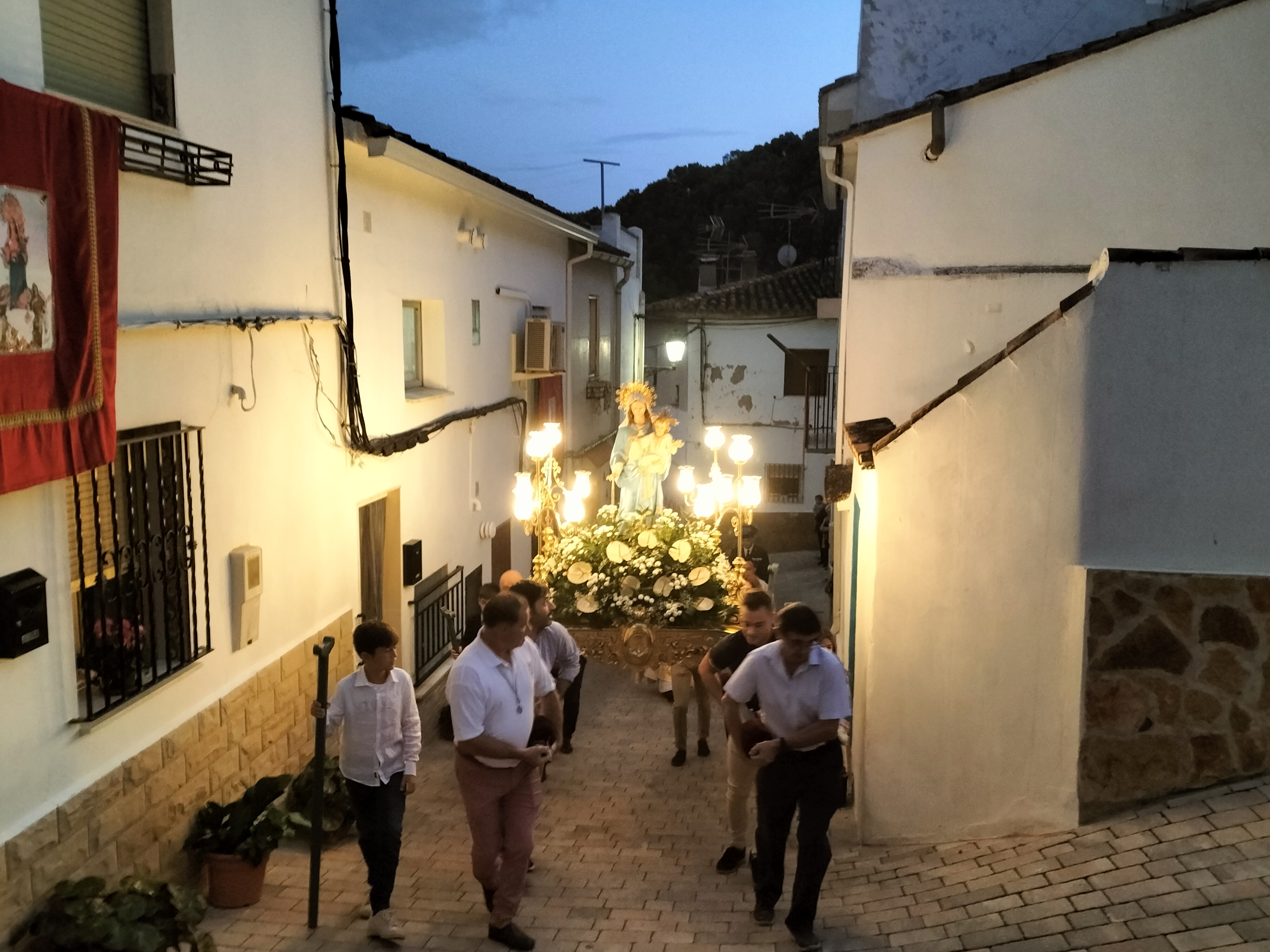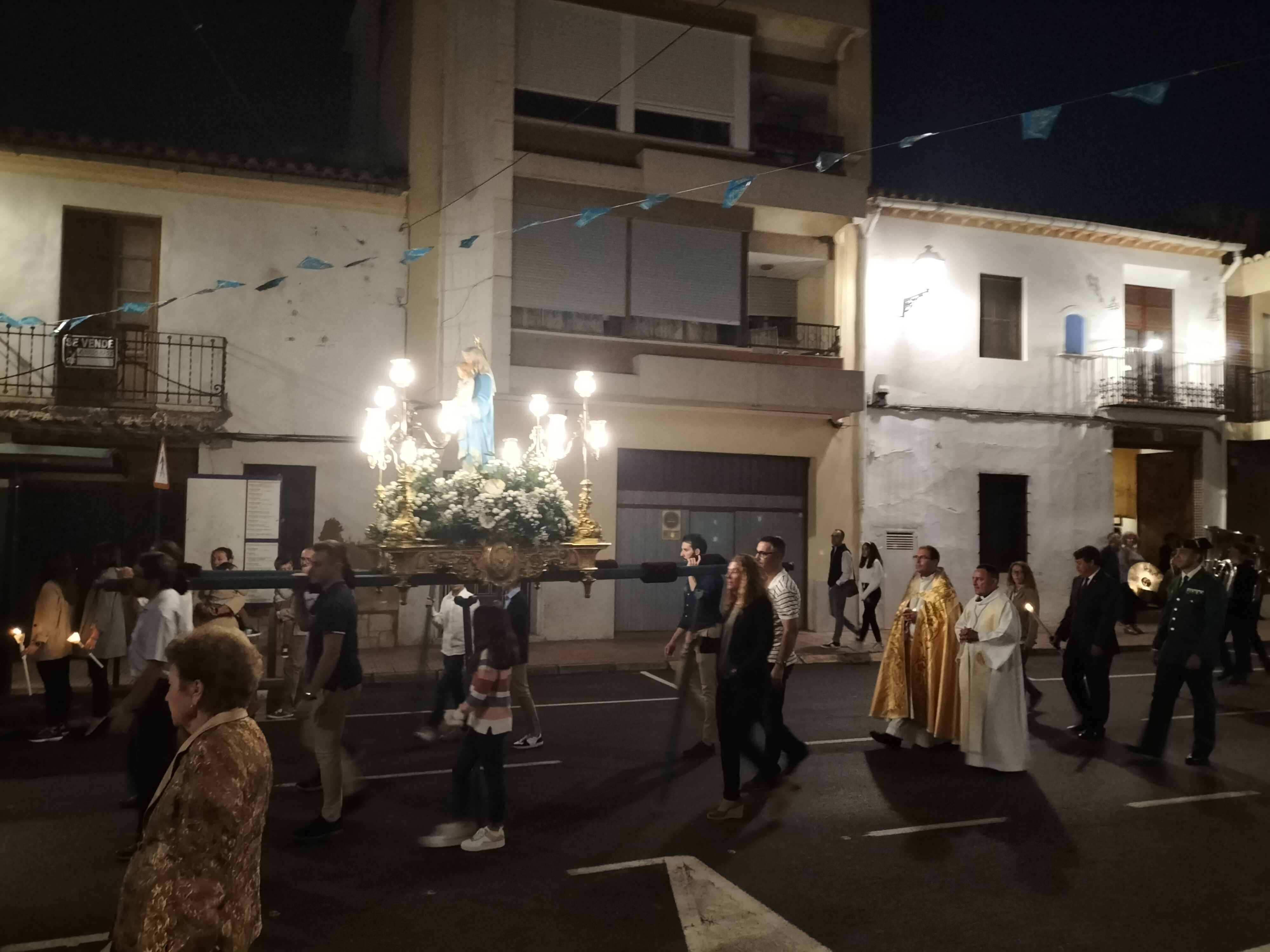 El recorrido por las calles del municipio estuvo marcado por el respeto y la solemnidad que siempre caracterizan al acto central de las fiestas. En este sentido, la iluminación de los cirios y la música interpretada por la banda de ‘La Melodía’ crearon un marco incomparable. Además, a medida que avanzaba el cortejo, se fueron sumado más personas que también deseaban acompañar a la Virgen y mostrarle el cariño y el aprecio que sienten hacia ella.