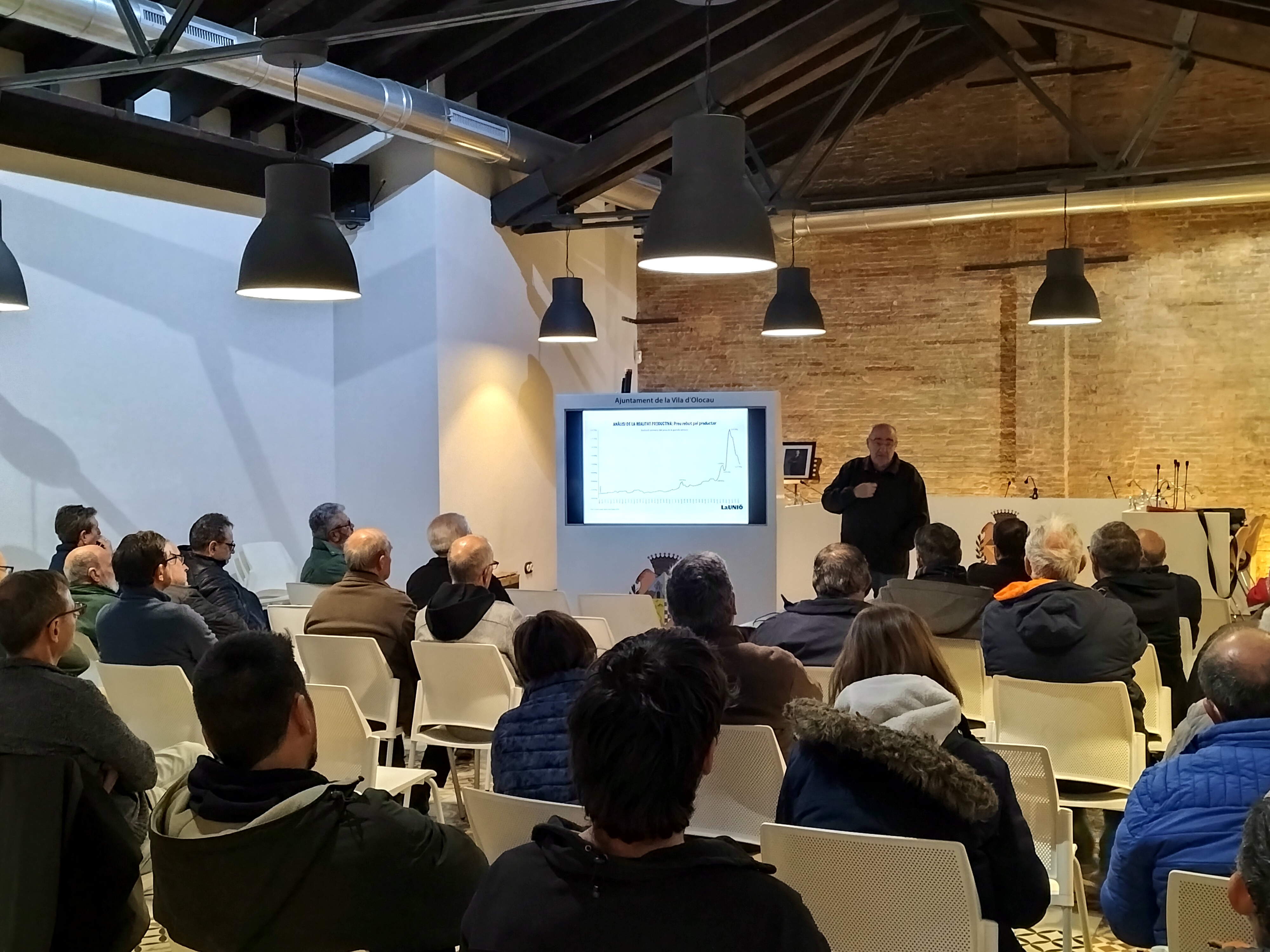 Tras la bienvenida al acto realizada por Fabregat y el primer edil de Olocau, Gregori comenzó con su exposición hablando de la distribución de la superficie de algarrobos a nivel internacional, estatal, autonómico y comarcal, y mostró cómo la Comunidad Valenciana posee la mayor concentración de árboles de esta especie del mundo.