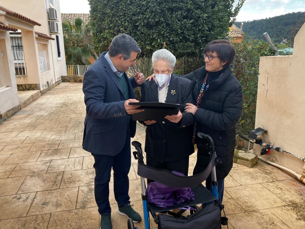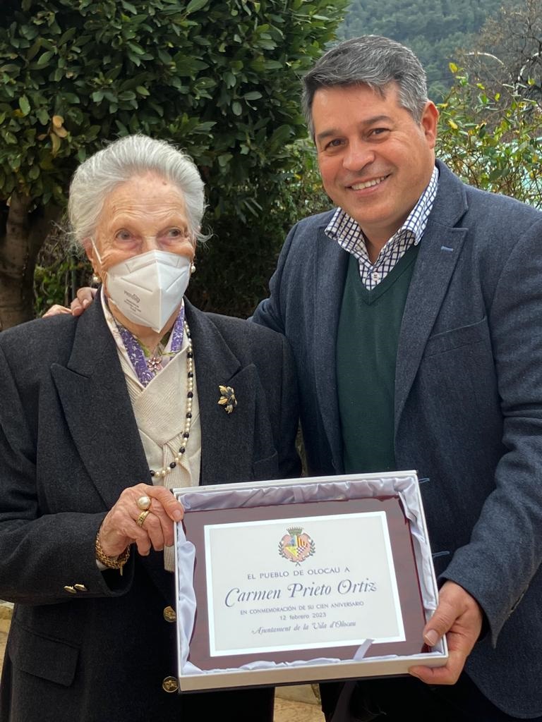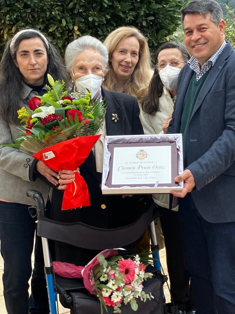 Ayer, nuestra vecina Carmen Prieto Ortiz cumplió 100 años, una celebración muy especial para ella y para su familia. Por ello, el alcalde, Antonio Ropero, y la concejala de Servicios Sociales, Olga Brínquez, quisieron estar presentes en un día tan importante y transmitir a Carmen la felicitación de la Corporación Municipal y de los vecinos y vecinas de Olocau.
