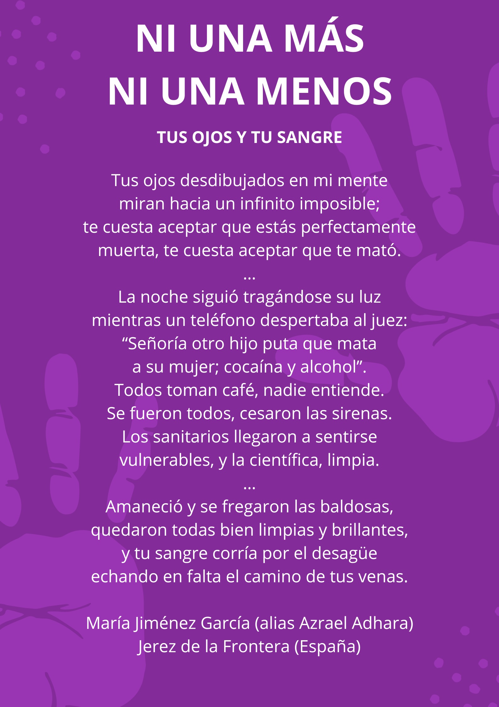 Concejales, trabajadores del Consistorio y vecinos y vecinas se han concentrado hoy al mediodía para condenar esta lacra tras el último asesinato, cometido el pasado domingo en Orihuela. Antes del minuto de silencio, y como forma de transmitir el sentir de nuestro pueblo, la concejala de Igualdad y Mujer, Olga Brínquez, y nuestra vecina Pepa Romero han leído, respectivamente, una Declaración Institucional y un poema reivindicativo y feminista, titulado Tus ojos y tu sangre, con el que la autora María Jiménez García (alias Azrael Adhara) participó en el certamen poético ‘Quejío, Grito de Mujer’, celebrado recientemente en Córdoba (clic aquí para leer el texto).