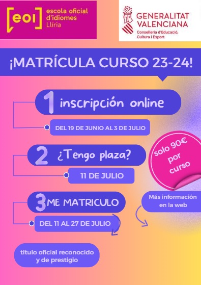Adjuntamos información de la EOI de Llíria sobre el proceso y los plazos de matrícula (clic aquí para ver la imagen), así como los siguientes enlaces: