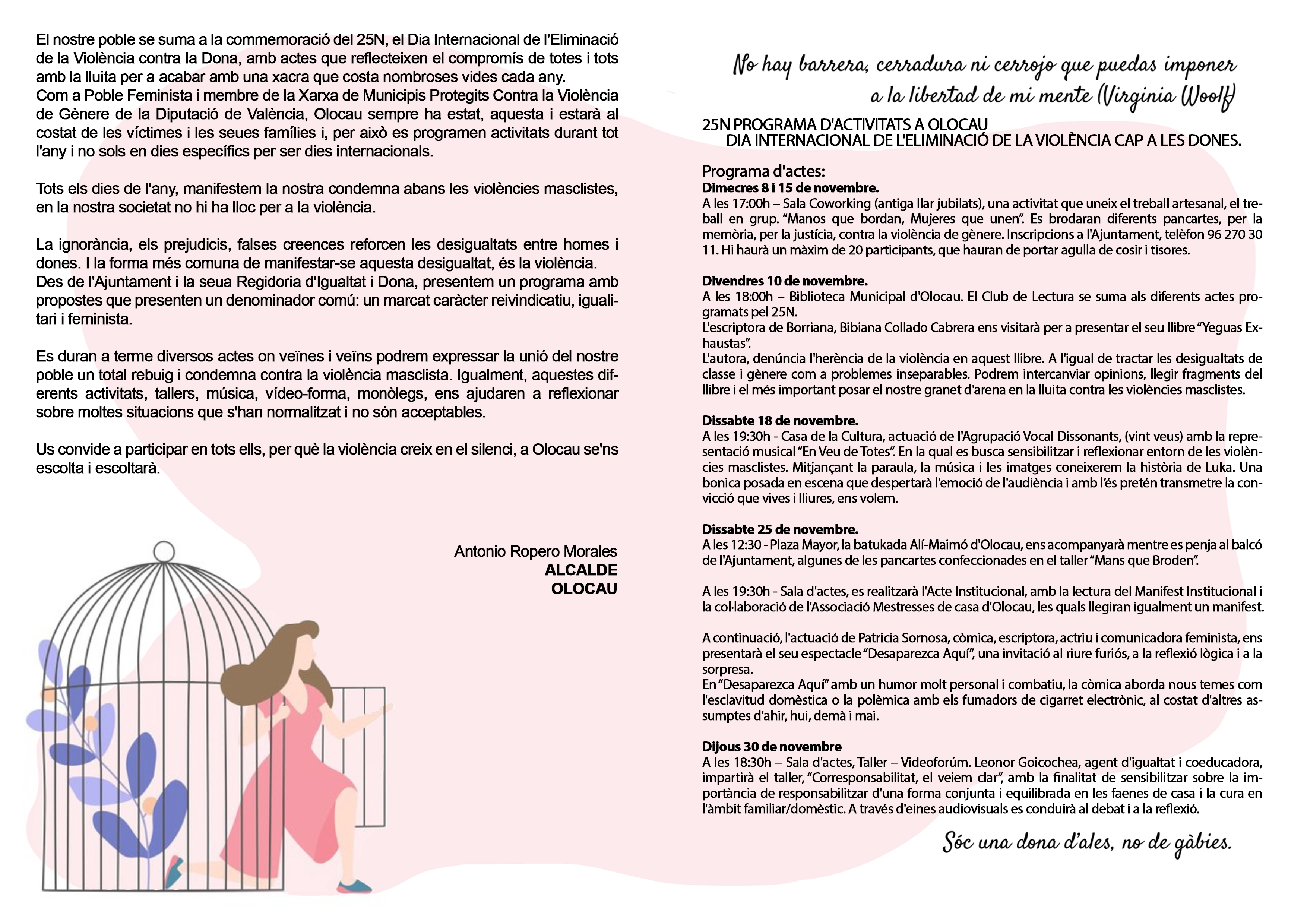 Desde la ilusión y la responsabilidad, seguimos trabajando para mejorar la calidad de vida de nuestros vecinos y vecinas. Hemos conseguido grandes logros en los últimos años, pero aún tenemos previstas más propuestas e iniciativas que supondrán un nuevo impulso para Olocau. Somos conscientes del potencial que tiene nuestro pueblo y, por este motivo, tenemos un proyecto de presente y de futuro, con medidas dirigidas a todas y todos. Un proyecto que vamos a llevar adelante con dedicación, esfuerzo y determinación. Ámbitos como la Educación, la Familia, el Urbanismo, el Medio Ambiente, la Igualdad, el Patrimonio, o los Servicios Sociales tendrán un papel fundamental en nuestro día a día. Además, desde una perspectiva que abarque todo el término municipal para que tanto el casco urbano como nuestras urbanizaciones puedan disponer de los mejores servicios e infraestructuras. Queremos continuar avanzado en la senda de bienestar y desarrollo que iniciamos hace once años y mantenemos nuestro firme compromiso por el progreso y el crecimiento de Olocau.