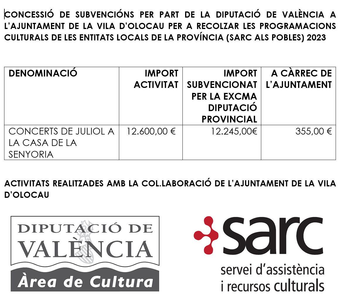 Este ciclo de conciertos, que se enmarca en la programación cultural anual, cuenta con el patrocinio y el financiamiento de la Diputación de València a través de la subvención para apoyar las programaciones culturales de las entidades locales de la provincia (SARC ALS POBLES) 2023.
