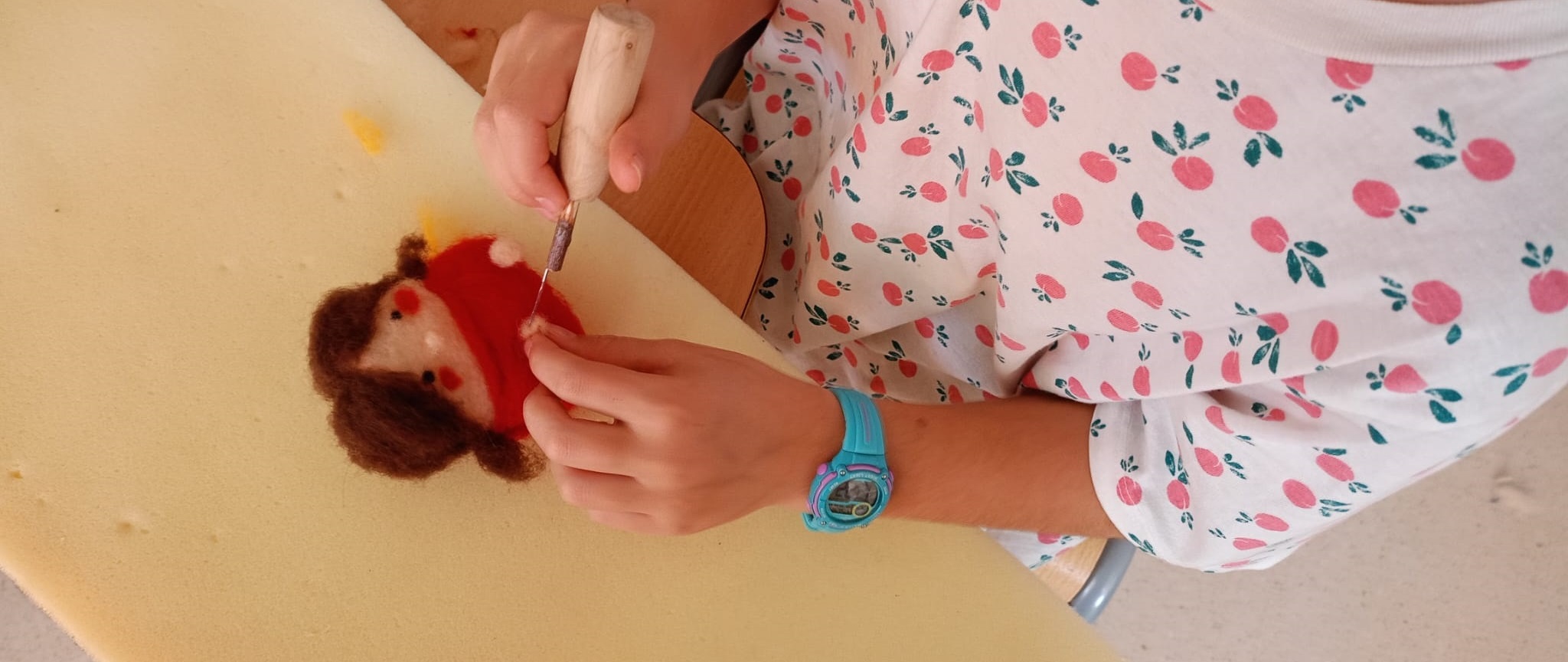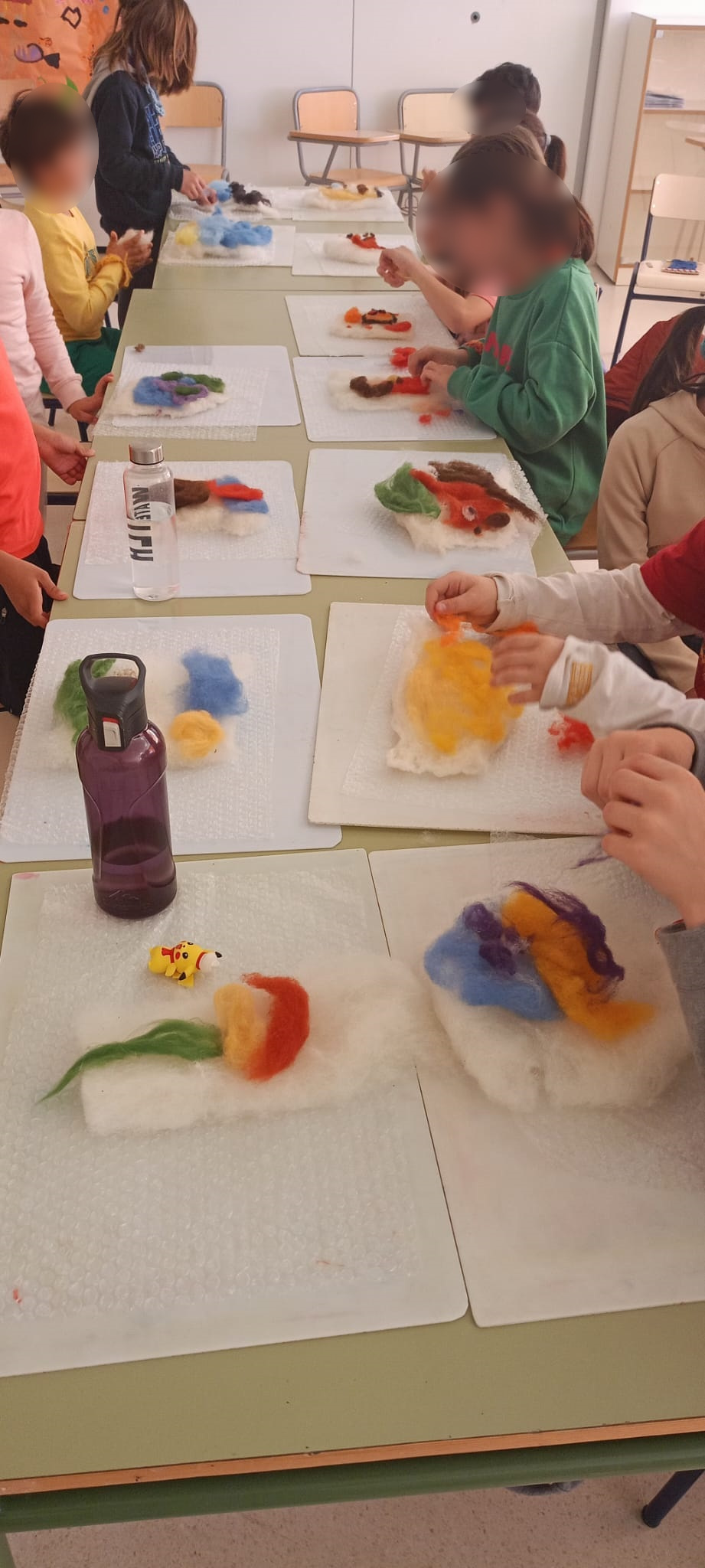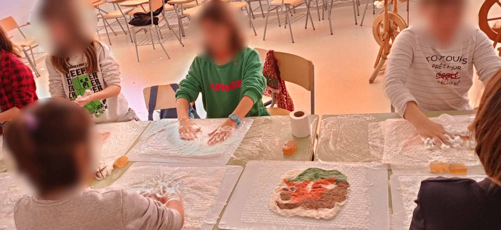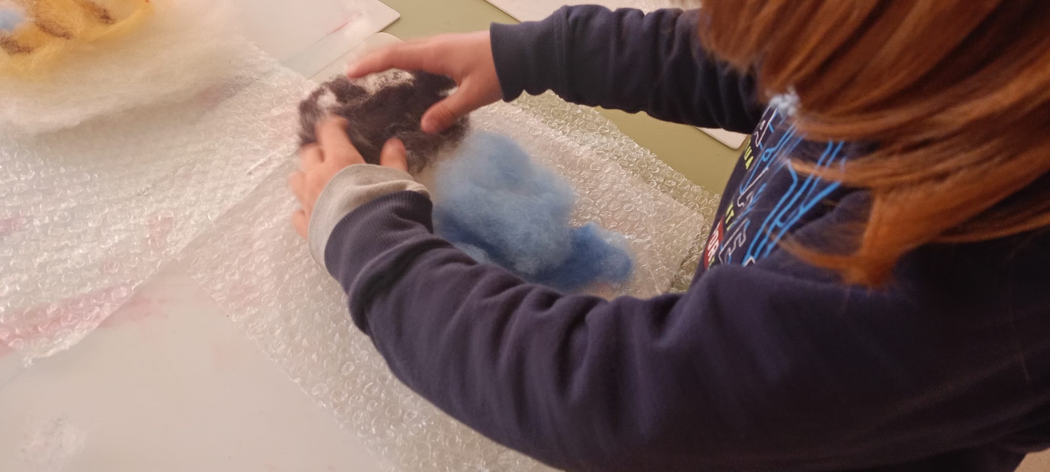 Así, se comenzó con el lavado y el posterior hilado. Posteriormente, tejieron en pequeños telares y con los dedos (elaborando, por ejemplo, una bufanda de casi 6 metros y diferentes tipos de cordones). Durante el tercer y el cuarto día, practicaron la pintura con lana y descubrieron la técnica del afieltrado con agua tibia y jabón. En la última jornada, se narró un cuento con personajes hechos de este material y se confeccionaron unos simpáticos muñecos abatanados con una aguja.