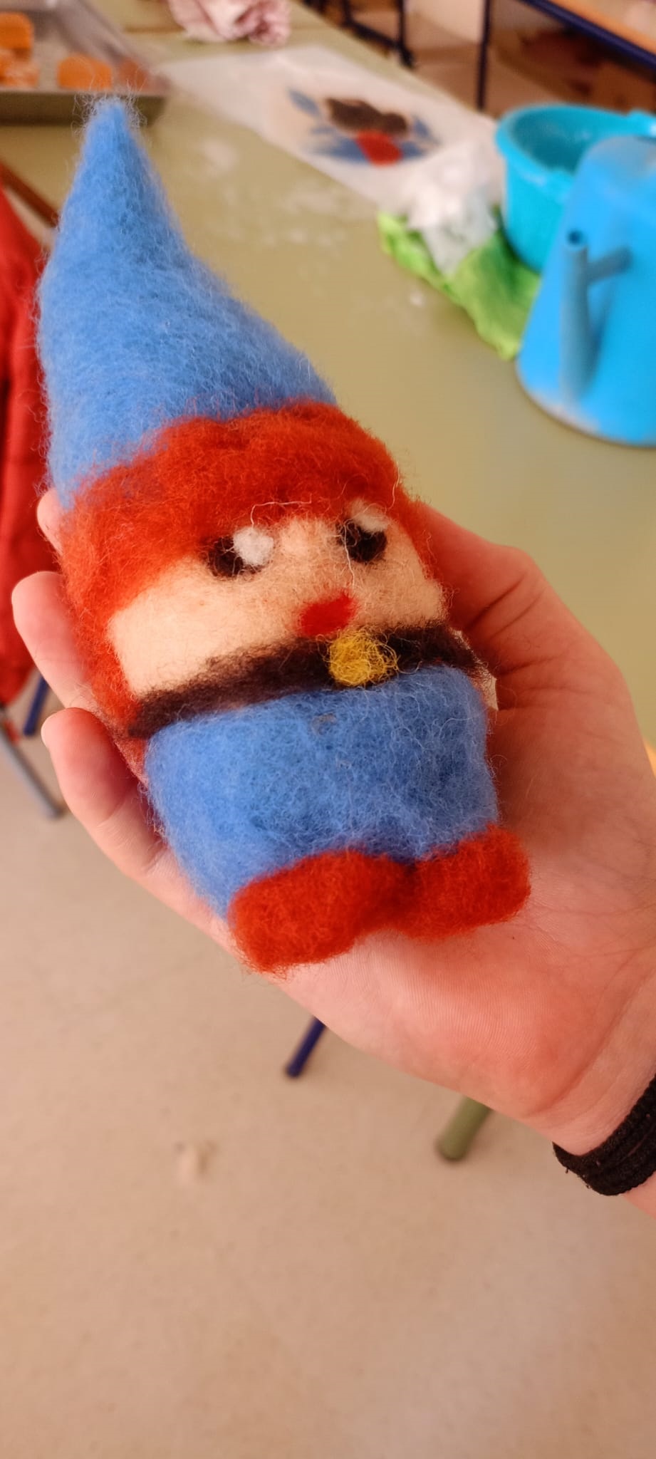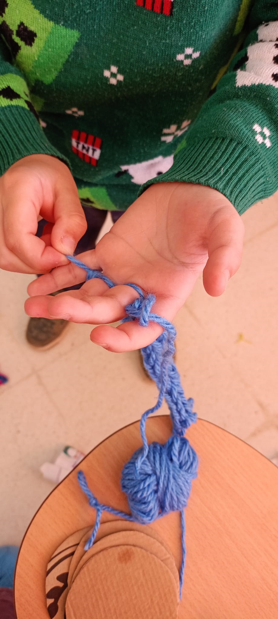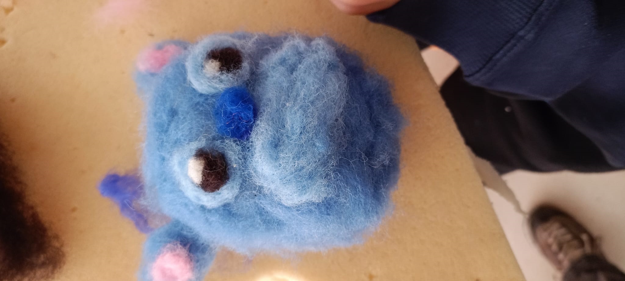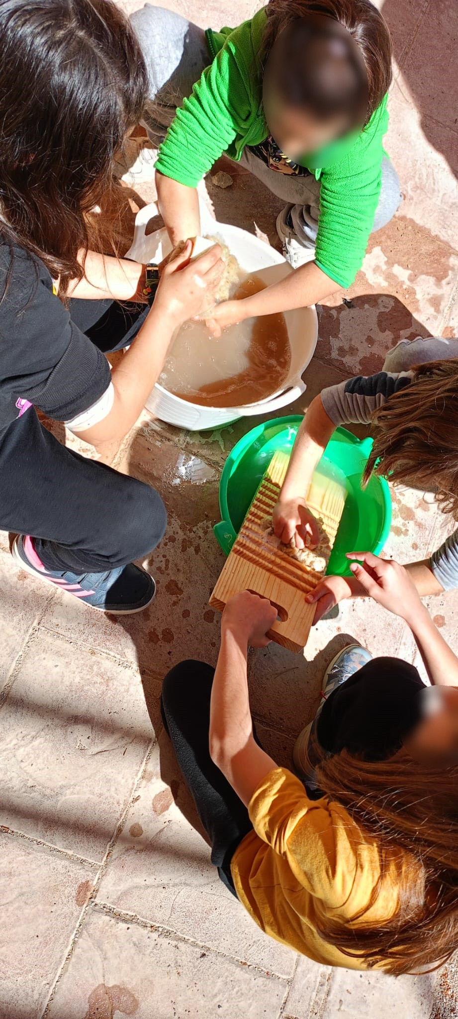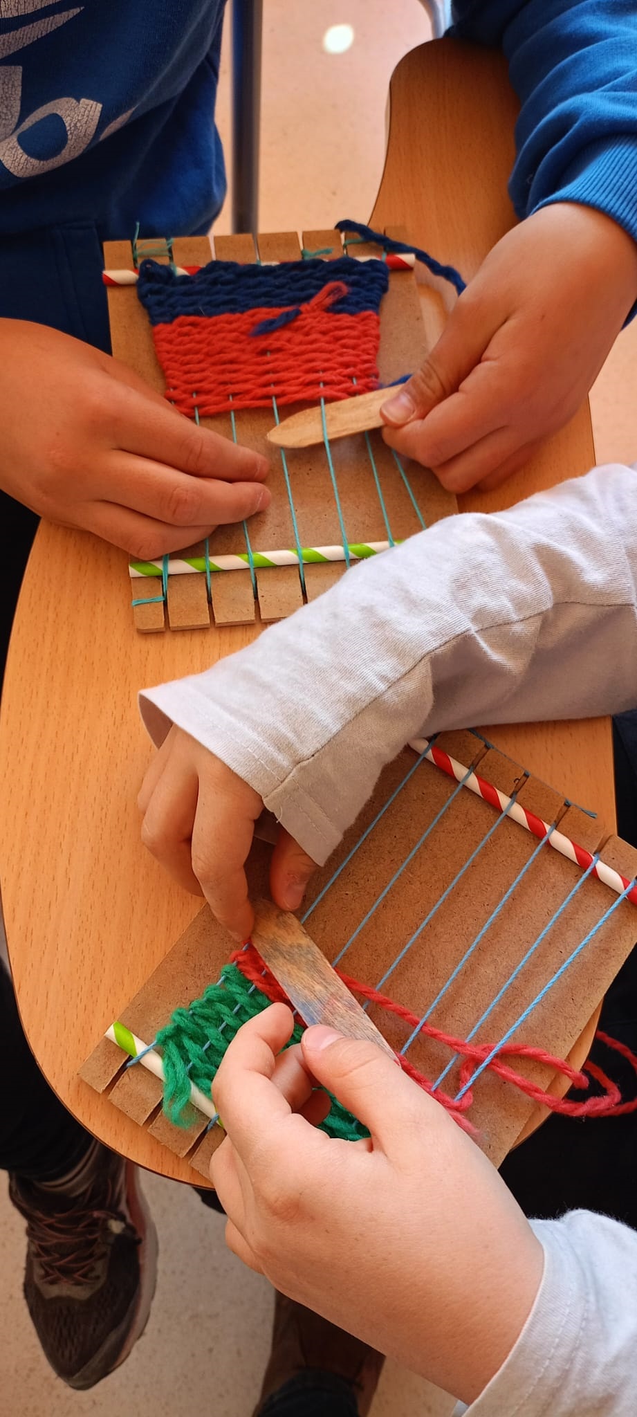 Así, se comenzó con el lavado y el posterior hilado. Posteriormente, tejieron en pequeños telares y con los dedos (elaborando, por ejemplo, una bufanda de casi 6 metros y diferentes tipos de cordones). Durante el tercer y el cuarto día, practicaron la pintura con lana y descubrieron la técnica del afieltrado con agua tibia y jabón. En la última jornada, se narró un cuento con personajes hechos de este material y se confeccionaron unos simpáticos muñecos abatanados con una aguja.