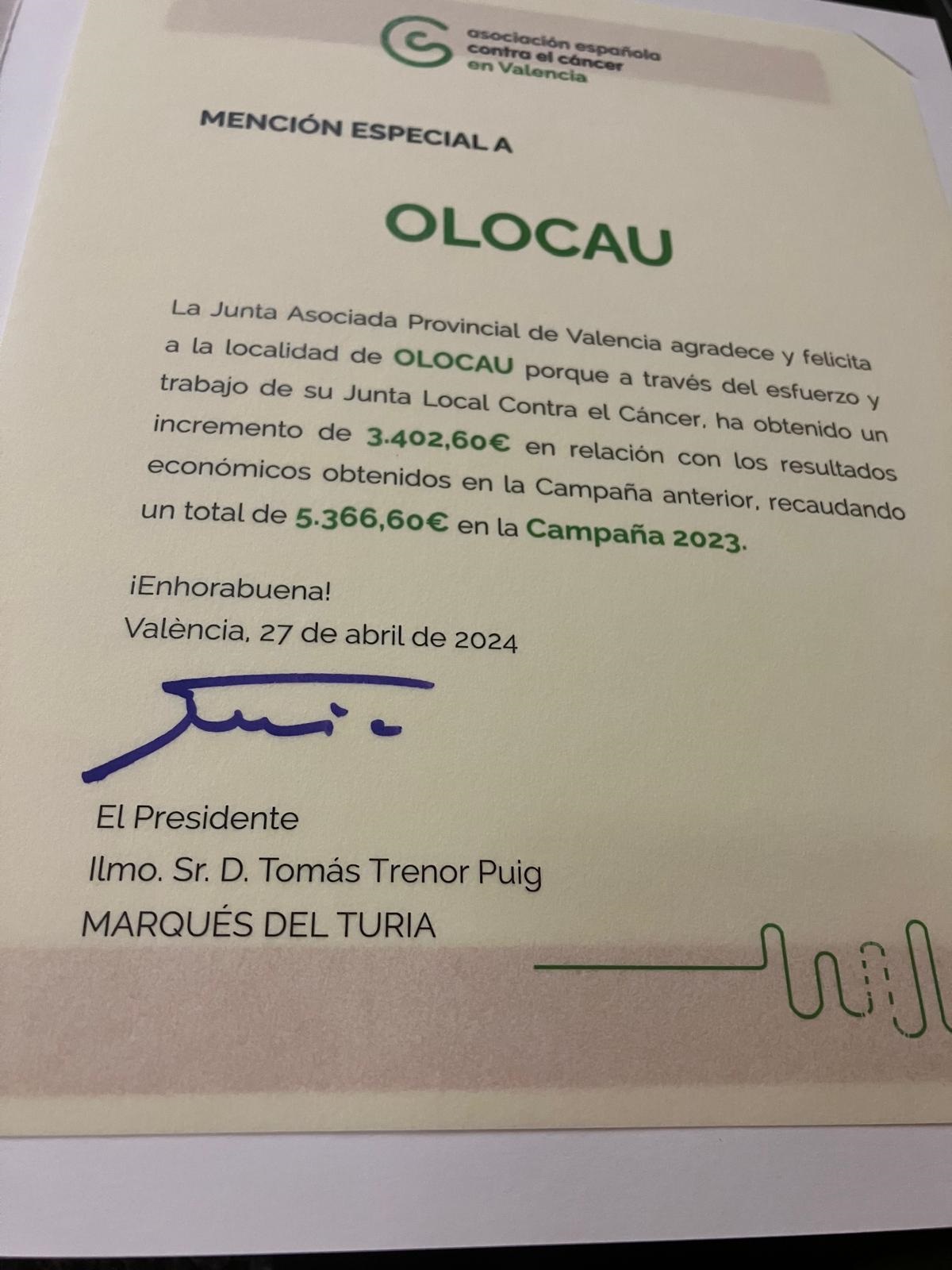En lo referente al trabajo realizado en cada municipio, cabe destacar que la Junta Local de Olocau recibió una Mención Especial por la recaudación obtenida en 2023. La suma, 5.366, 60 euros, supuso un incremento de 3.402,60 euros respecto al ejercicio anterior y su presidenta, María Cabezuelo y la concejala de Sanidad, Olga Brínquez, fueron las encargadas de recoger este reconocimiento.