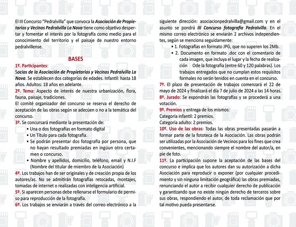 Compartimos las bases del 3er Concurso Fotográfico de la Urbanización Pedralvilla, un certamen organizado por la Asociación de Propietarios y Vecinos de la Urbanización Pedralvilla La Nova y que cuenta con la colaboración del Ayuntamiento a través de su Concejalía de Participación Ciudadana, Fiestas, Comercio y Protección Civil (clic aquí y aquí para ampliar las imágenes).