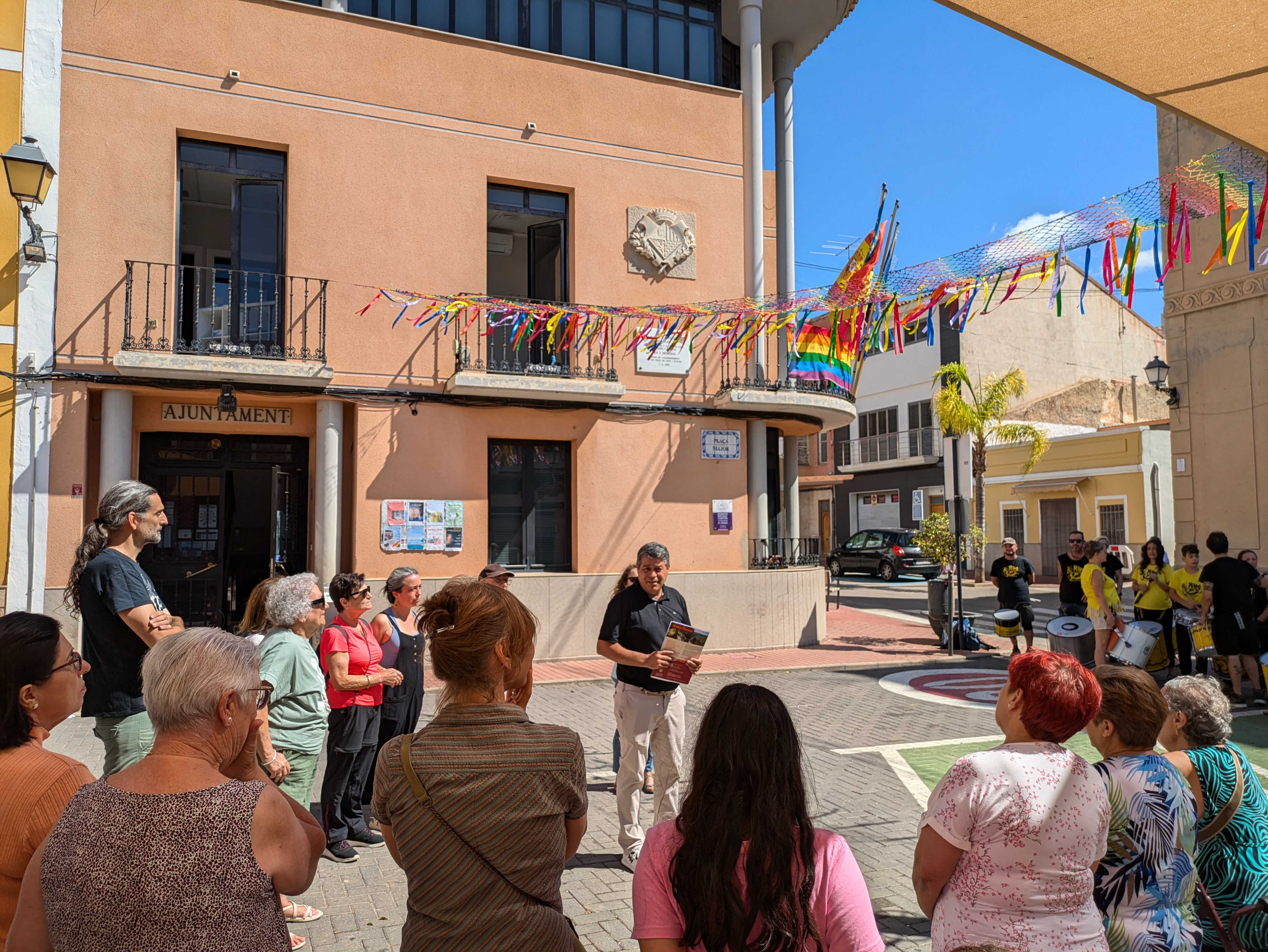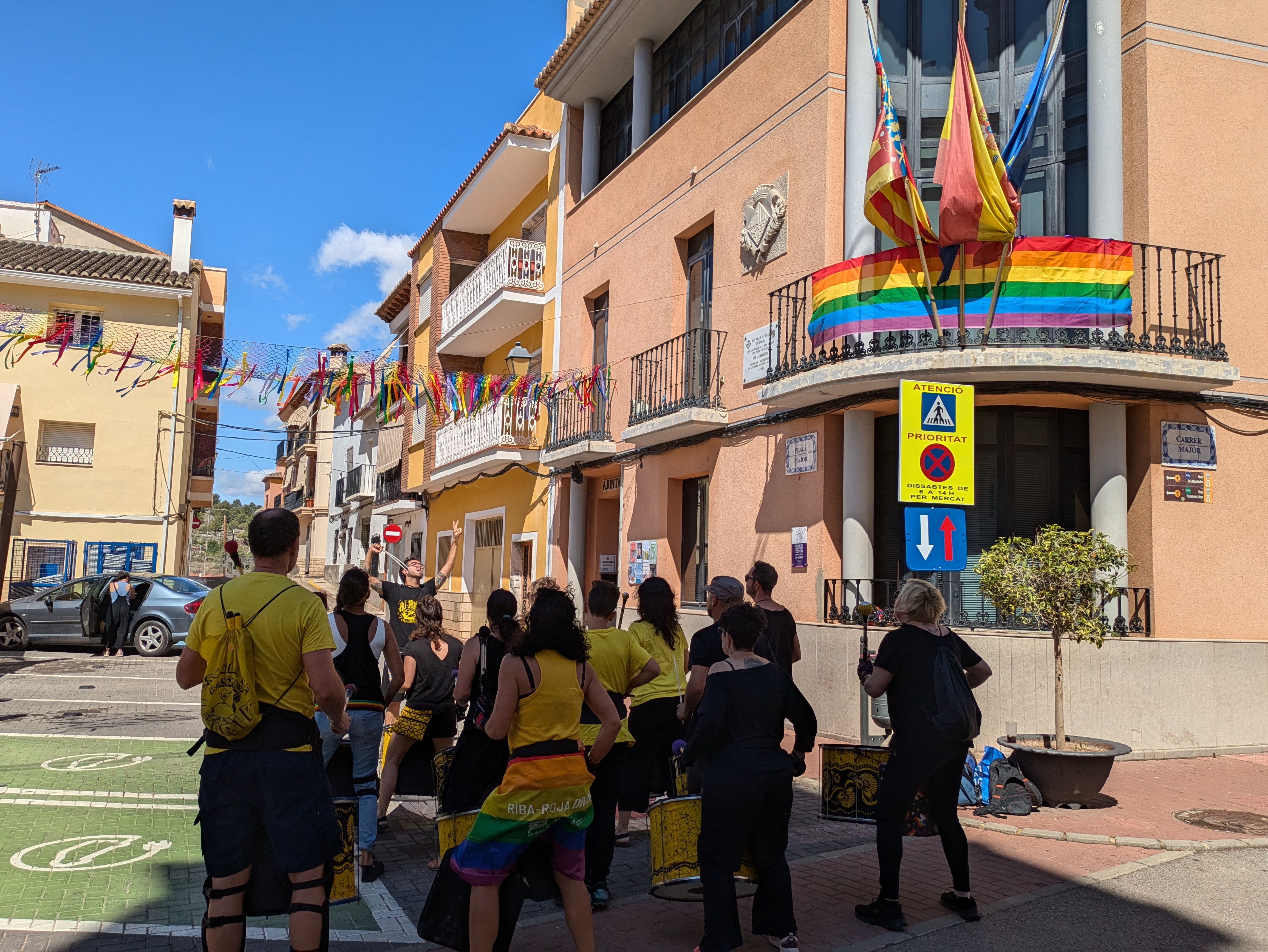 Para ello, en primer lugar, se ha colgado en el Ayuntamiento la red arcoíris elaborada por los y las participantes en el taller ‘Tejiendo red’, que se ha sumado a las dos banderas que se colocaron ayer en los balcones del Consistorio. Los asistentes, entre quienes se encontraban los concejales Pascual Esteve, Olga Brínquez, Desa Vilaplana y Juan González, así como el alcalde, Antonio Ropero, han podido contemplar el extraordinario y original resultado del trabajo realizado durante las dos jornadas del taller.