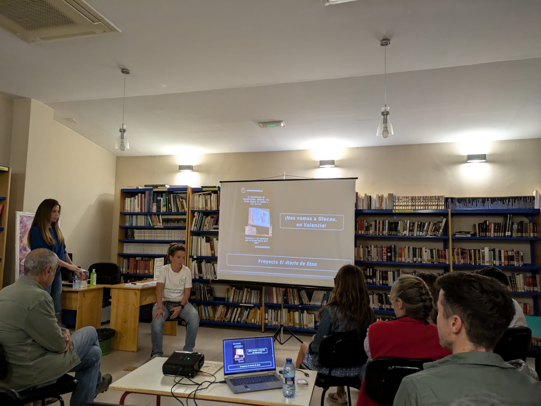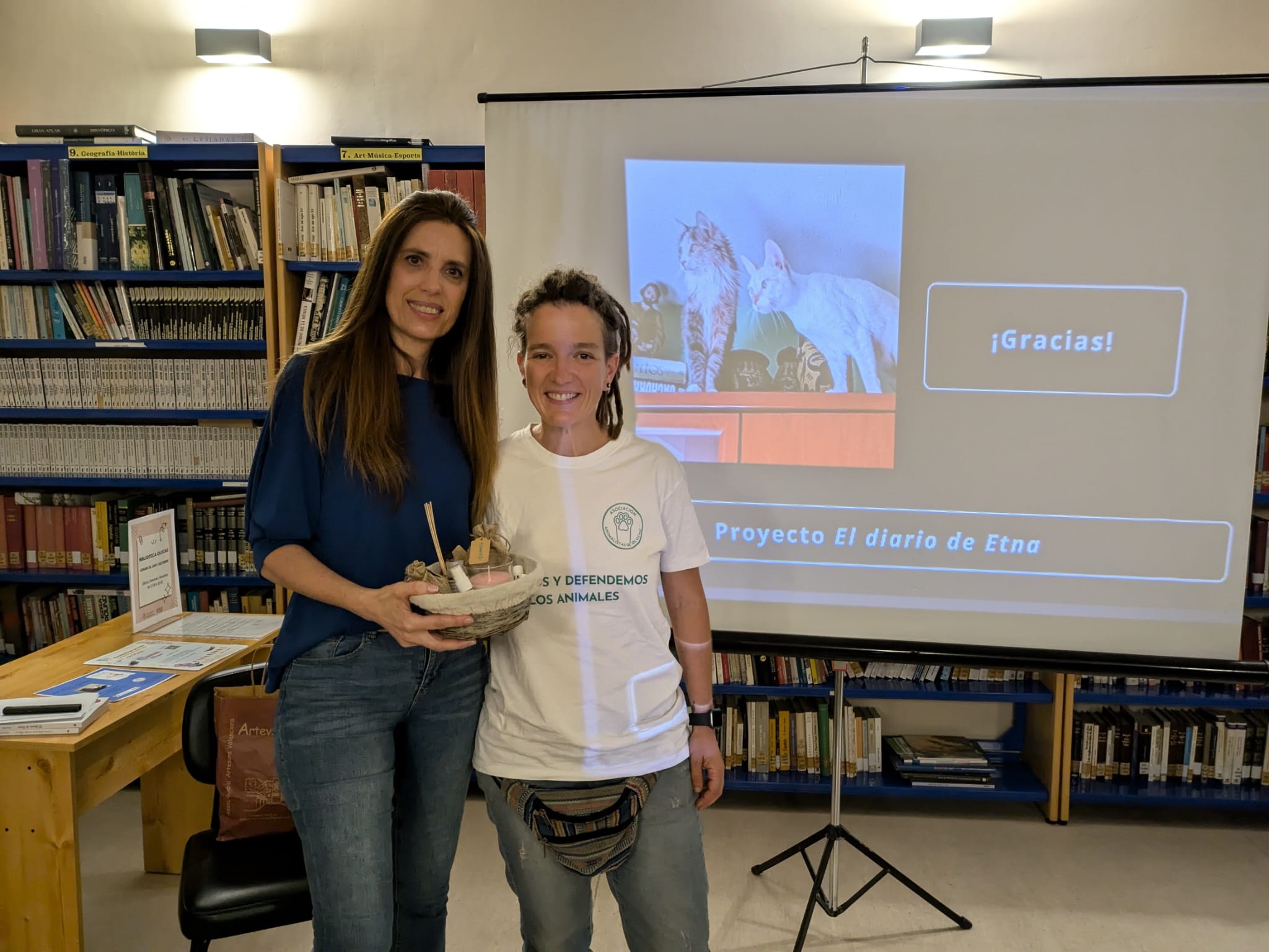 En la parte final del evento, María Tello quiso presentar también el proyecto solidario llamado, como su primer libro, ‘El diario de Etna’. Una iniciativa para ayudar a asociaciones de todo el país que gestionan colonias felinas y que es el motivo por el que estuvo ayer en el municipio, ya que lo recaudado con la venta de ejemplares de la novela fue destinado a Animalistas de Olocau. Además, Tello animó a Neus Moreno, presidenta de la asociación, a explicar al público la labor de cuidado de gatos, así como de formación y sensibilización, que llevan a cabo. Por su parte, Moreno hizo entrega a la escritora de un obsequio como agradecimiento por su visita y su colaboración.