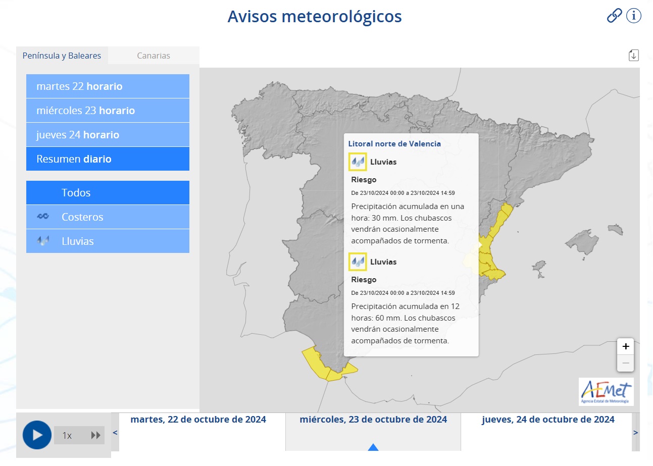Además, se indica que los avisos estarán activos desde las 12:00 horas del día de hoy (clic aquí para ampliar la imagen) hasta las 14:59 horas de mañana (clic aquí para ampliar la imagen), que la precipitación acumulada en una hora podrá alcanzar los 30 litros por metro cuadrado (para mañana, se señala que podría llegar a los 60 en 12 horas) y que los chubascos vendrán ocasionalmente acompañados de tormenta.
