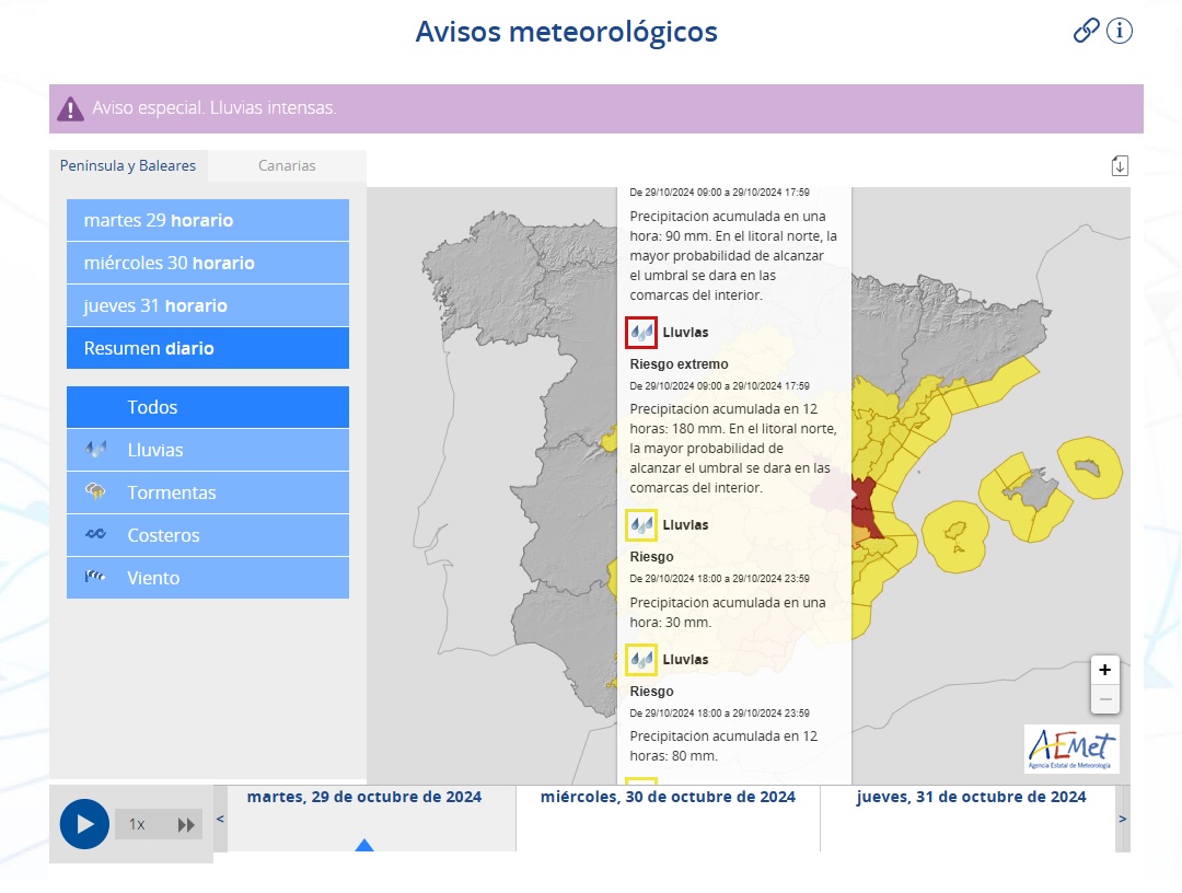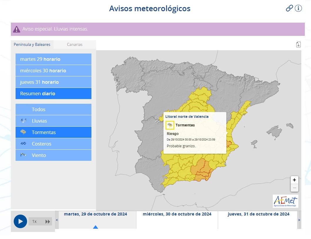 Desde el Ayuntamiento, informamos de que, debido a la evolución de la DANA (depresión aislada en niveles altos) que está recorriendo la Comunidad Valenciana, la Agencia Estatal de Meteorología (AEMET) ha actualizado los avisos por lluvias y tormentas para la jornada de hoy.