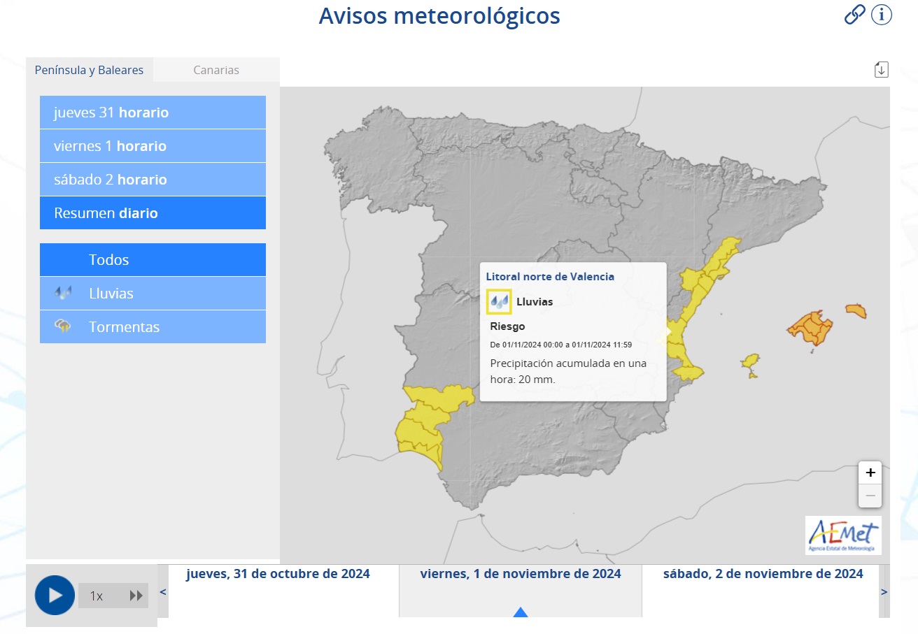 El Ayuntamiento de Olocau informa de que la Agencia Estatal de Meteorología (AEMET) ha establecido el riesgo en nivel amarillo por lluvias y tormentas para hoy (clic aquí para ampliar la imagen) y por lluvias para mañana (clic aquí para ampliar la imagen) en el litoral norte de la provincia.
