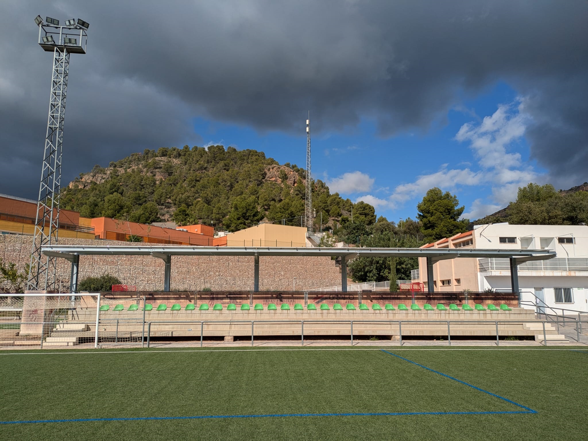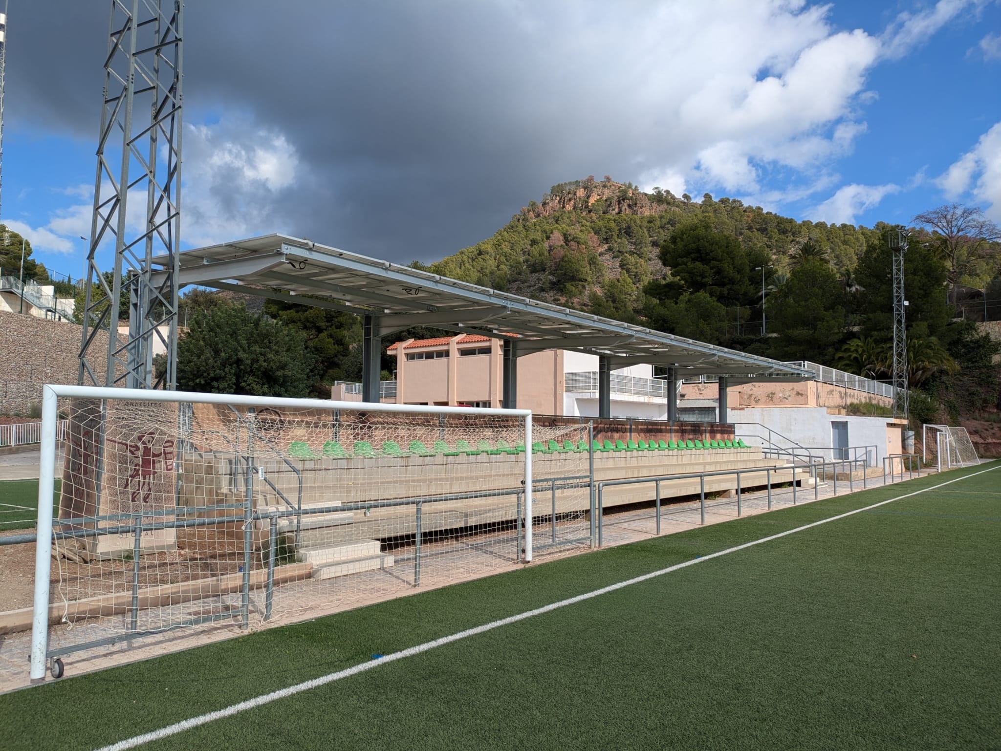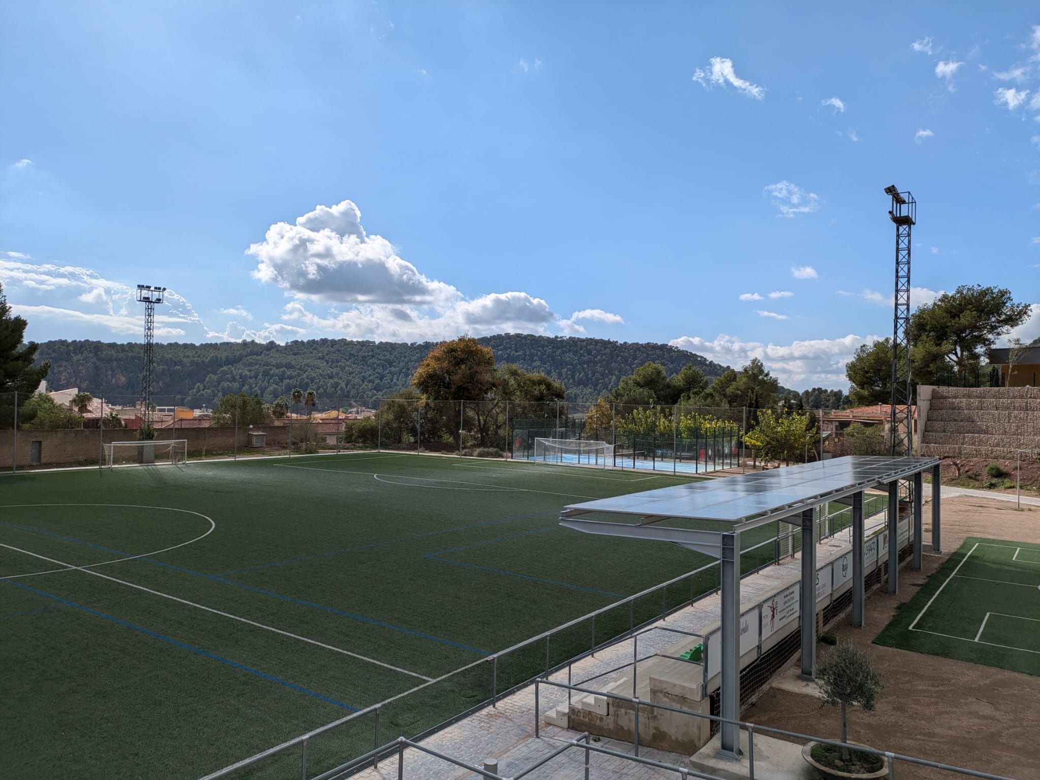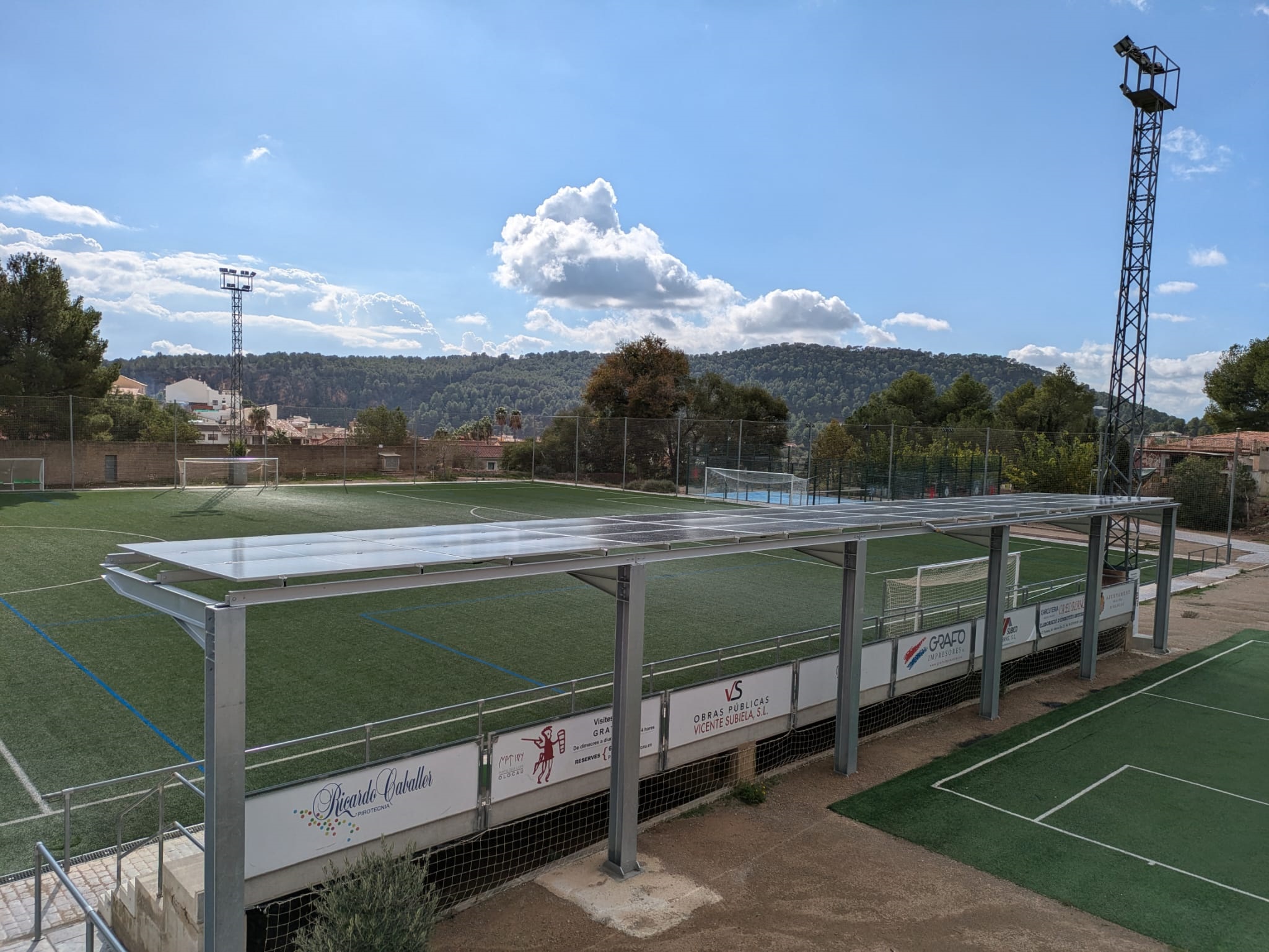 Recientemente, han concluido los trabajos para la instalación de una marquesina y de placas solares en la grada del campo de fútbol del polideportivo Ángel Martínez Torrent "Panadero" de Olocau. Esta actuación mejorará uno de los principales puntos de práctica deportiva de la localidad al mismo tiempo que contribuirá a la generación de energía verde para los edificios municipales.