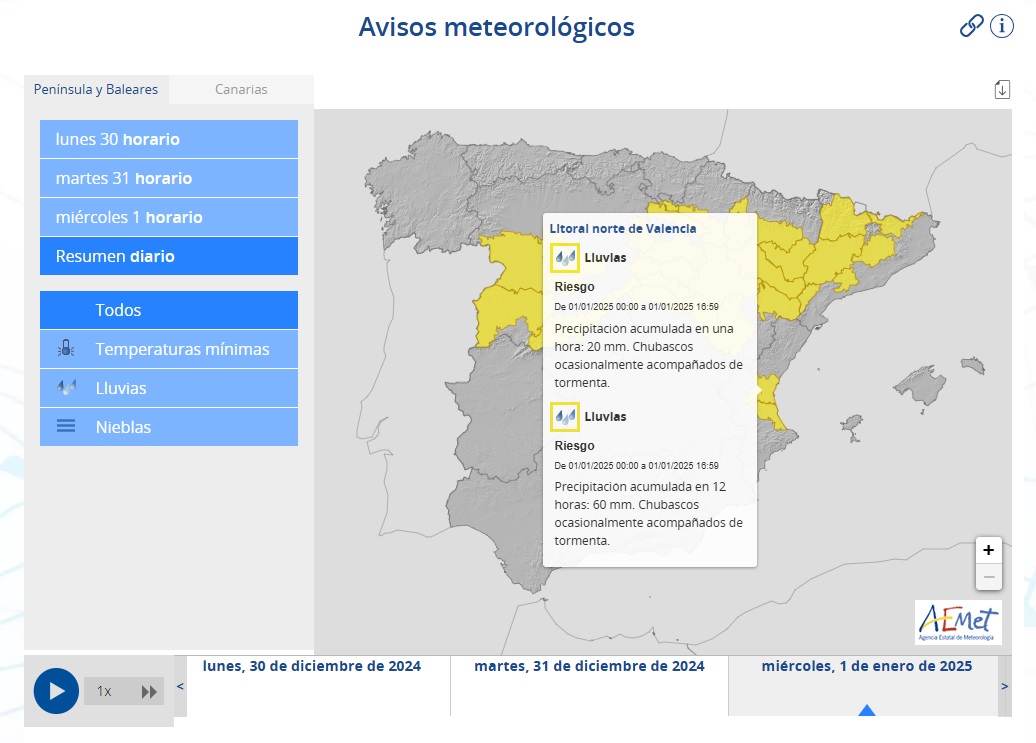 El Ayuntamiento de Olocau informa de que la Agencia Estatal de Meteorología (AEMET) ha establecido el riesgo en nivel amarillo por lluvias para los dos próximos días en el litoral norte de la provincia.