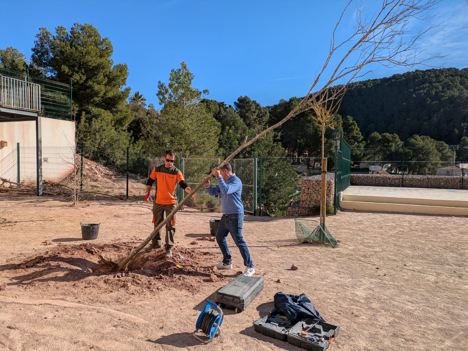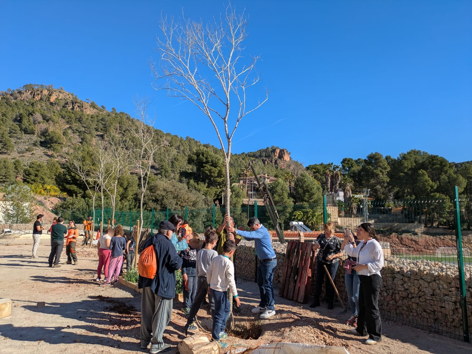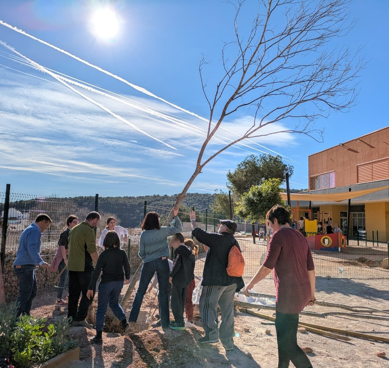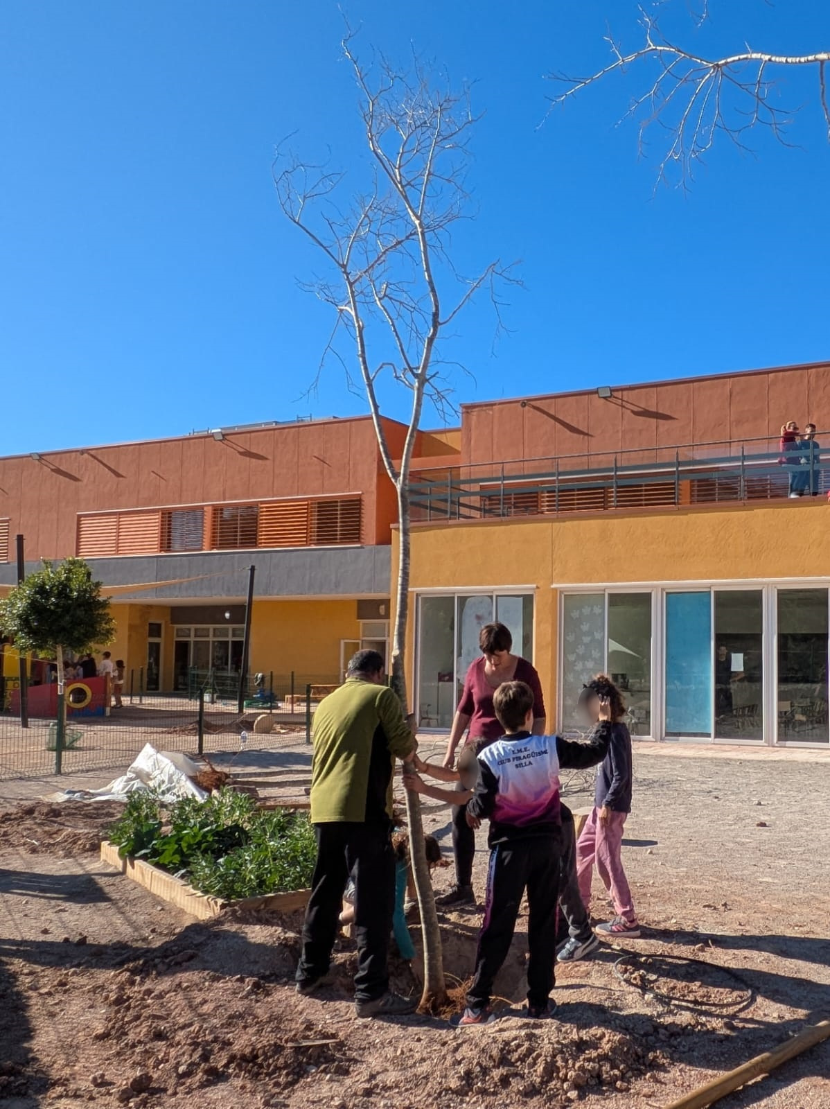A continuación, ha llegado el momento de los árboles, con almeces y fresnos que se han situado en diferentes puntos del patio. Una tarea de equipo en la que todos los allí presentes han cooperado para contribuir a seguir mejorando el colegio al mismo tiempo que se promovía el cuidado y el respeto a la naturaleza.