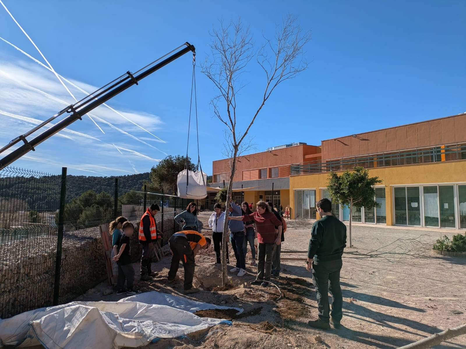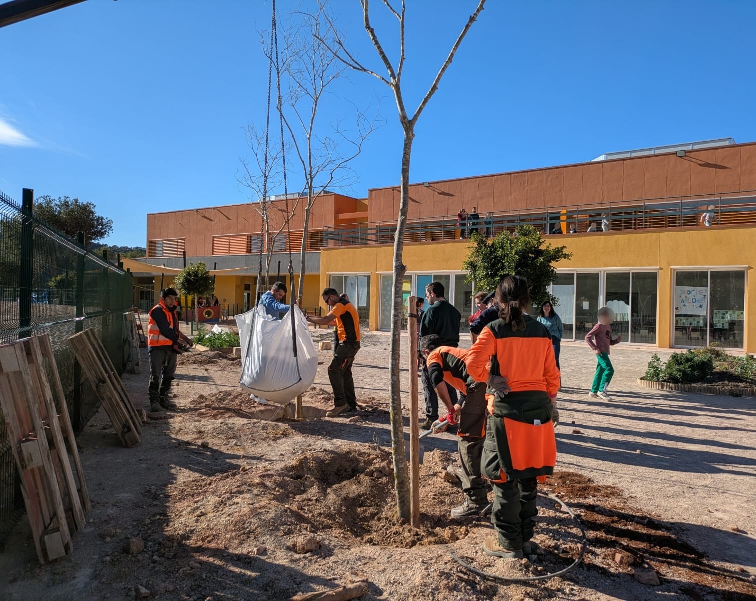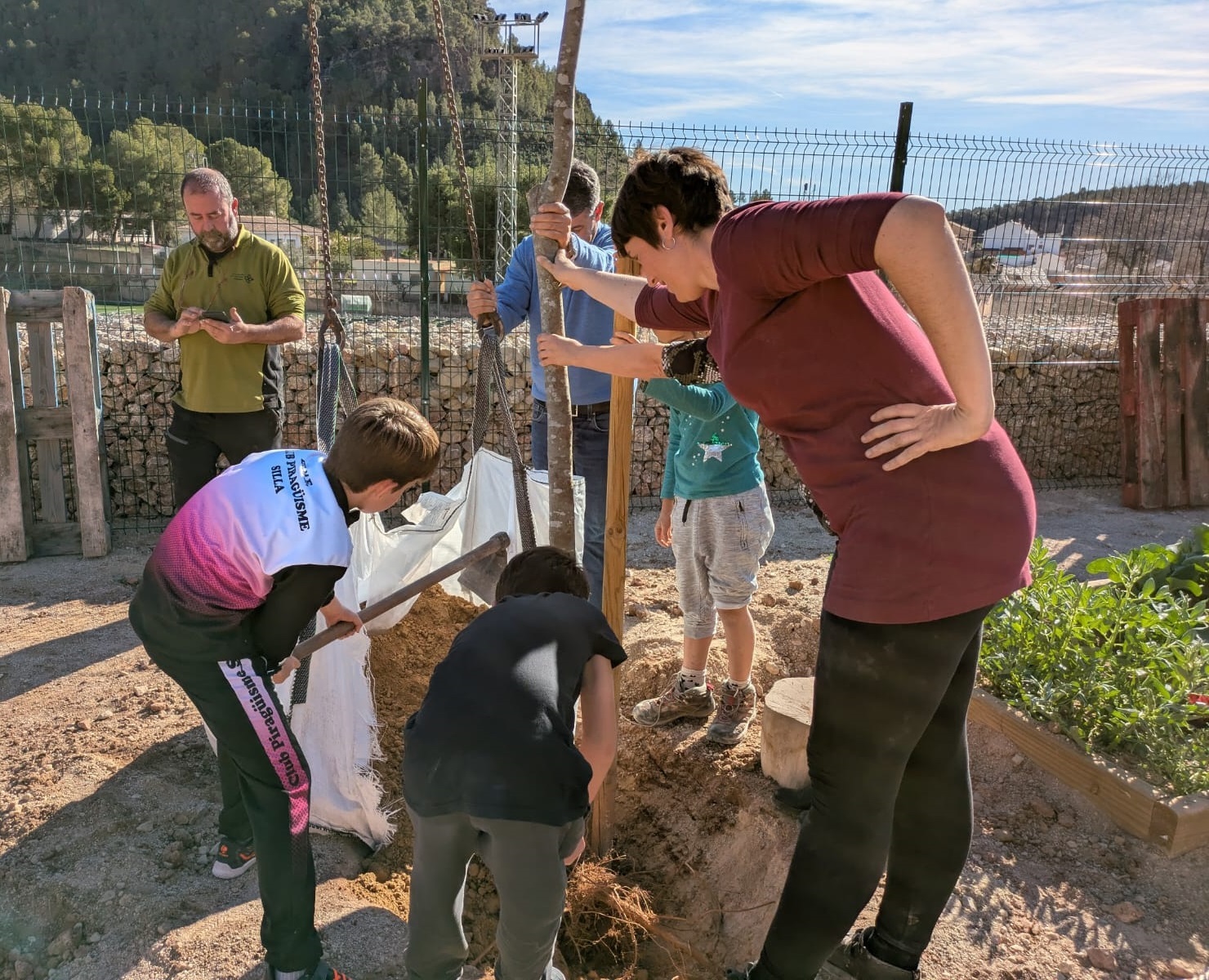 A continuación, ha llegado el momento de los árboles, con almeces y fresnos que se han situado en diferentes puntos del patio. Una tarea de equipo en la que todos los allí presentes han cooperado para contribuir a seguir mejorando el colegio al mismo tiempo que se promovía el cuidado y el respeto a la naturaleza.