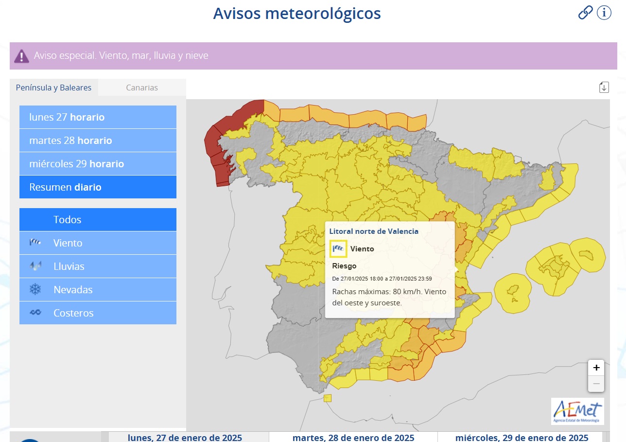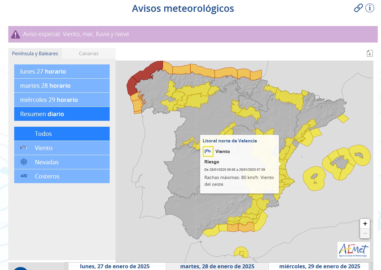 Además, la Agencia Estatal de Meteorología (AEMET), activará a las 18:00 horas el aviso en nivel amarillo por viento en el litoral norte de la provincia de Valencia, con rachas que podrán alcanzar los 80 km/hora. Esta situación se mantendrá hasta mañana a las 7:59 (clic aquí y aquí para ampliar las imágenes).