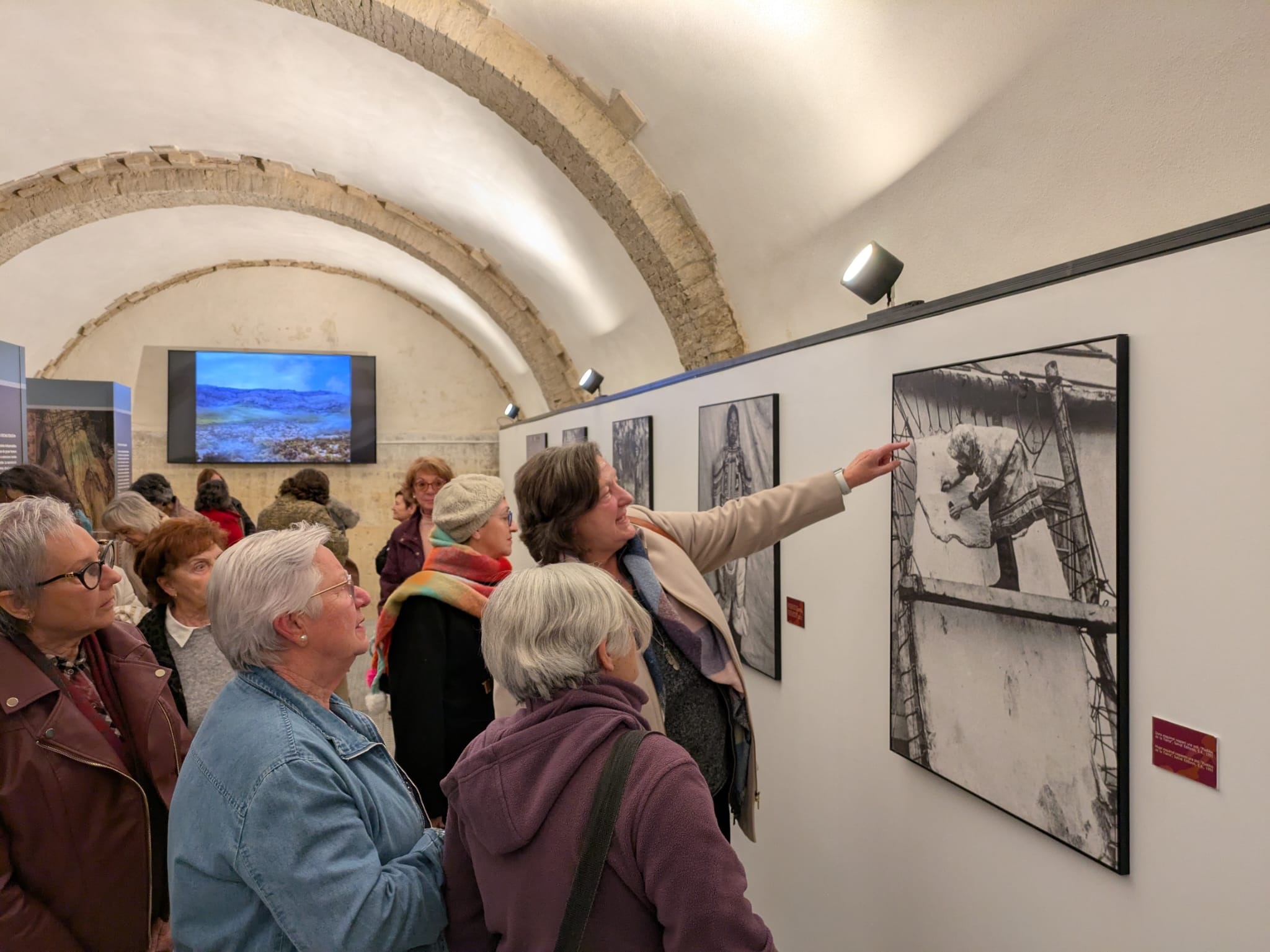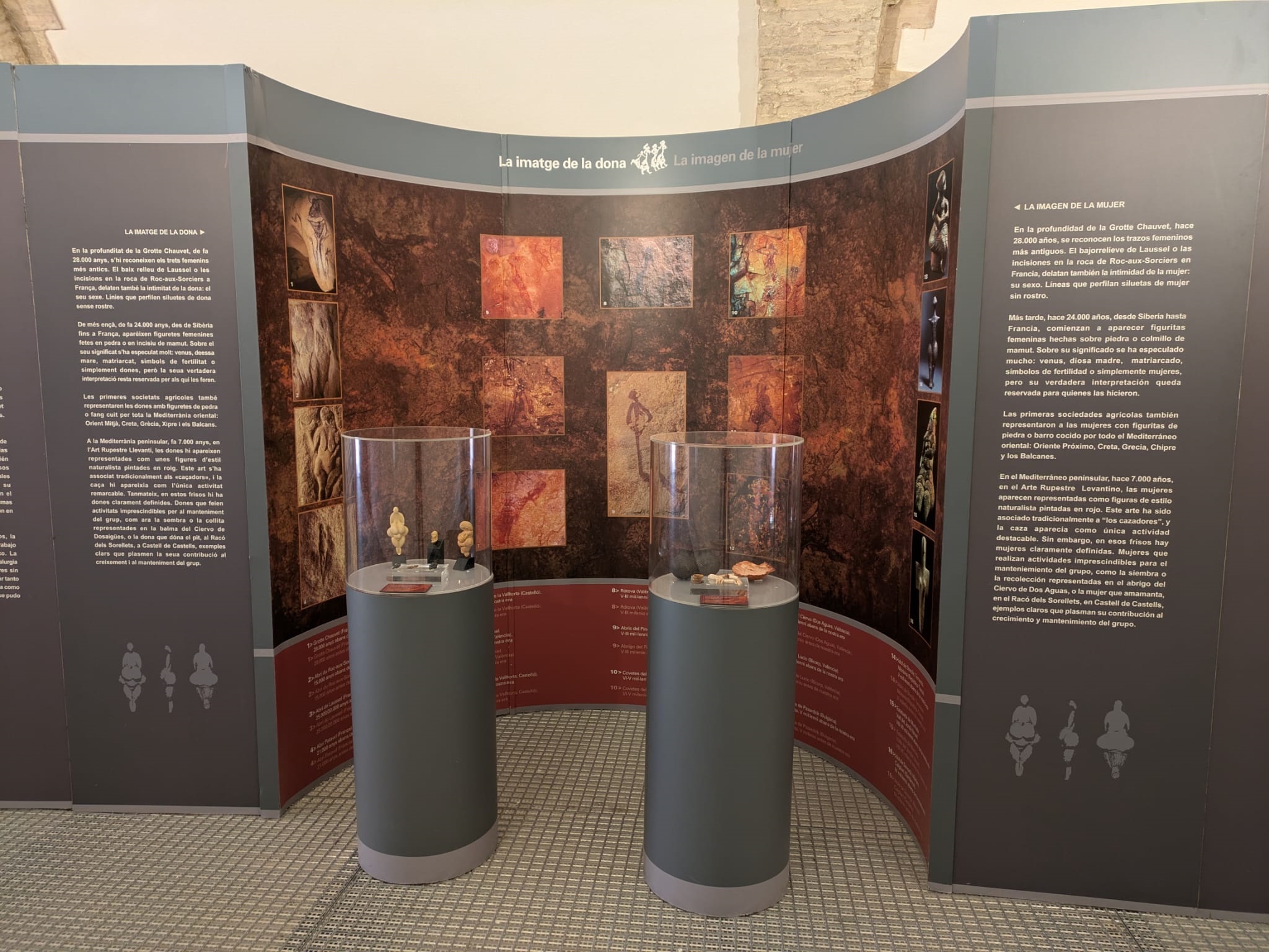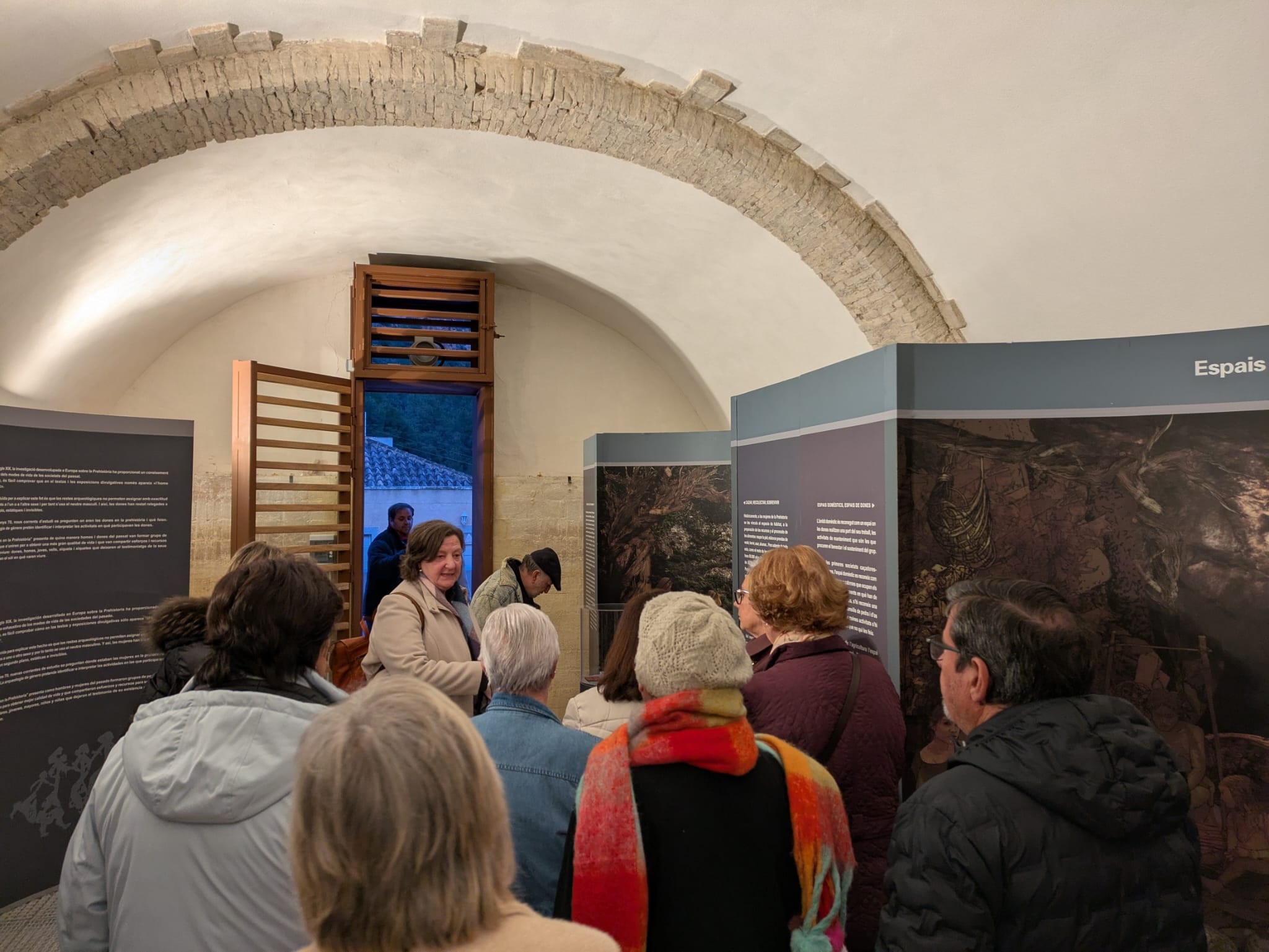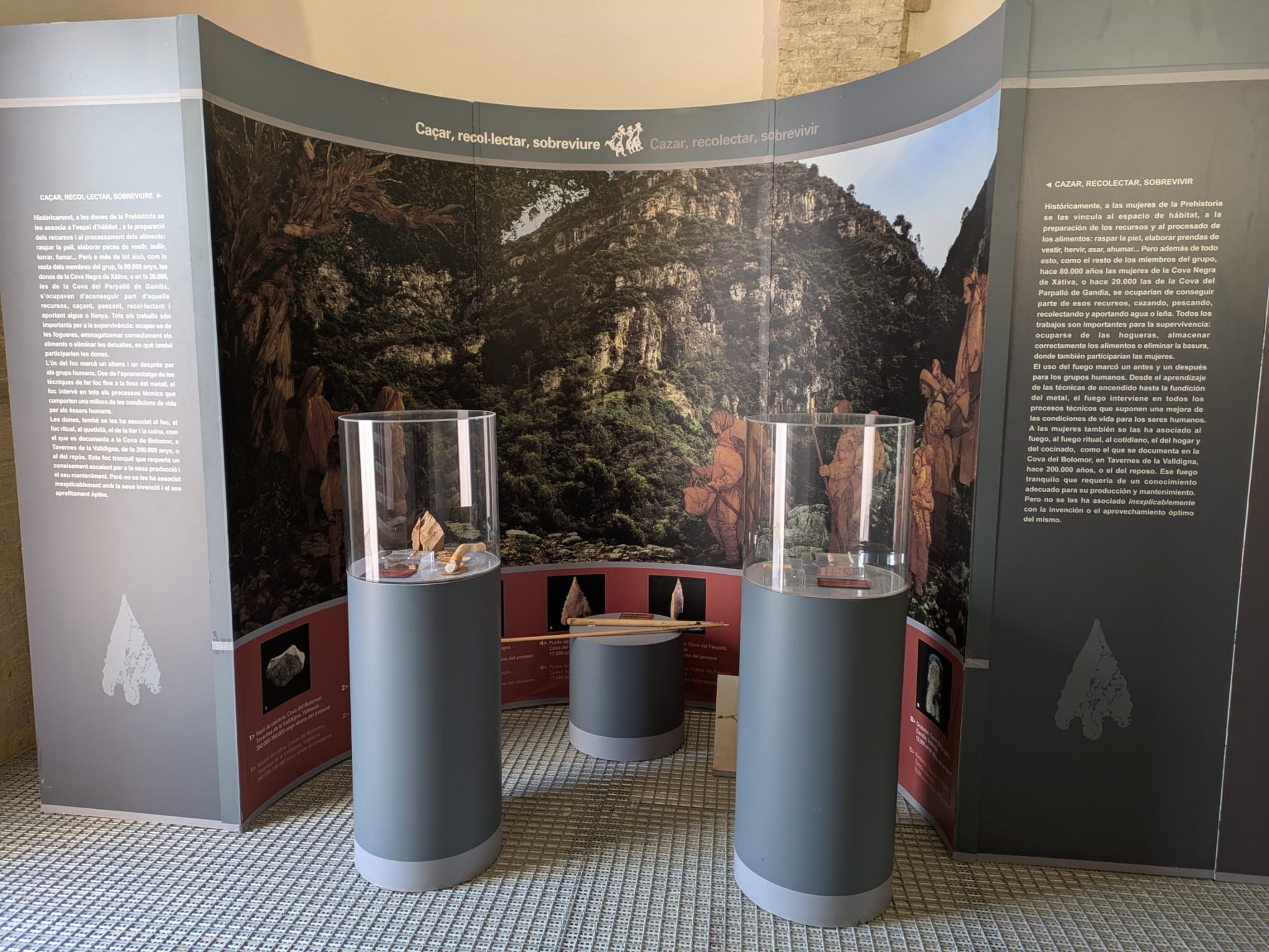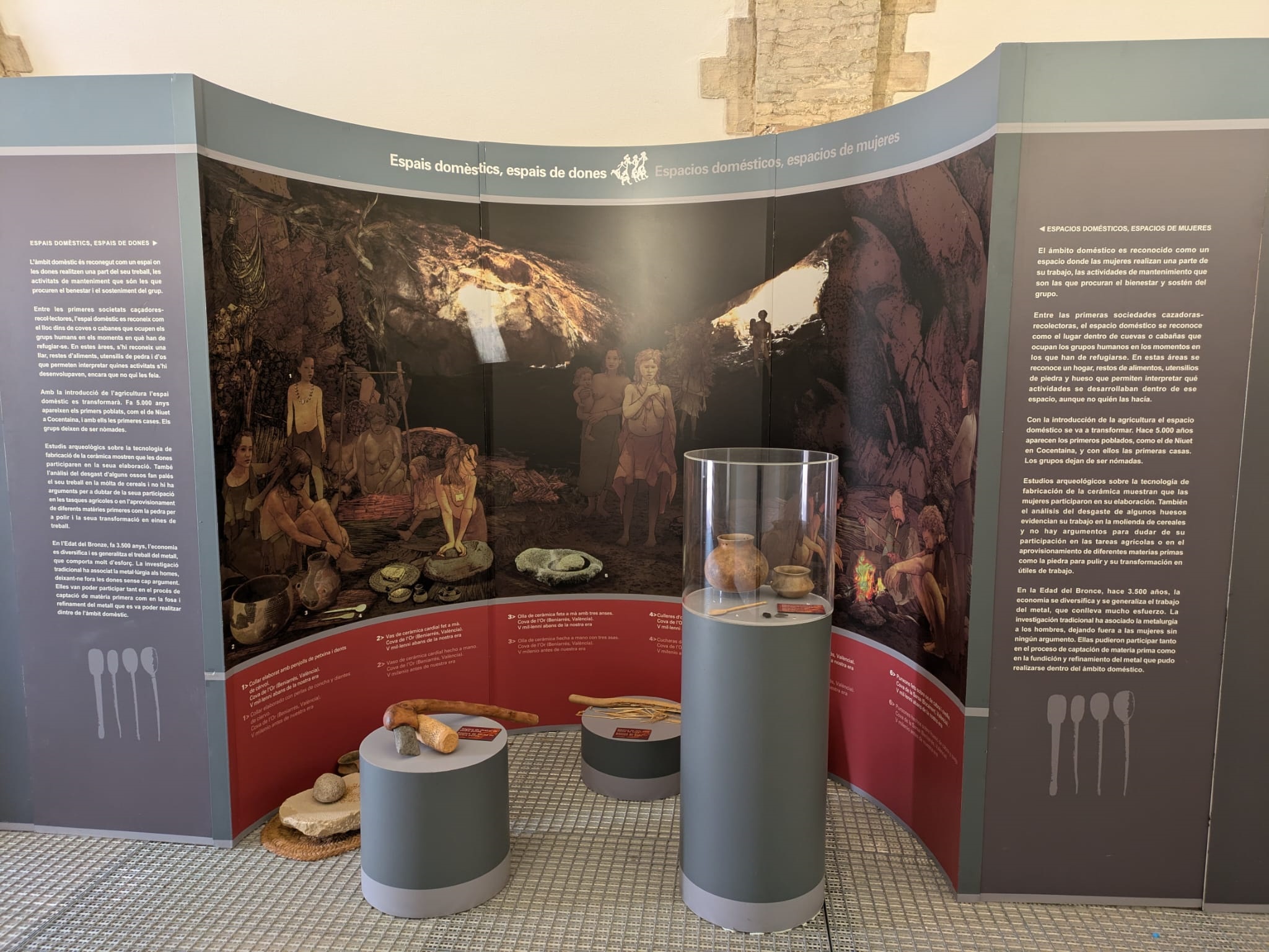 Tras ello, De Pedro realizó un recorrido por los diferentes módulos junto con los y las asistentes para comentar en detalle una muestra que acerca determinados aspectos de la vida diaria del período comprendido entre las primeras sociedades cazadoras-recolectoras-pescadoras y la Edad del Bronce. Así, presentó los cuatro bloques temáticos (‘Cazar, recolectar, sobrevivir’, ‘Espacios domésticos, espacios de mujeres’, ‘La imagen de la mujer’ y ‘Reproducción y socialización’); las imágenes, objetos y réplicas arqueológicas de cada uno de ellos; el vídeo proyectado al fondo de la sala; y el conjunto de fotografías de mujeres pertenecientes a pueblos primitivos realizando tareas tradicionalmente asignadas a los hombres, que podrían apuntar a que en la Prehistoria sucediera lo mismo.