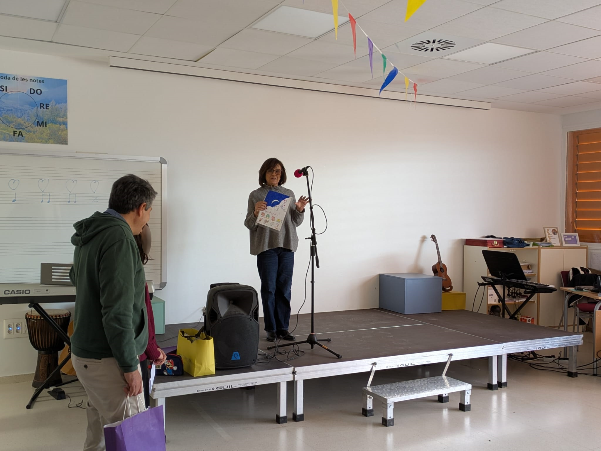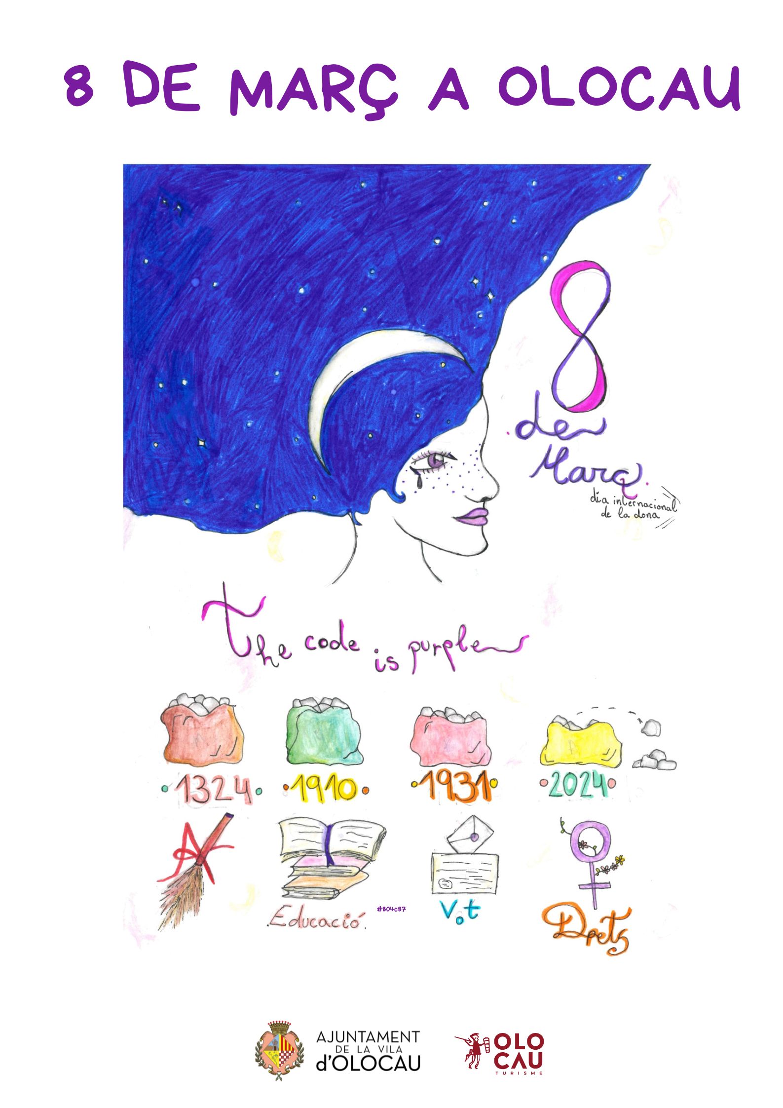 Además, una de las obras ha sido para la autora del cartel, Noa Jude Parrilla Fernández (alumna de 6º de Primaria), que ha explicado brevemente el mensaje que quiso transmitir con él: la luna representa la brillantez de la mujer; la lágrima, el sufrimiento de las mujeres a lo largo de la historia; el título ‘The code is purple’ (‘El morado es el código’) refleja su importancia en la sociedad; y las bolsas con piedras, el peso que han tenido que soportar a lo largo de la historia y cómo, a pesar de los avances conseguidos, todavía queda camino por recorrer.