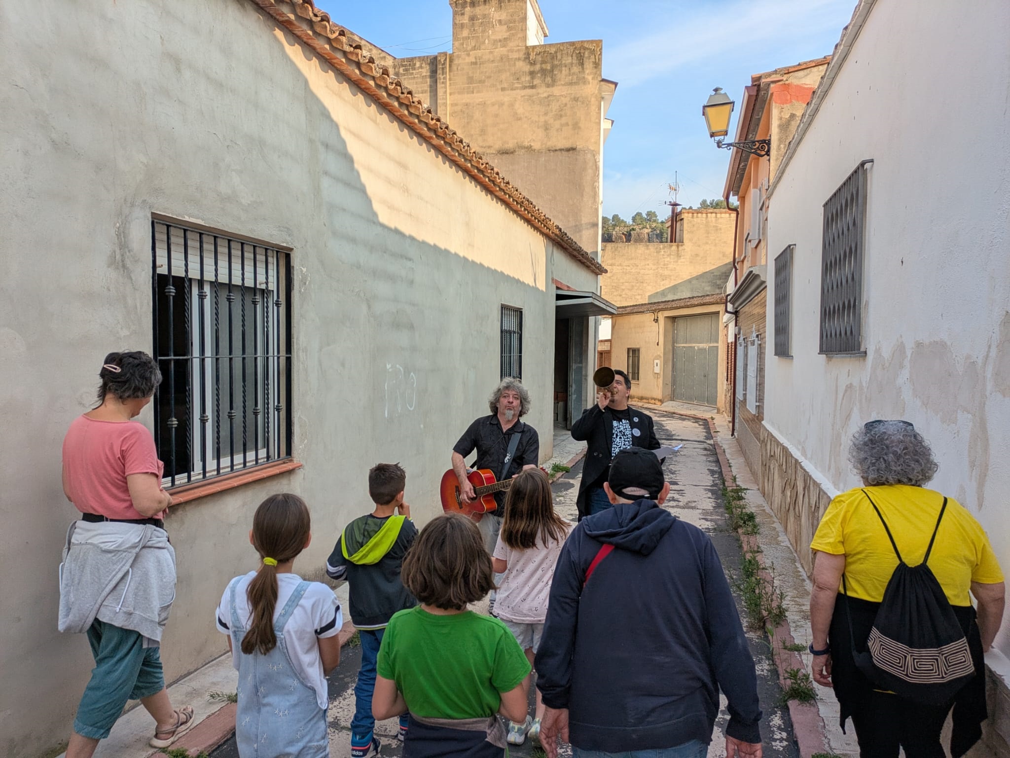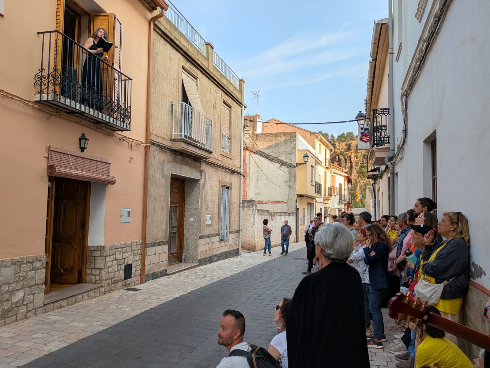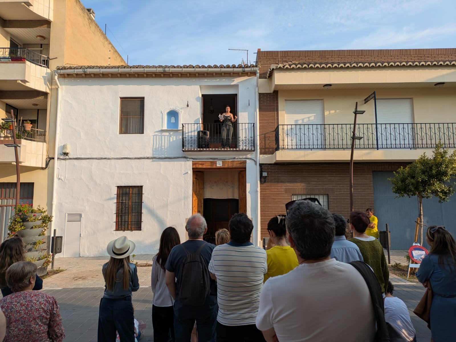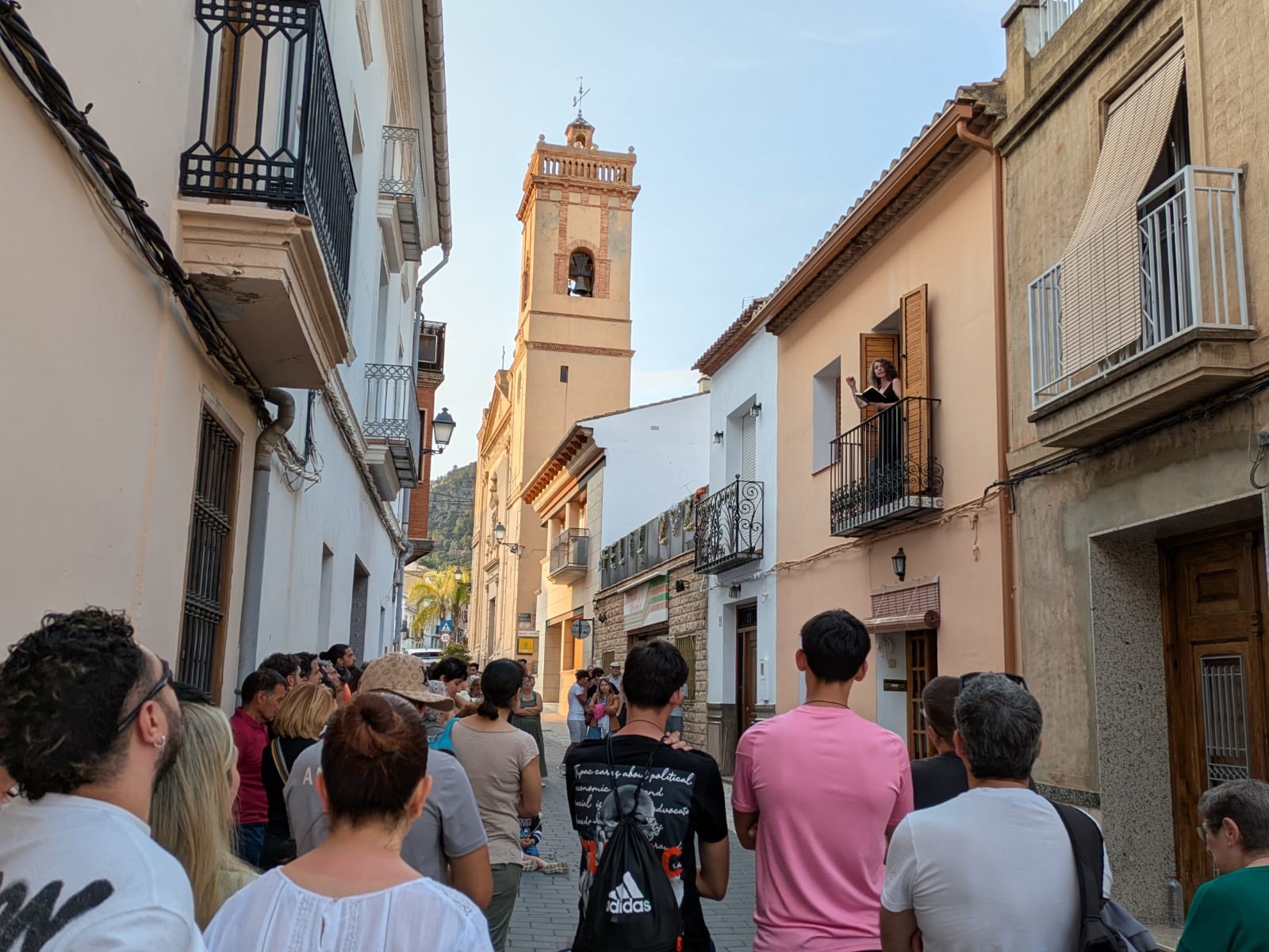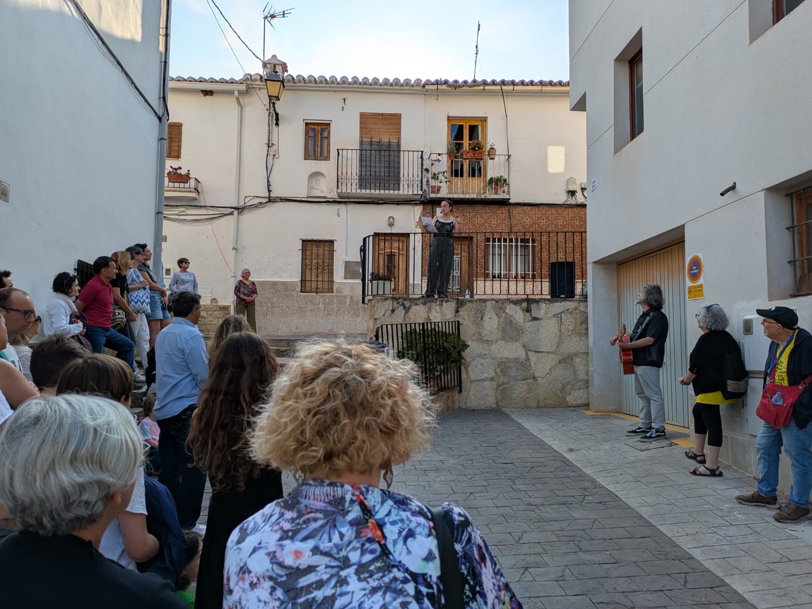 Por la tarde, arrancó desde el cruce de las calles Les Eres y Cueva Santa una nueva edición de ‘Poesia als balcons’. Este espectáculo itinerante recorrió diferentes calles de la localidad con una procesión cívica que unió a sus participantes para disfrutar de la mejor poesía recitada a viva voz. La crítica de Isabel Martín, la rebeldía de Iria Fariñas y la sensibilidad de Myriam Soteras entusiasmaron a un público entregado. Asimismo, Jesús Ge y Antonio José Iglesias (Feriafónica) se encargaron de la animación durante el recorrido con el estilo alegre y desenfadado que les caracteriza, y aprovecharon, al final del camino, para agradecer la labor de los voluntarios y voluntarias cantando con ellos la canción popular ‘Los cuatro muleros’ (interpretada por el Taller de Teatro en la inauguración del Lavadero Municipal). Como cada año, las tres poetas finalizaron sus intervenciones en los balcones de la Casa de la Senyoria para enlazar con la última cita del programa.