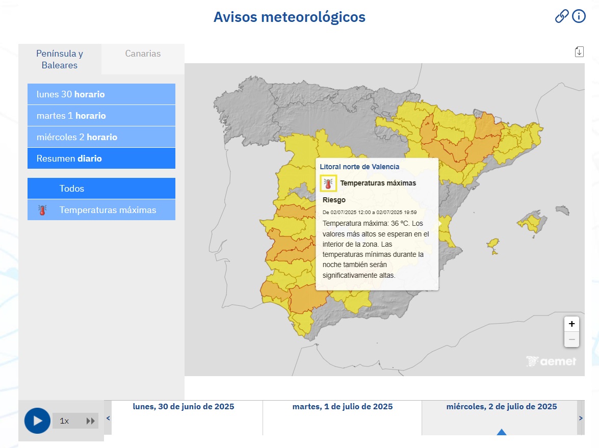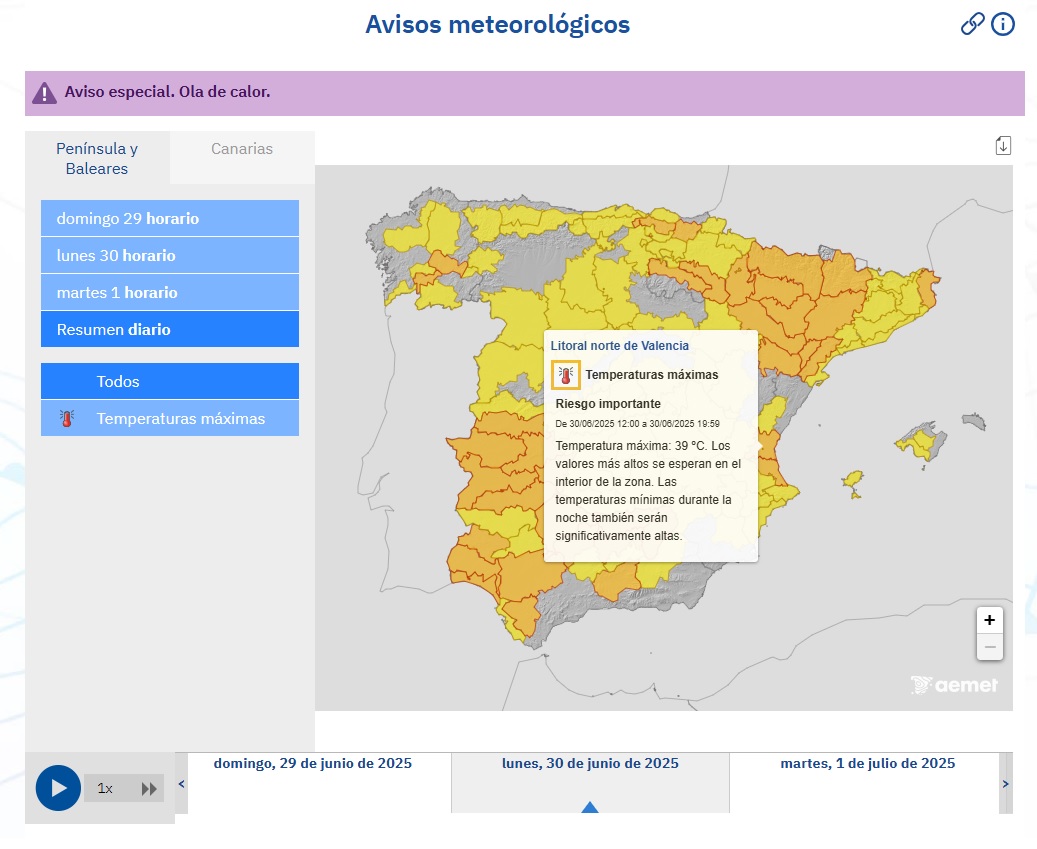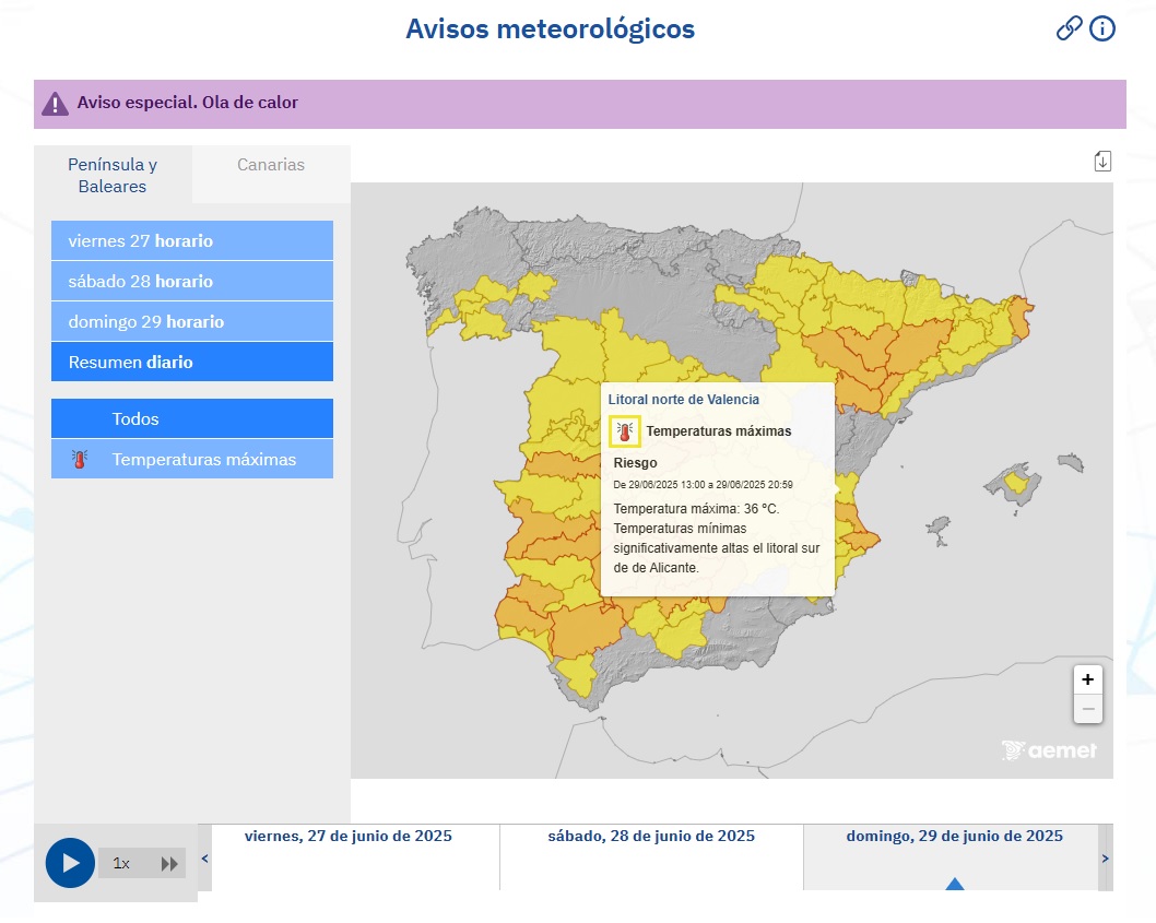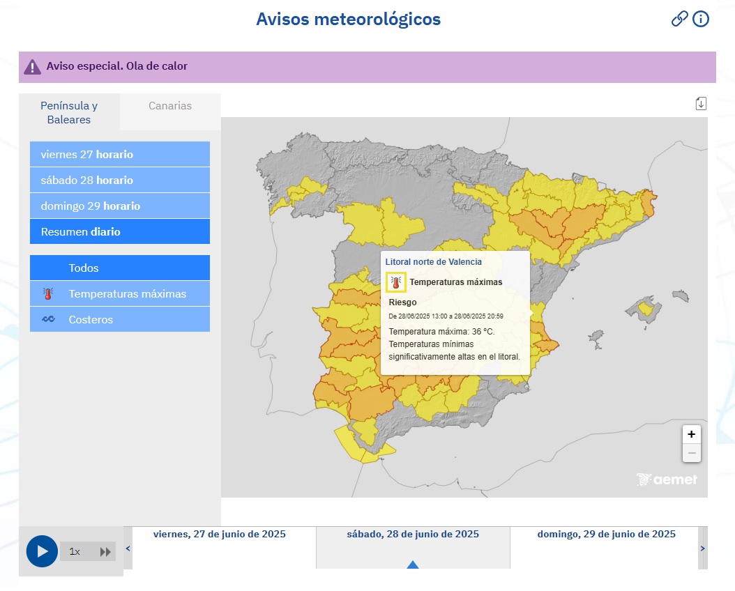 Además, la Agencia Estatal de Meteorología (AEMET) informa de la llegada de una ola de calor que comenzará mañana, sábado 28 de junio, y que, como mínimo, se extenderá hasta el próximo miércoles. Por ello, ha activado los avisos por temperaturas máximas en diferentes puntos del país, entre los que se encuentra el litoral norte de la provincia (clic aquí, aquí, aquí, aquí y aquí).
