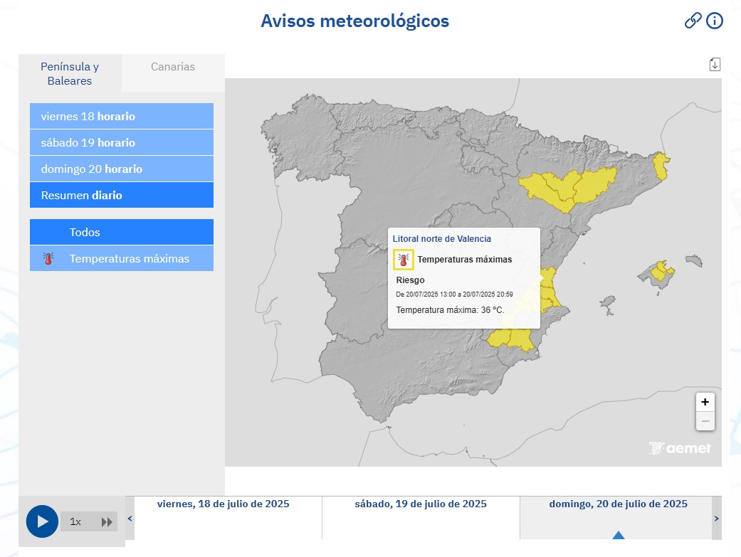 Asimismo, la Agencia Estatal de Meteorología (AEMET) ha establecido el riesgo en nivel amarillo por temperaturas máximas para hoy (clic aquí para ampliar la imagen), mañana (clic aquí) y pasado mañana (clic aquí) en el litoral norte de la provincia.