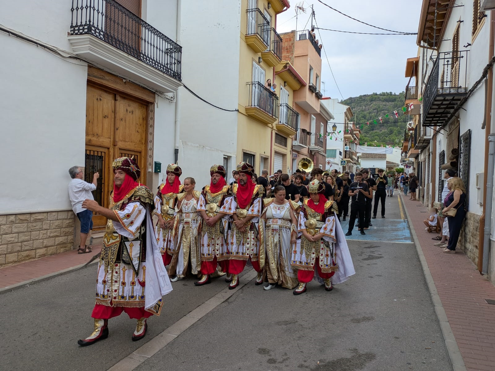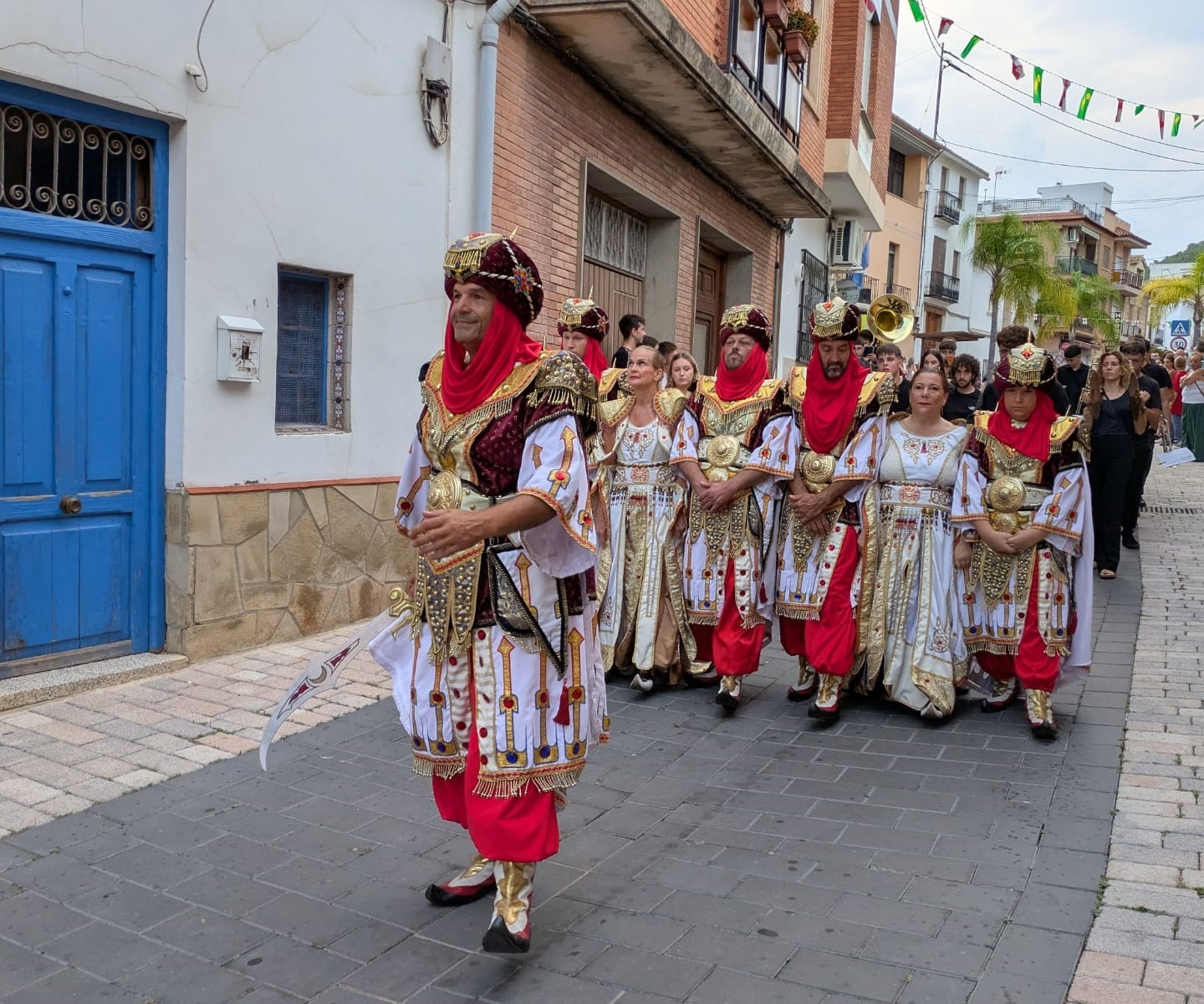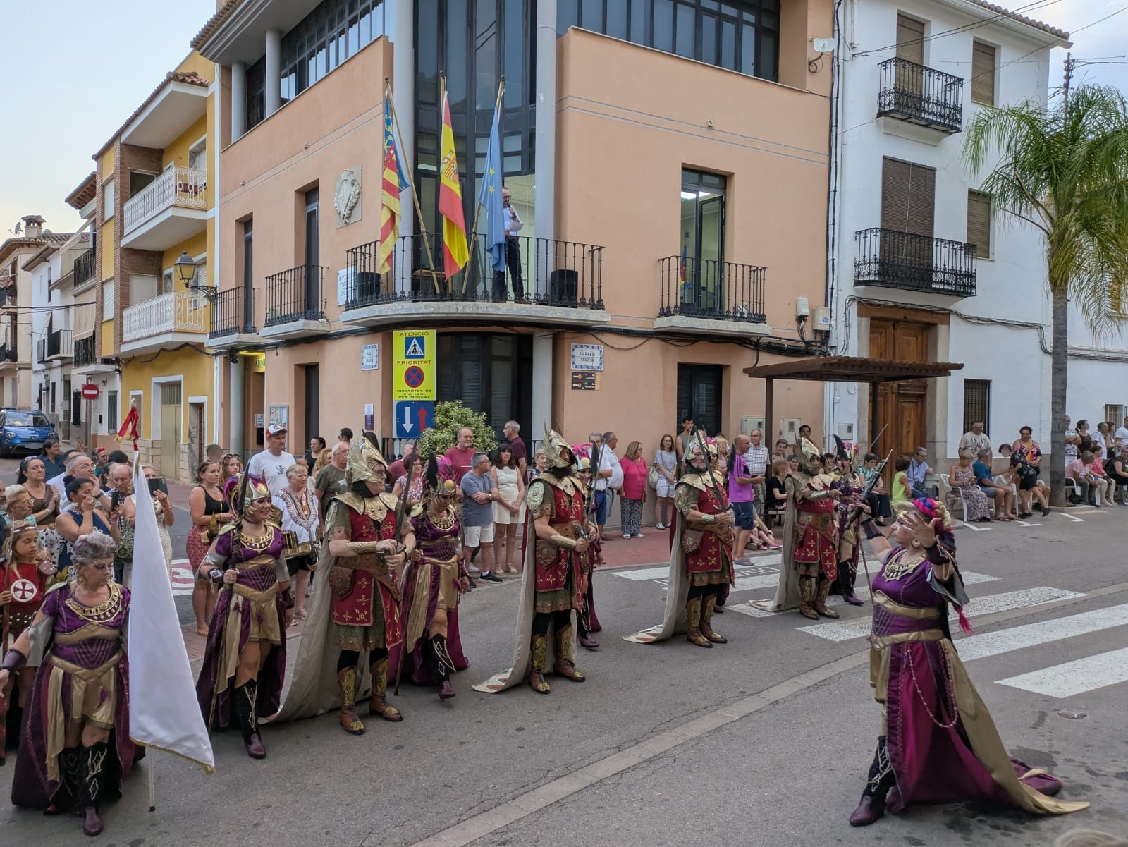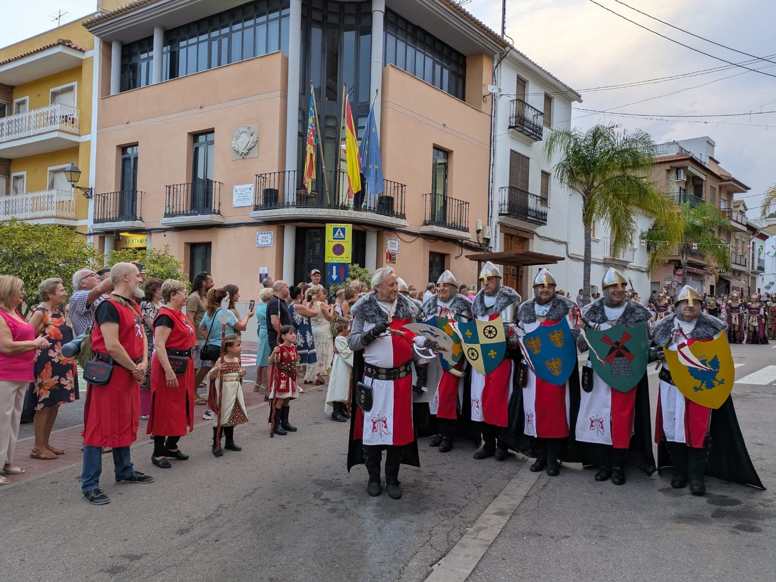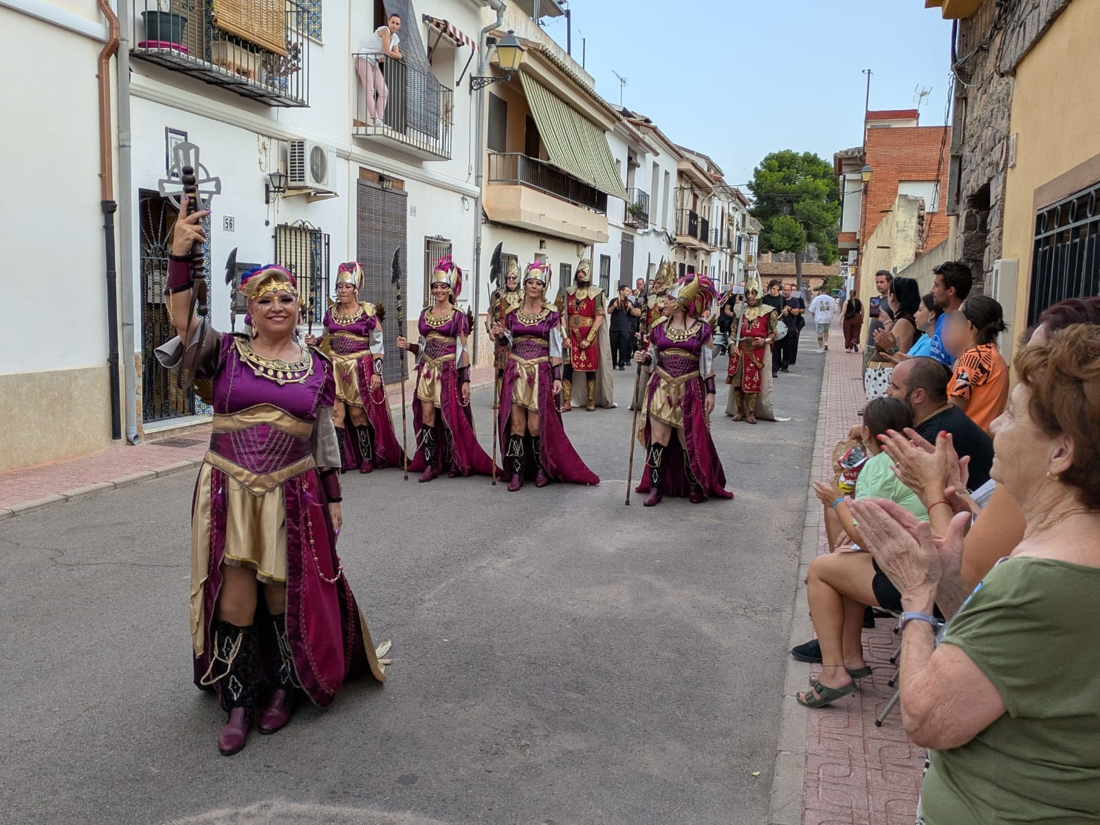 A lo largo del recorrido, que finalizó en la plaza Cervantes, los asistentes pudieron disfrutar de la vistosidad y la belleza de una de las celebraciones más queridas y arraigadas en nuestra tierra. Uno de los momentos más destacados tuvo lugar en la plaza Mayor, donde las comparsas llegaron entre una calurosa ovación del numeroso público allí reunido y con el anuncio por megafonía de cada una de ellas por parte del divulgador y experto en comunicación Javier Peris. En ese momento, saludaron a los concejales Pascual Esteve, Desa Vilaplana, Salvador Navarret, José Paricio y Juan González, y al alcalde, Antonio Ropero, quienes las recibieron delante de la Iglesia de la Virgen del Rosario.