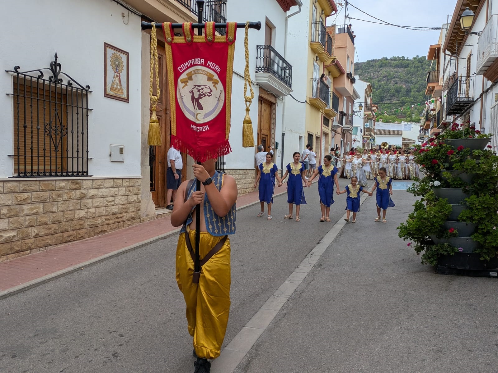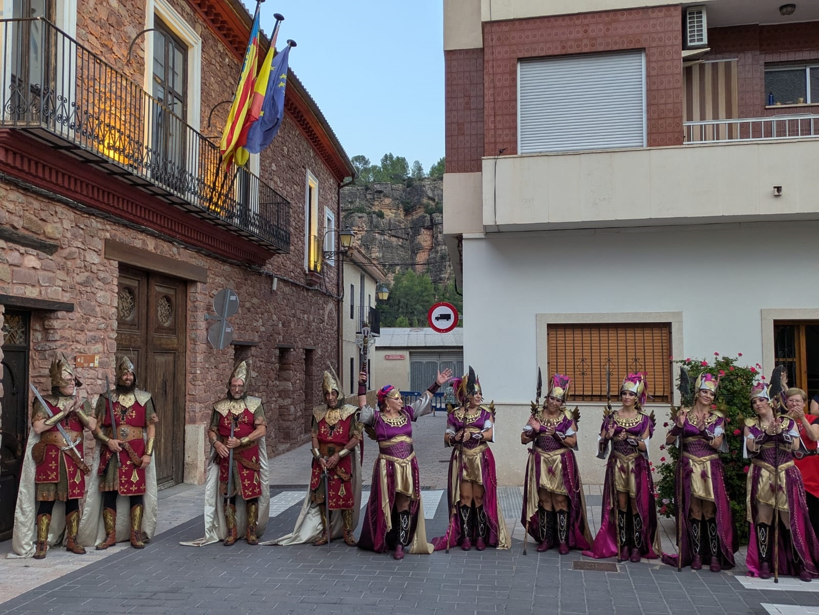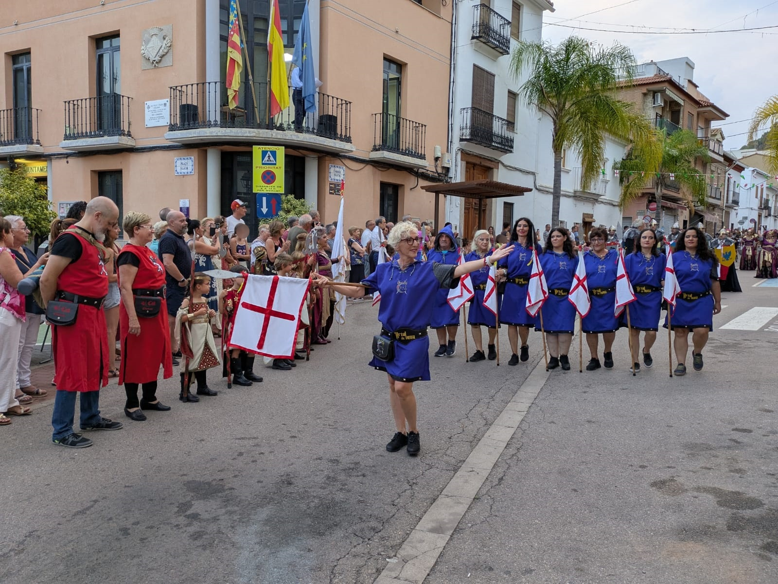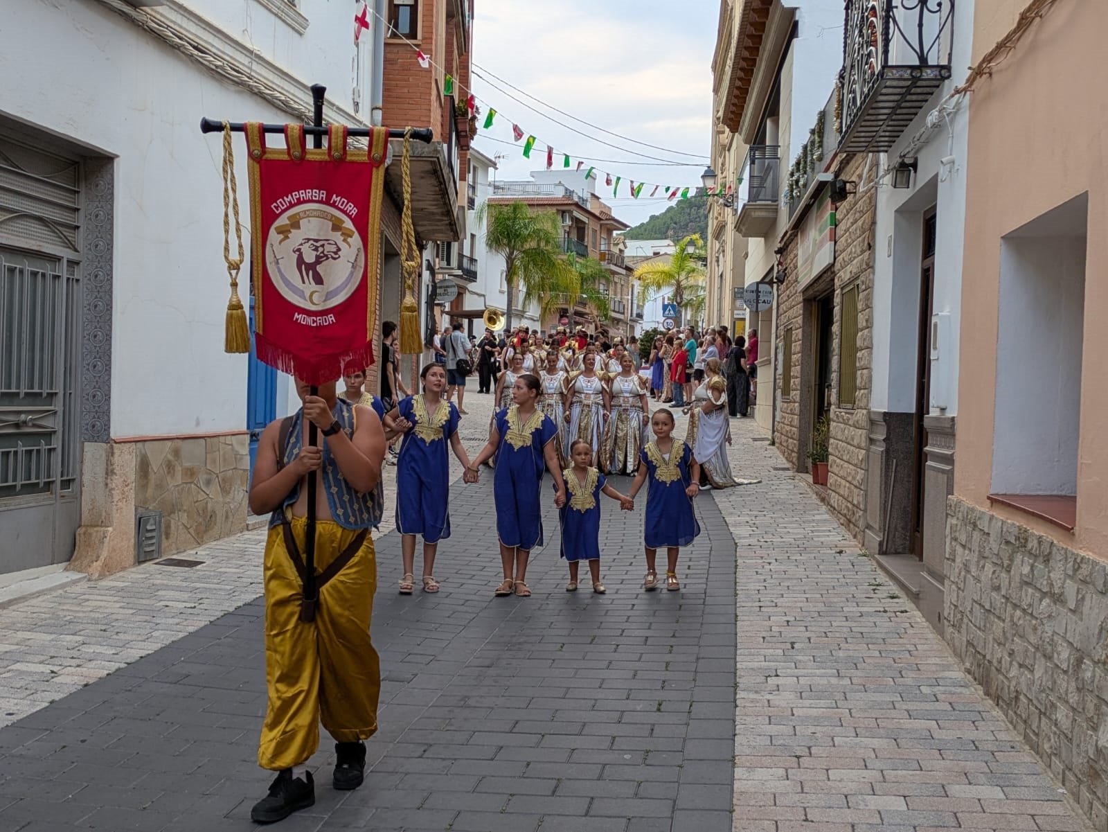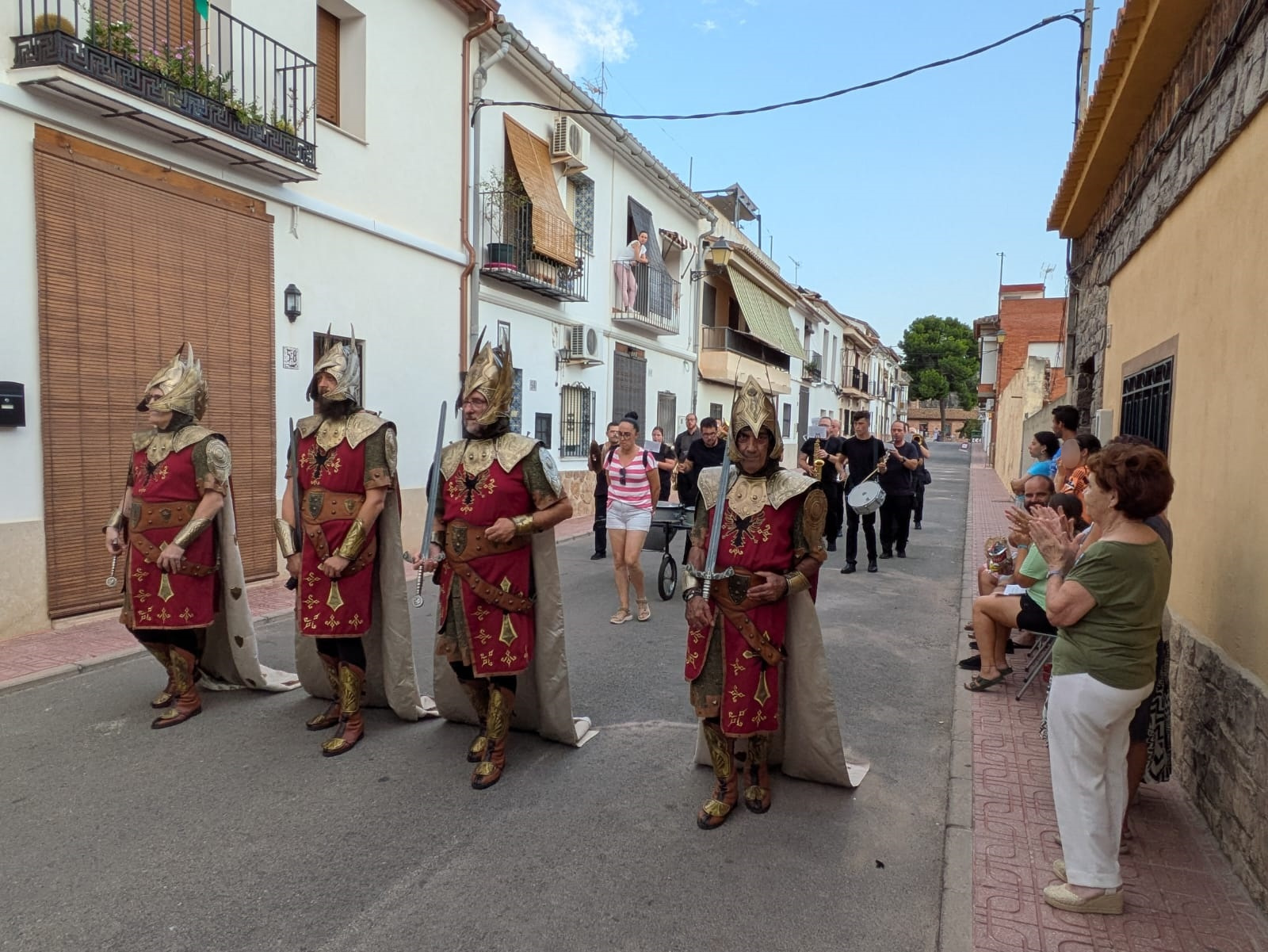 A lo largo del recorrido, que finalizó en la plaza Cervantes, los asistentes pudieron disfrutar de la vistosidad y la belleza de una de las celebraciones más queridas y arraigadas en nuestra tierra. Uno de los momentos más destacados tuvo lugar en la plaza Mayor, donde las comparsas llegaron entre una calurosa ovación del numeroso público allí reunido y con el anuncio por megafonía de cada una de ellas por parte del divulgador y experto en comunicación Javier Peris. En ese momento, saludaron a los concejales Pascual Esteve, Desa Vilaplana, Salvador Navarret, José Paricio y Juan González, y al alcalde, Antonio Ropero, quienes las recibieron delante de la Iglesia de la Virgen del Rosario.
