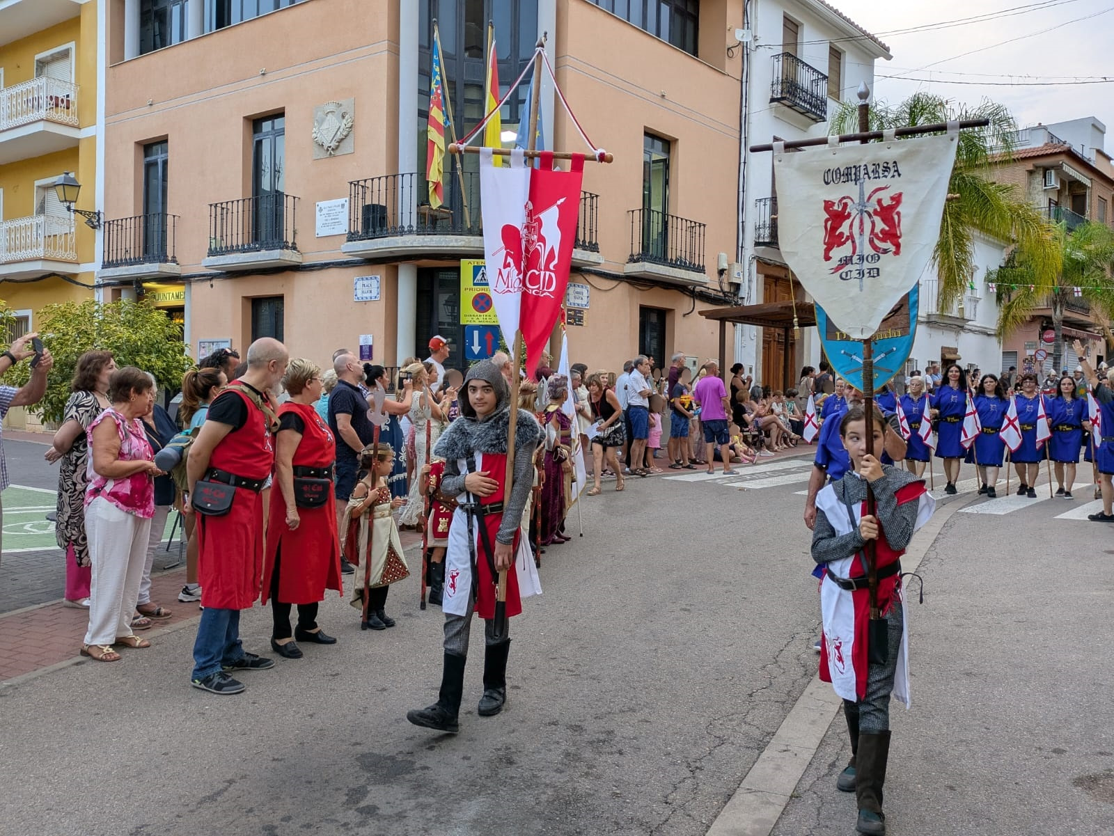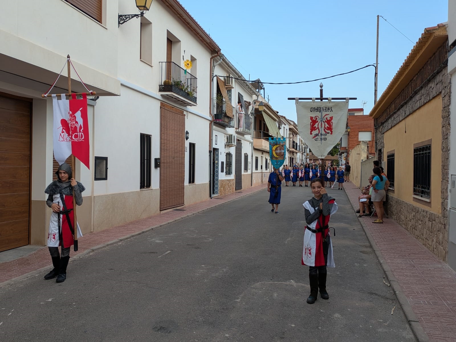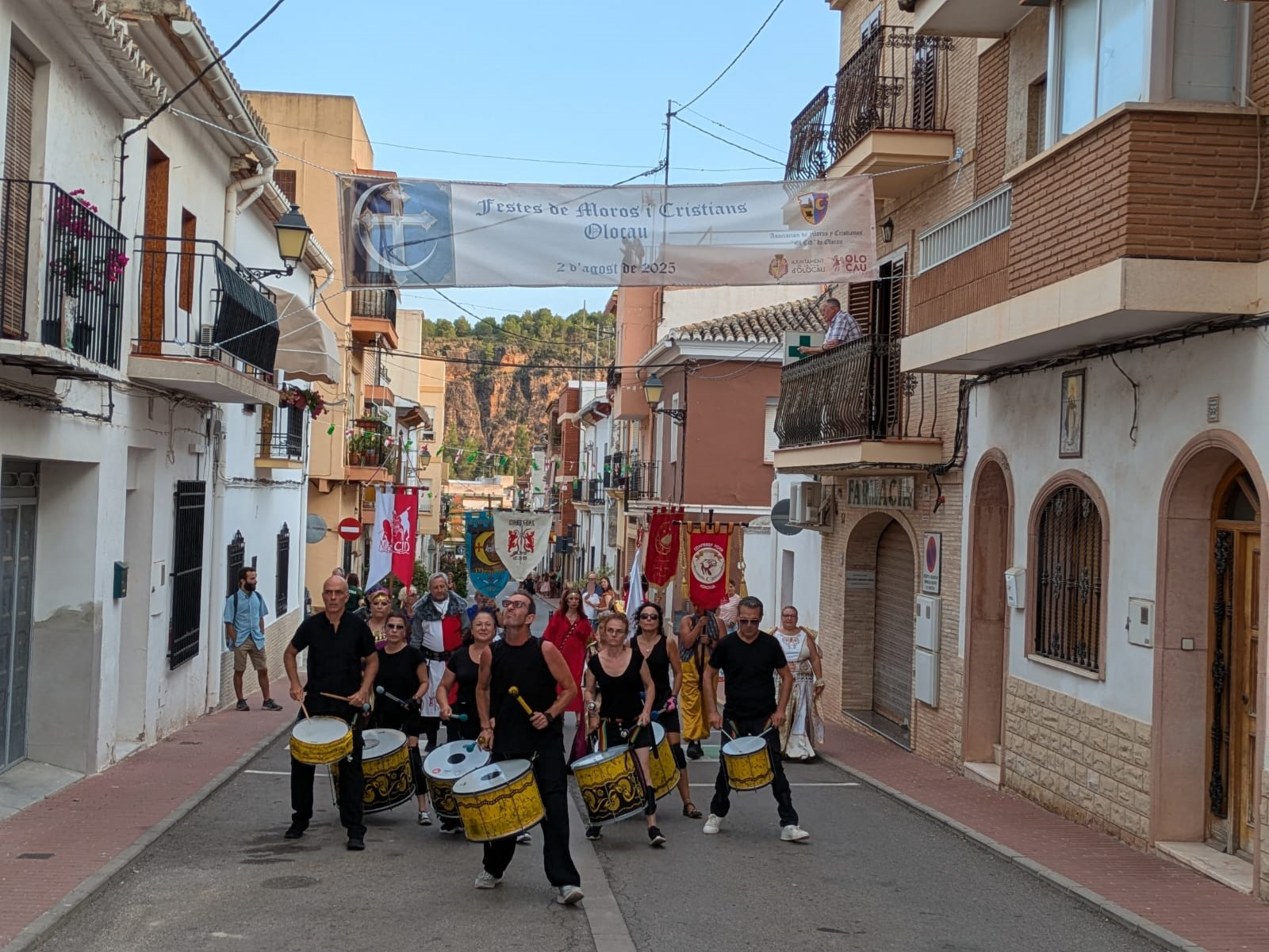 El acto (organizado por la Asociación ‘El Cid’ de Olocau con la financiación de la convocatoria de 2024 de los Presupuestos Participativos del Ayuntamiento y la colaboración de la Diputación de Valencia) arrancó desde la plaza Mayor con la entrada de banderas y estandartes por parte de los cabos de escuadra de las comparsas Almohades (Moncada) y Ben-Amires (Moncada), en representación del bando moro; y El Cid (Olocau), Mío Cid (Valencia) y Artal de Luna (Moncada), del bando cristiano. Además, todos ellos, estuvieron acompañados por la percusión del conjunto local Tambores Percuolo.