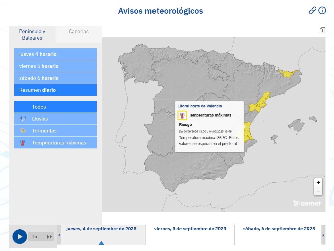 Asimismo, informamos de que la Agencia Estatal de Meteorología (AEMET) ha establecido el riesgo en nivel amarillo por temperaturas máximas (hasta 36 °C), entre las 13 y las 19:59 h, en el litoral norte de la provincia (clic aquí para ampliar la imagen).