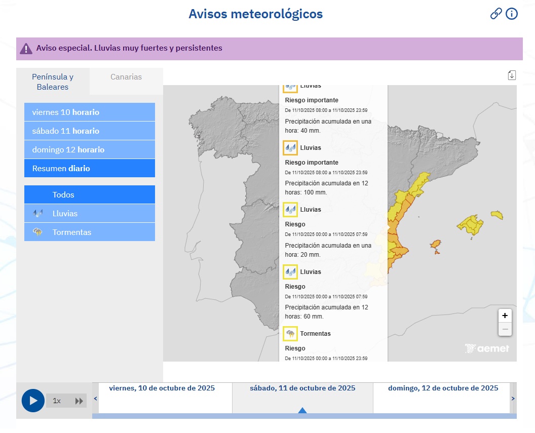 En este sentido la AEMET especifica que habrá nivel naranja (con precipitaciones que podrán alcanzar los 40 litros por metro cuadrado en una hora y los 100 en 12) hasta las 14:59 h de hoy y desde las 8:00 hasta las 23:59 h de mañana; y que, entre las 15:00 de hoy y las 7:59 h de mañana, así como el domingo de 0:00 a 7:59 h, el nivel será amarillo (los acumulados pueden llegar a los 20 litros por metro cuadrado en una hora y a los 60 en 12), con probabilidad de que se produzcan tormentas que vayan acompañadas de rachas de viento muy fuertes.