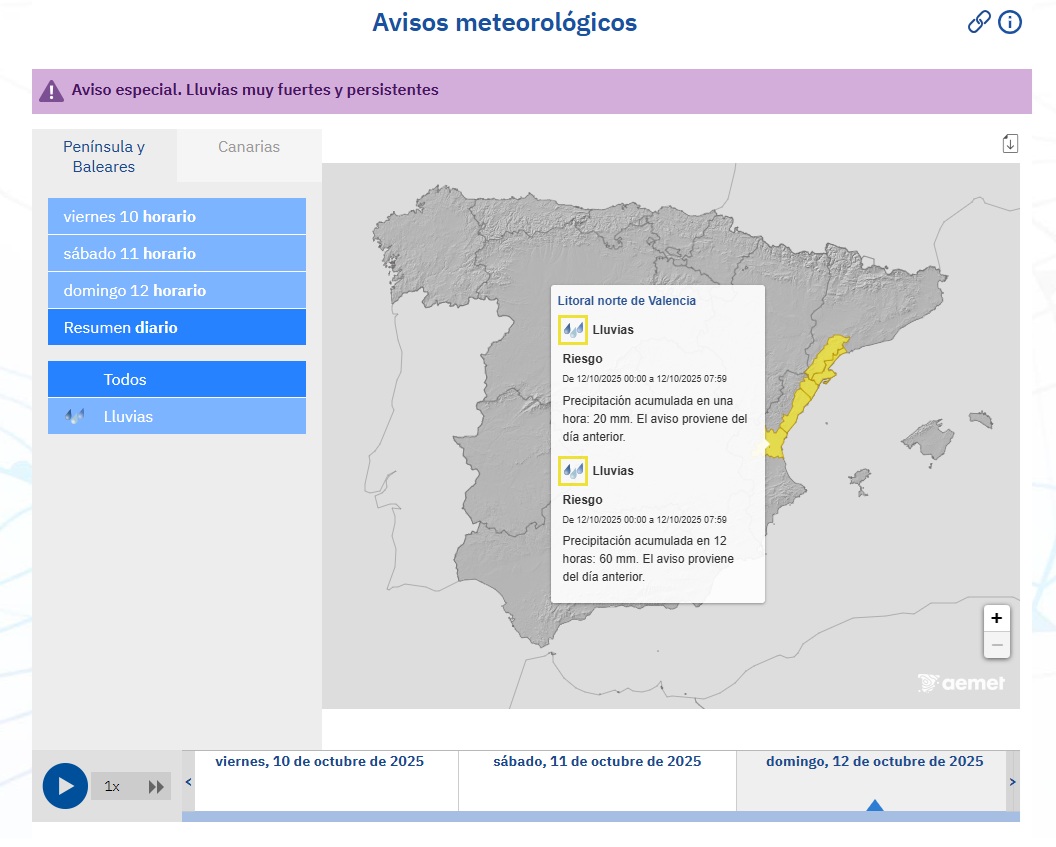 El Ayuntamiento de Olocau informa de que la Agencia Estatal de Meteorología (AEMET) mantiene los avisos por lluvias y tormentas en el litoral norte de la provincia e indica que seguirán activados en las jornadas de mañana y pasado mañana (clic en los siguientes enlaces para ampliar las imágenes: 1, 2, 3).