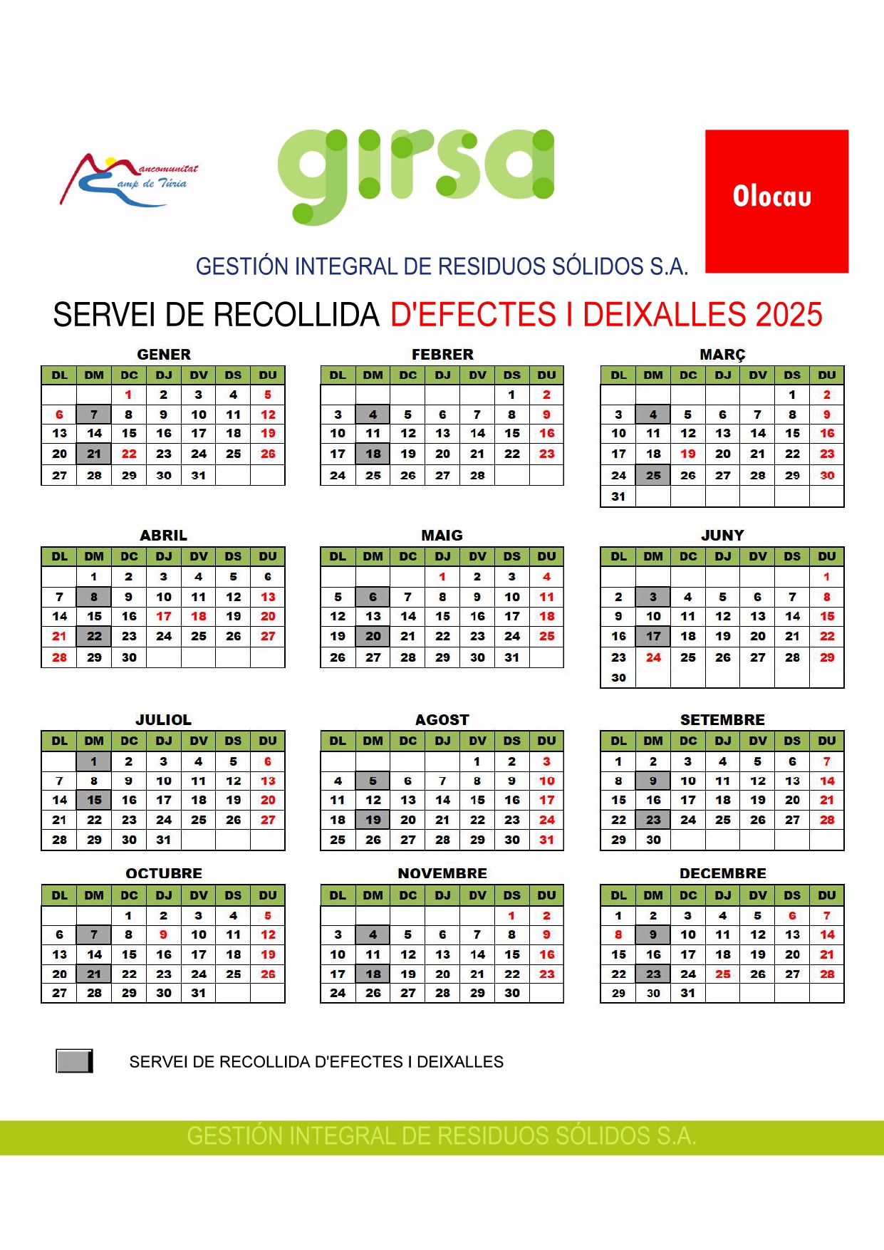 El 4 y el 18 de noviembre serán los días en los que se realizará la recogida de voluminosos (trastos, enseres, muebles y artículos). Para solicitar este servicio, se debe avisar al Ayuntamiento de manera presencial en Recepción, mediante el número de teléfono 96 270 30 11, a través de la dirección de correo electrónico recepcion@olocau.es o rellenando el formulario de la página web municipal (apartado Servicios Municipales: clic aquí). Las solicitudes se programan el viernes anterior a cada recogida a las 13:00 horas, por lo que, si la petición se realiza posteriormente, será programada para la siguiente fecha disponible. La cantidad máxima de objetos que se pueden retirar es de 5 bultos (clic aquí para ver el calendario).