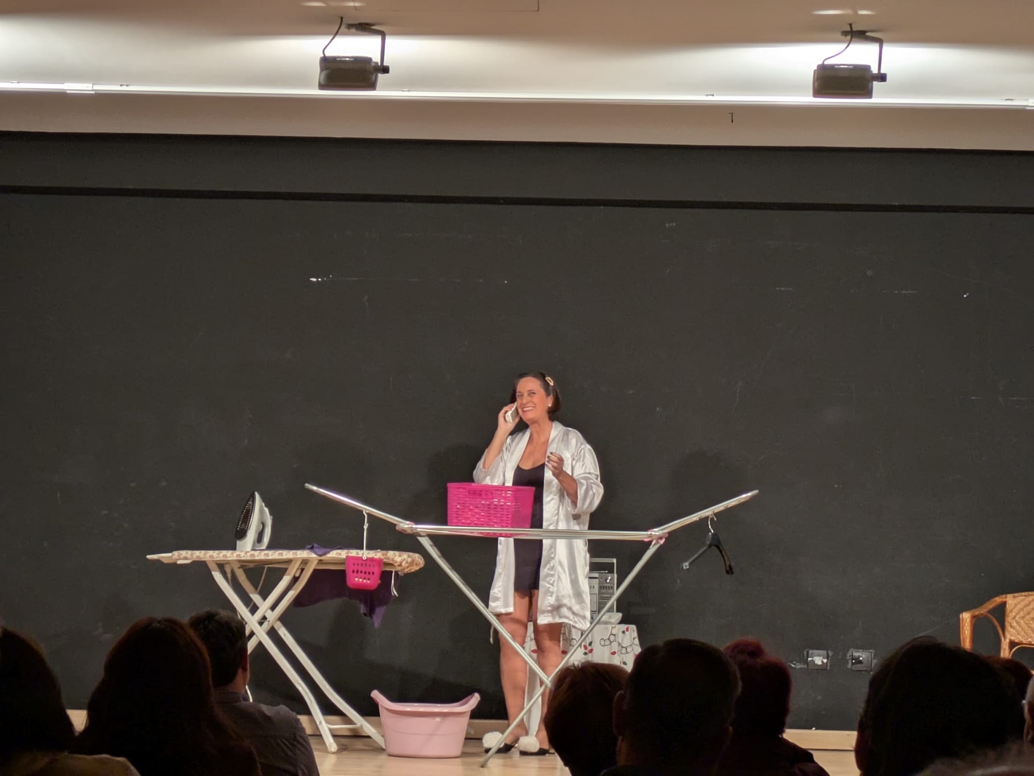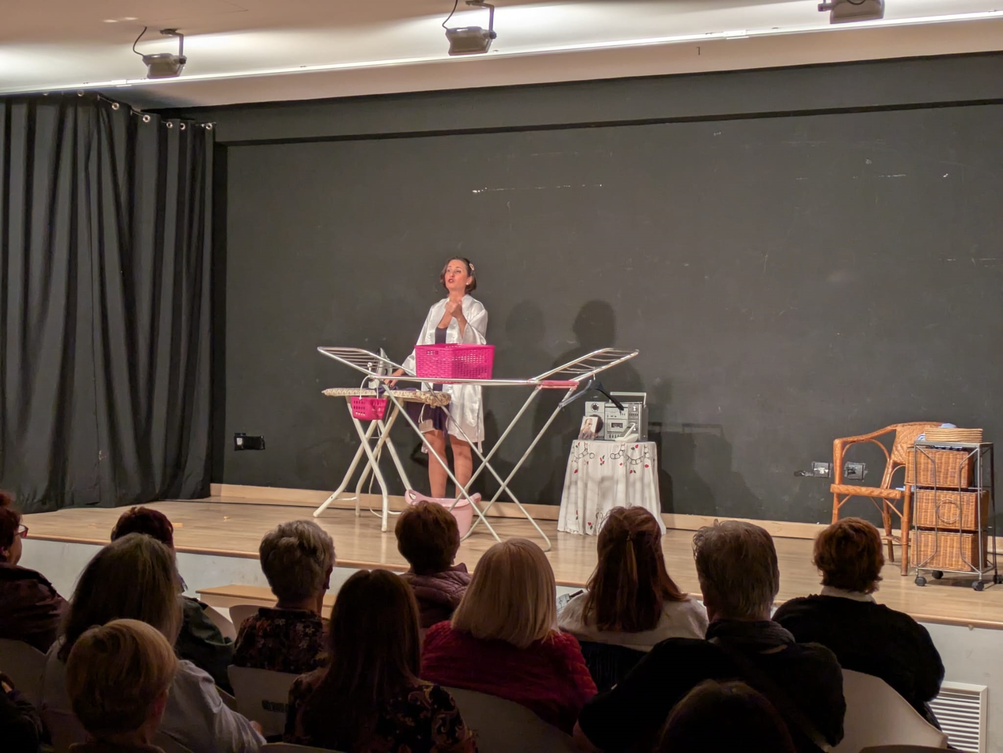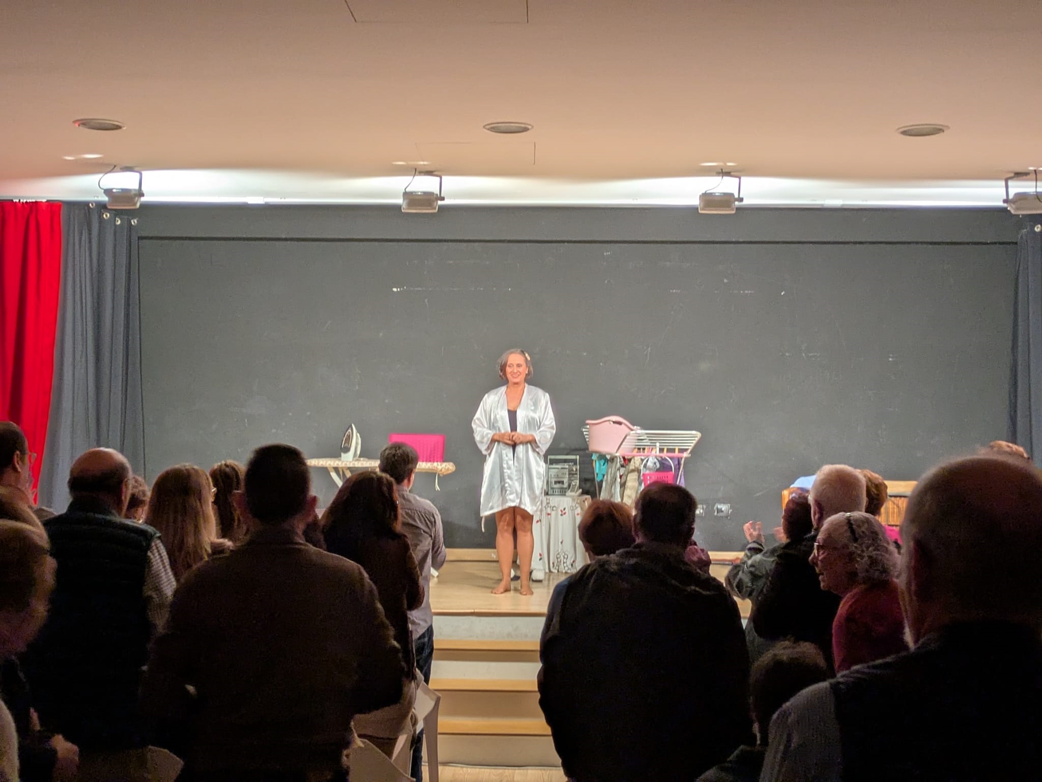 A continuación, comenzó una representación que, a través de la ironía, la crítica y el drama presenta la vida de María (interpretada por la actriz Pilar Rochina), una mujer que vive en una situación de soledad, asfixia y represión a causa de su marido y otros miembros de su familia. El texto, adaptación del monólogo homónimo escrito por el Premio Nobel Dario Fo y Franca Rame, retrata una dura realidad marcada por el maltrato físico y psicológico, la ausencia de libertad, el dolor y la vejación, y muestra cómo la protagonista recurre a la imaginación y los recuerdos como válvula de escape para evadirse del miedo, la resignación, la depresión y la tristeza que sufre como consecuencia de su terrible día a día.
