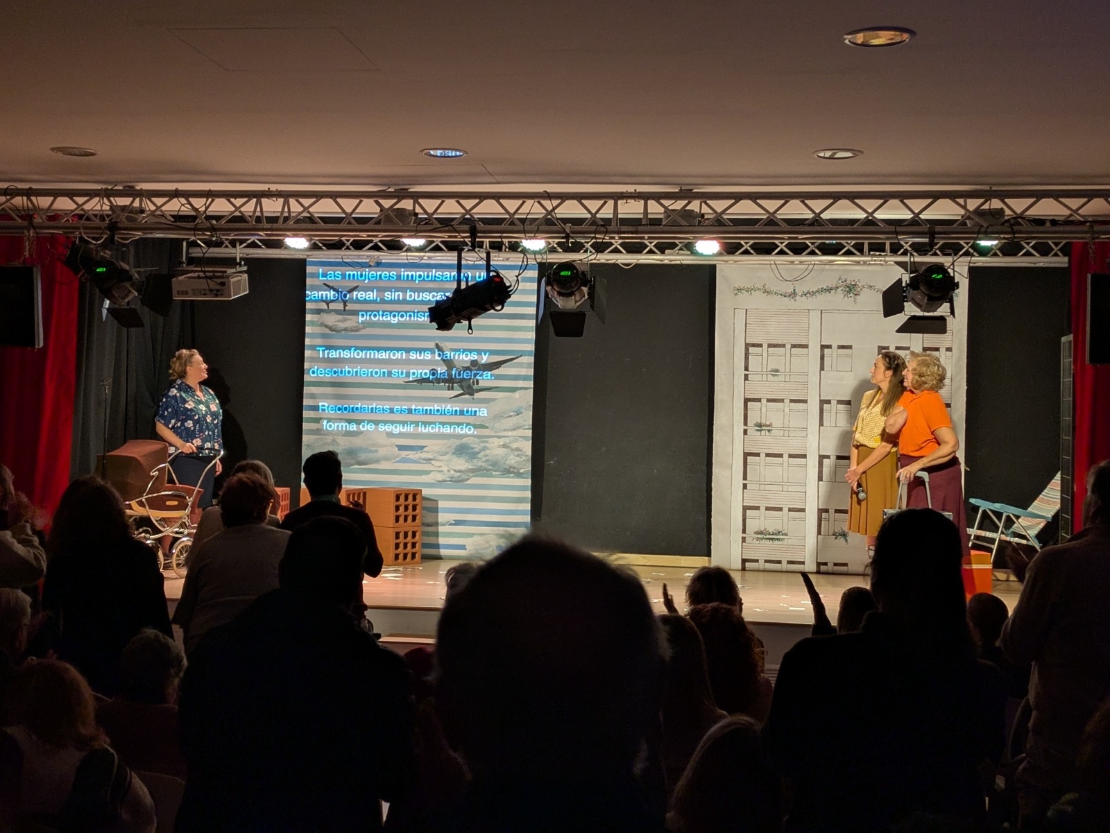 De esta manera, los allí presentes disfrutaron de una función —escrita y dirigida por Reyes Ruiz y producida por la compañía de teatro Patio de Vecinas y la empresa de gestión cultural Frescultura— que unió comedia y memoria, y que recordó a todas aquellas mujeres anónimas que, desde el esfuerzo, la valentía y el amor incondicional a sus raíces y a sus seres queridos, encabezaron las luchas vecinales en nuestro país al mismo tiempo que cuidaban de sus hogares y de sus hijos e hijas.