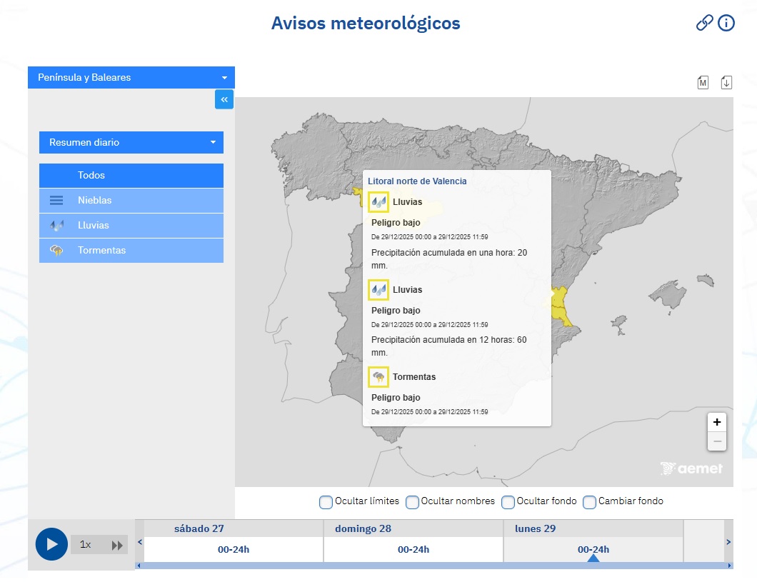 El Ayuntamiento de Olocau informa de que la Agencia Estatal de Meteorología (AEMET)ha establecido el riesgo en nivel naranja para mañana y amarillo para pasado mañana por lluvias y tormentas en el litoral norte de la provincia.