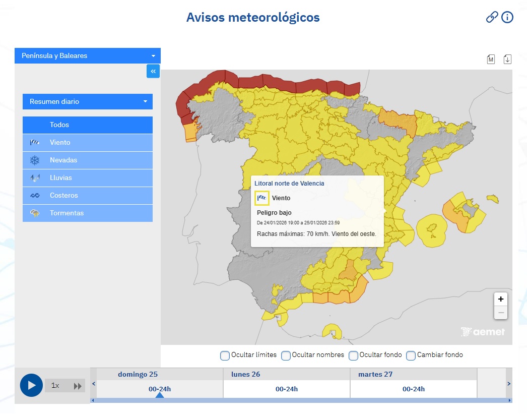 Además, la Agencia Estatal de Meteorología (AEMET), mantiene activo hasta las 23:59 h el aviso de nivel amarillo por viento (con rachas de componente oeste que podrán alcanzar los 70 km/h.) en el litoral norte de la provincia (clic aquí para ampliar la imagen).