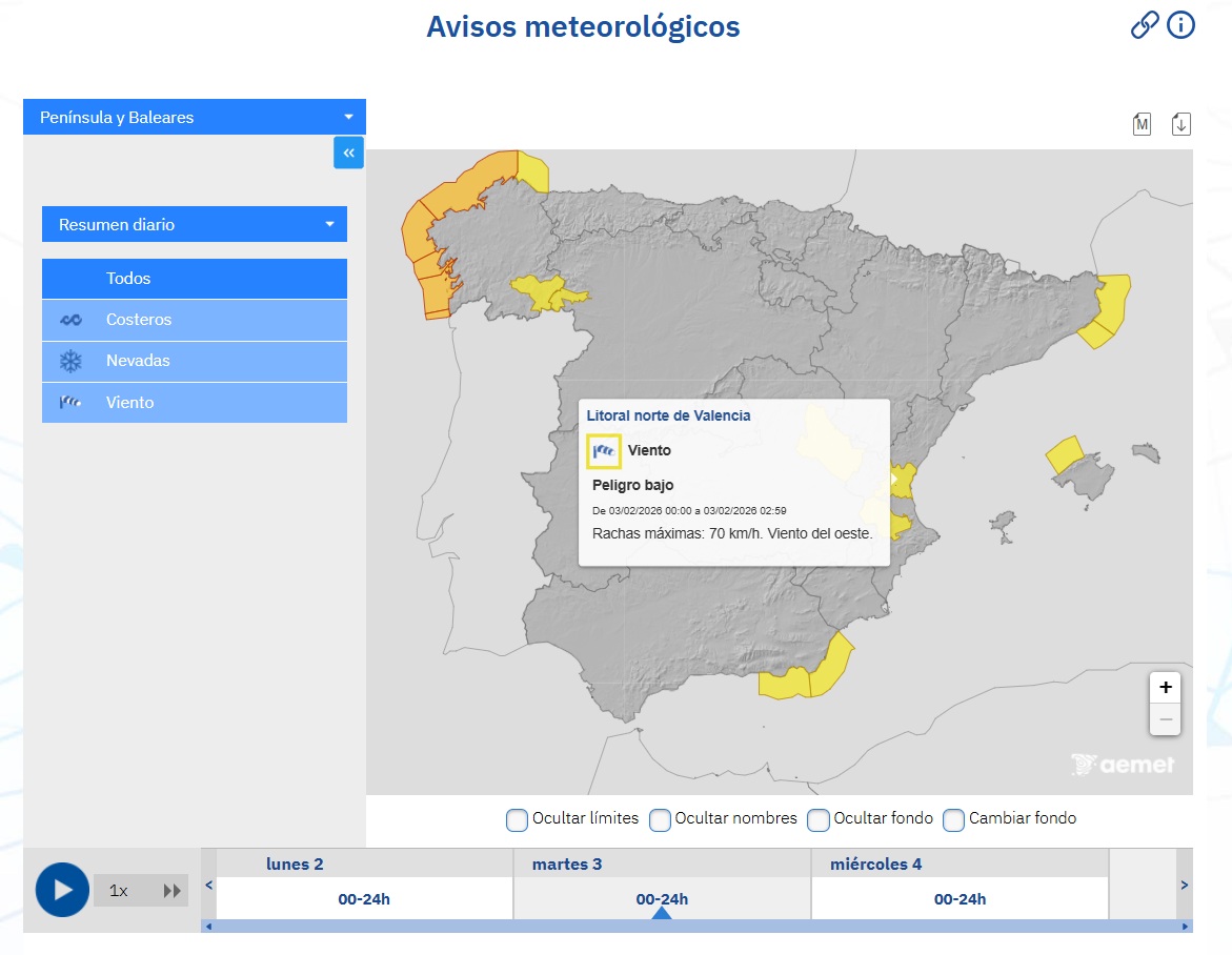 Desde el Ayuntamiento, informamos de que la Agencia Estatal de Meteorología (AEMET) ha establecido el riesgo en nivel amarillo por viento en el litoral norte de la provincia para hoy y mañana. Concretamente, los avisos son por rachas de componente oeste que podrán alcanzar los 70 km/h, y estarán activos desde las 18:00 de hoy hasta las 2:59 h de mañana (clic aquí y aquí para ampliar).