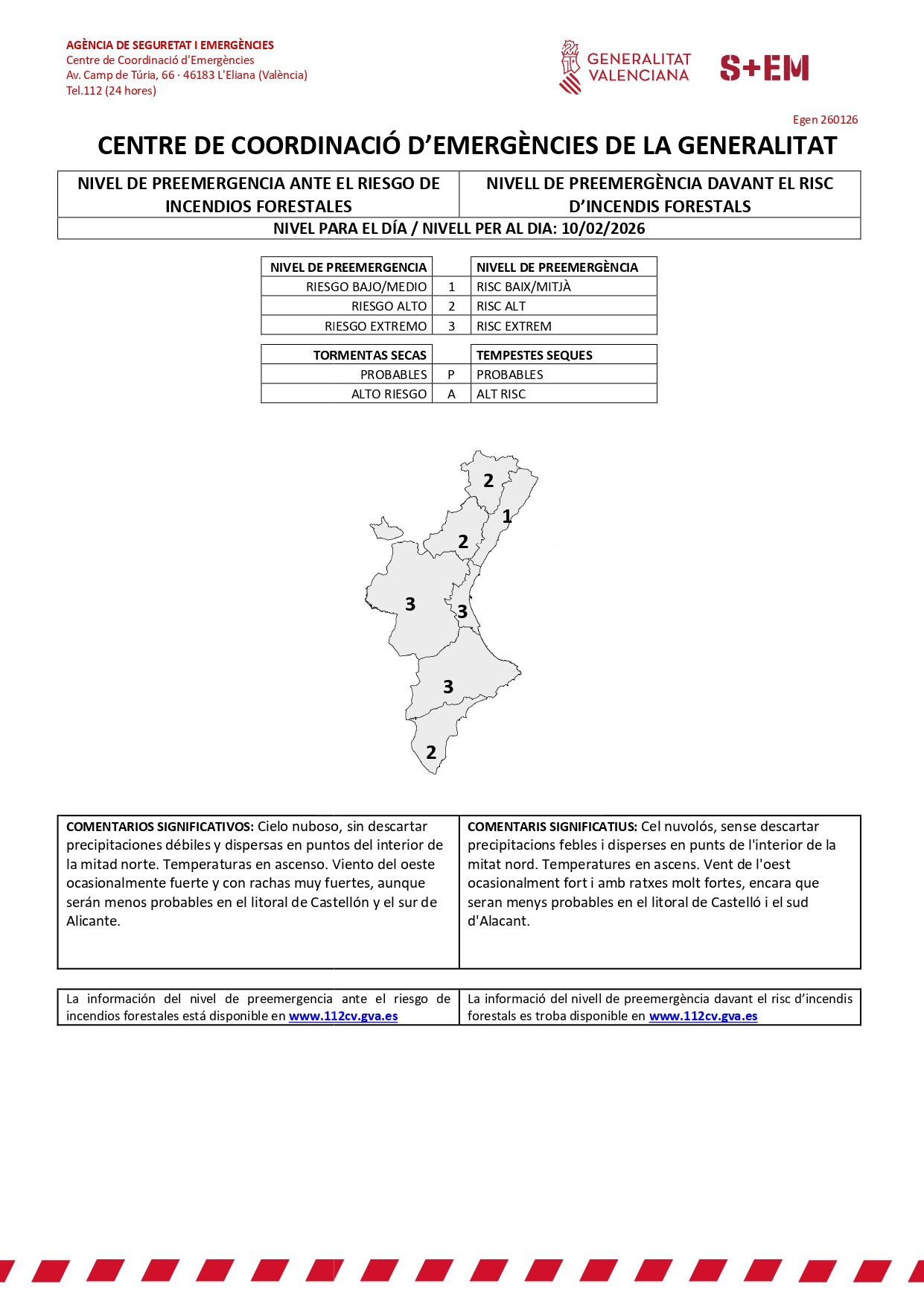 Asimismo, ante esta situación, el Centro de Coordinación de Emergencias de la Generalitat ha elevado a "extremo" el nivel de preemergencia por riesgo de incendios forestales durante el día de hoy (clic aquí para ampliar la imagen).