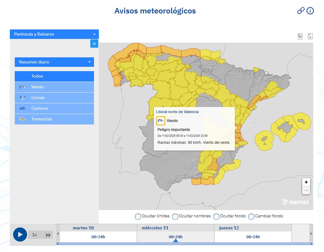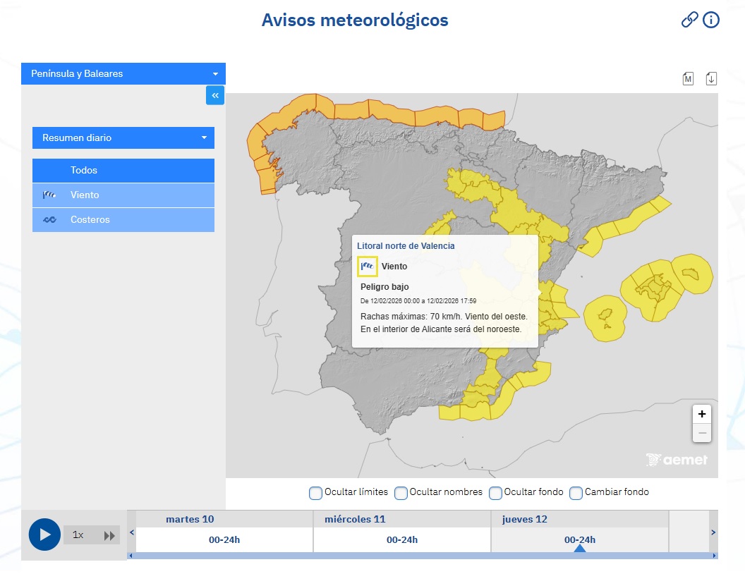 Informamos de que la Agencia Estatal de Meteorología (AEMET) ha establecido el riesgo en nivel naranja y amarillo por viento en el litoral norte de la provincia para las jornadas de hoy, mañana y pasado mañana. Concretamente, los avisos son por rachas de componente oeste y estarán activos desde las 12:00 h de hoy hasta las 23:59 h de mañana (nivel naranja; hasta 90 km/h) y desde las 00:00 h hasta las 17:59 h de pasado mañana (nivel amarillo: hasta 70 km/h). Clic en los siguientes enlaces para ampliar las imágenes: 1, 2, 3
