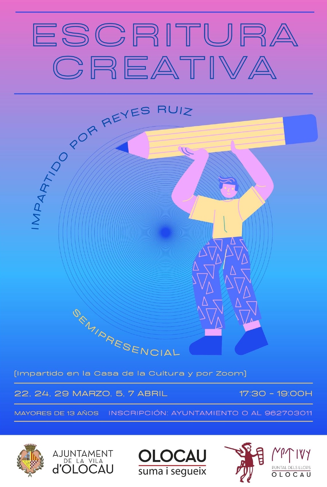 Se llevará a cabo los días 22, 24 y 29 de marzo, y 5 y 7 de abril, de 17:30 a 19:00 horas y se realizará en modalidad semipresencial en la Casa de la Cultura y por Zoom. El taller está dirigido a personas mayores de 13 años y las inscripciones se pueden realizar en el Ayuntamiento o por teléfono mediante el número 96 270 30 11. Habrá un límite de 15 plazas.