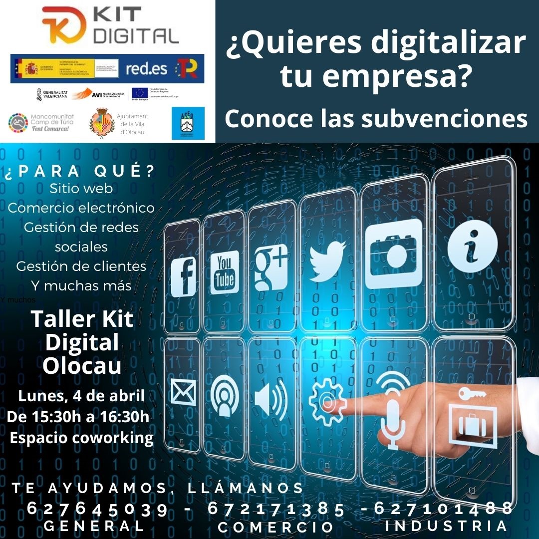 El Ayuntamiento de Olocau informa de que, el próximo lunes, 4 de abril, entre las 15:30 y las 16:30 horas, tendrá lugar en el Espacio Coworking una jornada informativa sobre las ayudas que se ofrecen a través del programa Kit Digital para el impulso de la digitalización de empresas de menos de 50 empleados.